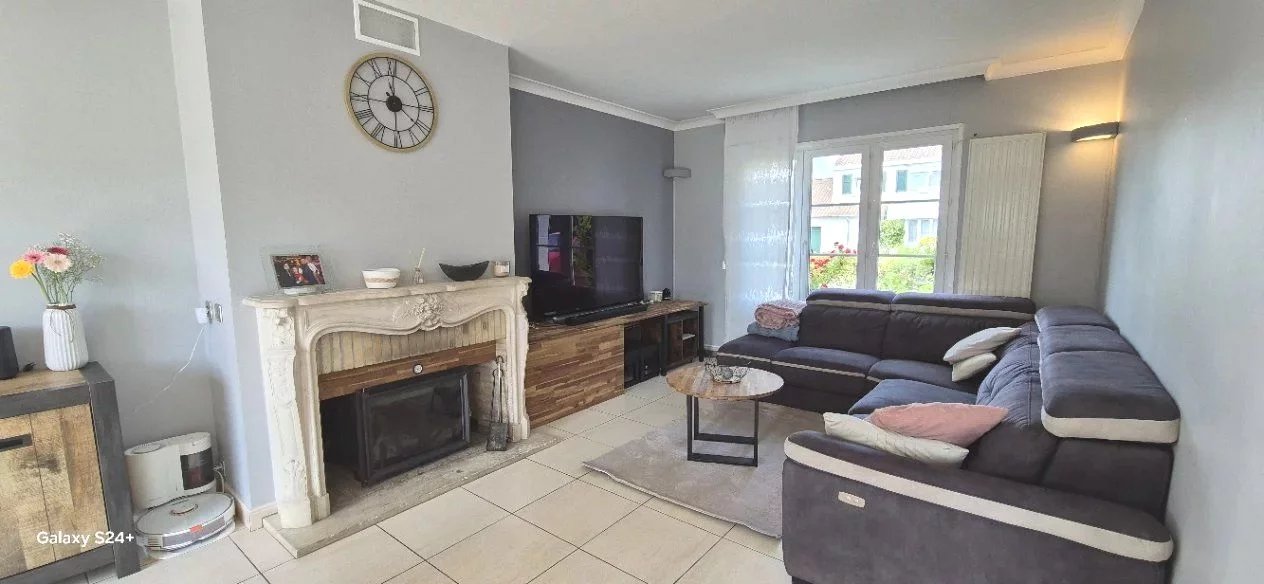 Elle est composée d'un hall d'entrée avec espace vestiaire et wc, d'un séjour en L de plus de 36 m2 agrémenté d'une insert au bois branché sur le système de chauffage central, particulièrement lumineux grâce à deux baies vitrées donnant sur le jardin, d'une cuisine équipée soignée et actuelle et d'un espace buanderie de 12.3m2.