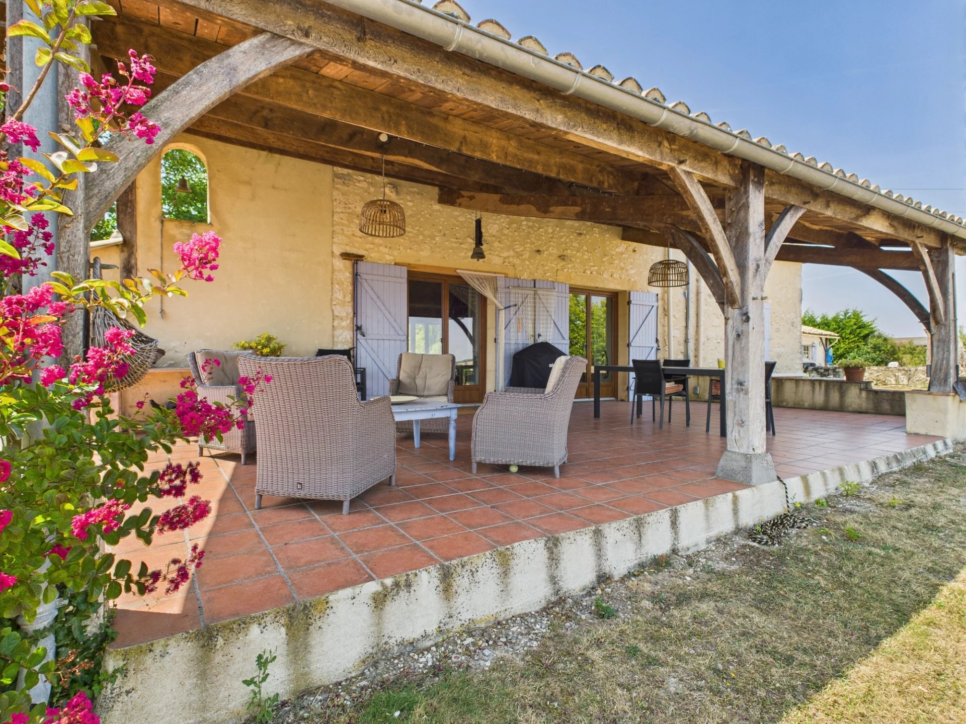 Cette magnifique maison en pierre, située dans un endroit calme, au pied de la Bastide, offre des vues à couper le souffle ! Vous entrez dans la maison, en passant par une terrasse couverte, qui vous mène à la cuisine entièrement équipée. Vous arrivez ensuite dans un grand salon/salle à manger avec deux portes fenêtre donnant sur une merveilleuse terrasse sur laquelle vous pouvez manger ou vous asseoir pour prendre un verre en admirant la vue. La maison principale dispose de 3 chambres, dont une au rez-de-chaussée avec sa propre salle de douche et 2 autres chambres à l'étage, dont une avec une salle de douche attenante. Il y a aussi un espace idéal pour un bureau à l'étage. A l'extérieur se trouve une maison d'amis qui dispose d'une petite kitchenette et d'un espace de vie ainsi que d'une salle d'eau au rez de chaussée. La chambre se trouve en mezzanine à l'étage. La maison d'amis possède sa propre terrasse privative (possibilité d'exploitation d'un gîte - sous réserve de l'obtention des autorisations nécessaires). Le tout est complété par une piscine avec terrasse en travertin, un abri pour 2 voitures et un espace de rangement. Venez découvrir ce charmant ensemble sans attendre! Prix honoraires inclus : 372 500 € Prix honoraires exclus : 351 416 € Honoraires de 6% TTC à charge acquéreur