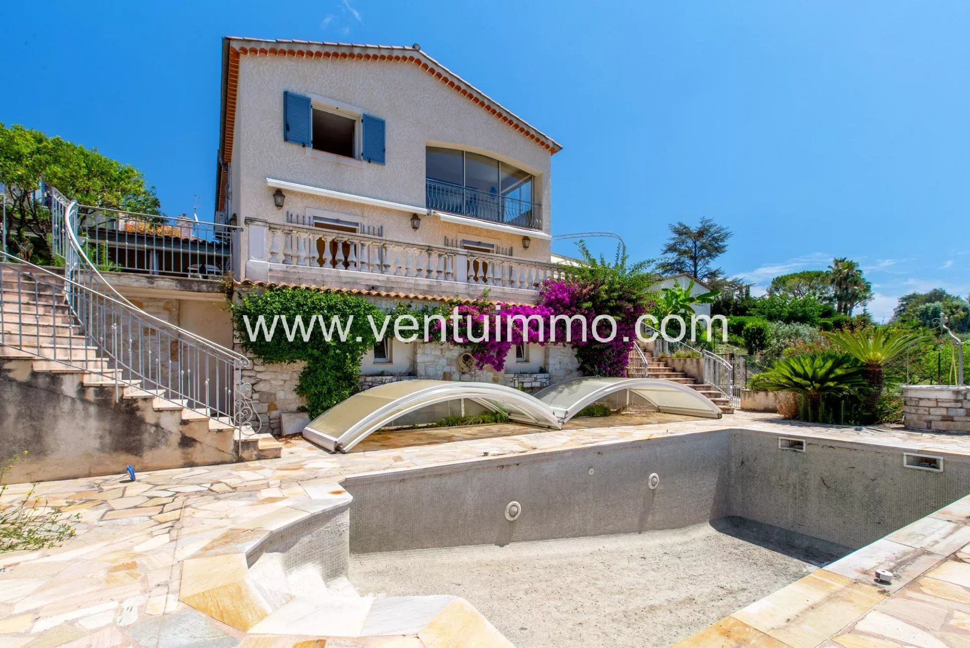 SAINT-PAUL-DE-VENCE : Dans un environnement résidentiel calme et verdoyant, jolie villa familiale d'une surface de 350 m² (dont 181 m² Loi Carrez), élevée sur trois niveaux, avec un beau terrain de 1311 m². À réaménager à son goût, elle offre actuellement une entrée, grand séjour et cuisine indépendante, 4 chambres avec placards ou dressings et 5 salles de bains ou douche, un bureau, et de nombreuses pièces de rangements, sans oublier un grand sous-sol et deux garages. Vous apprécierez son ensoleillement et sa superbe vue panoramique sur les collines. Les informations sur les risques auxquels ce bien est exposé sont disponibles sur le site Géorisques : georisques.gouv.fr