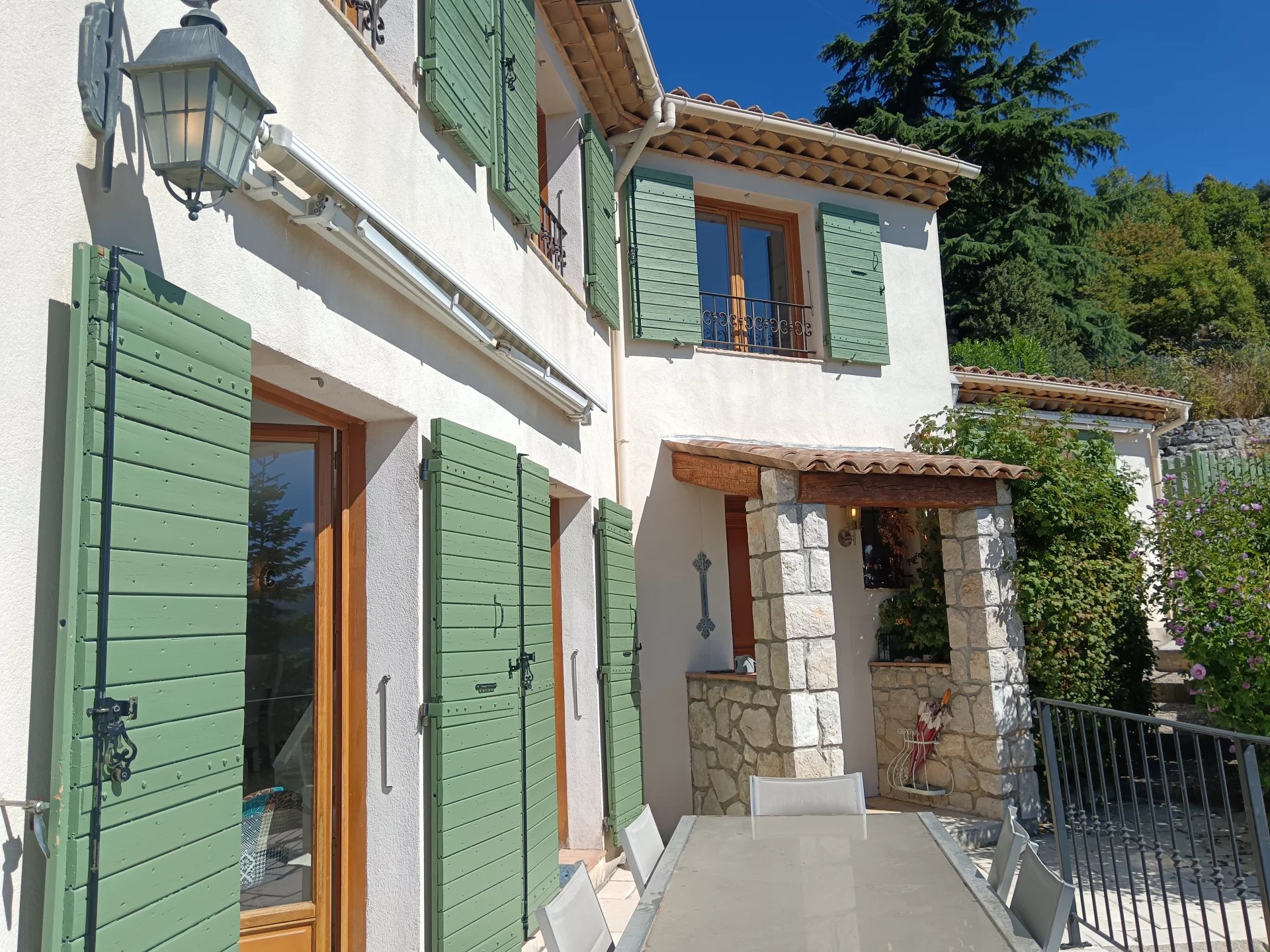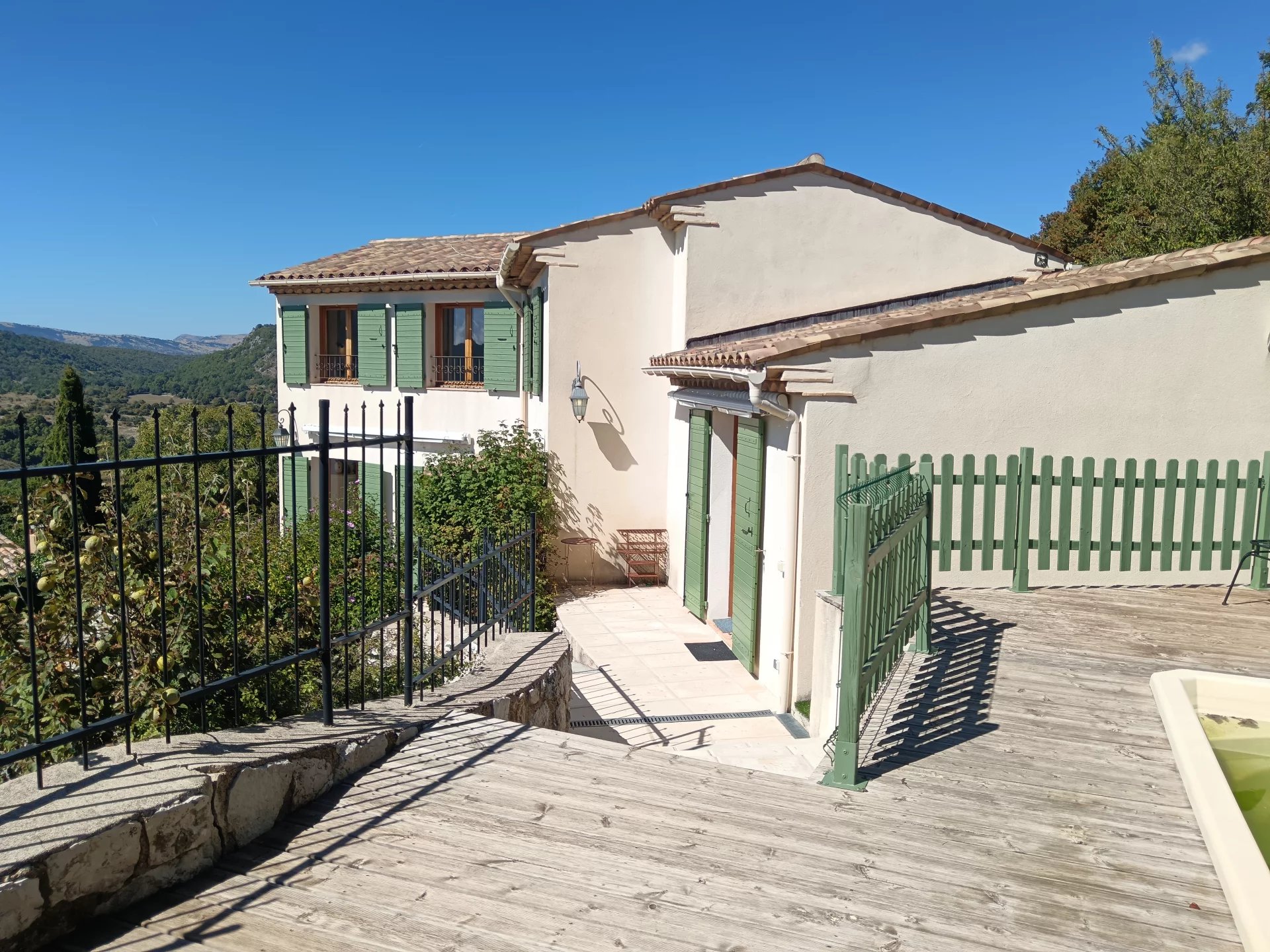 La maison est située à 20mn seulement de Vence, à Coursegoules au cœur des Préalpes d'azur. Elle bénéficie des vues uniques sur la nature omniprésente. Le village possède épicerie/ boulangerie/ bus/ restaurants/ marché...etc... tout ce qui est nécessaire pour une vie quotidienne ! Très belle villa de 112m2 composée d'un étage sur rez de chaussée. La maison est en parfait état, pas de travaux à prévoir et peut être vendue meublée. Au rez de chaussée se trouvent le vaste séjour avec sa cheminée avec insert de type " norvégien" qui chauffe parfaitement bien la maison et un espace cuisine avec son coin repas. Un couloir mène à une chambre doté de son accès vers le jardin,, grand placard/penderie et sa salle de bains (double vasque) et un wc séparé. A l'étage un vaste palier peut être utilisé en bureau / chambre /salle de jeux / salon TV ... 2 chambres avec placards/penderies et une salle de douche avec toilettes. De très belles vues sur la nature de toutes les pièces, parquets dans les chambres. En sous sol: une cave/buanderie et vide sanitaire. Petite piscine coque d'environ 2.40mx4m avec sa pompe neuve pour se baigner en profitant de la vue extraordinaire sur la nature. L'extérieur est composé de terrasses, de l'espace piscine, du coin parking (2 voitures possible) La maison est en excellent état, elle est très confortable et chaleureuse. Il fait bon y vivre ! Son mode de chauffage est très performant et suffisant. Des radiateurs "chauffe serviettes" sont installés dans les salles de bains. Cependant présence de bons radiateurs électriques si on ne souhaite pas allumer le poêle. La plupart des fenêtres sont oscillo-battantes. Rare !