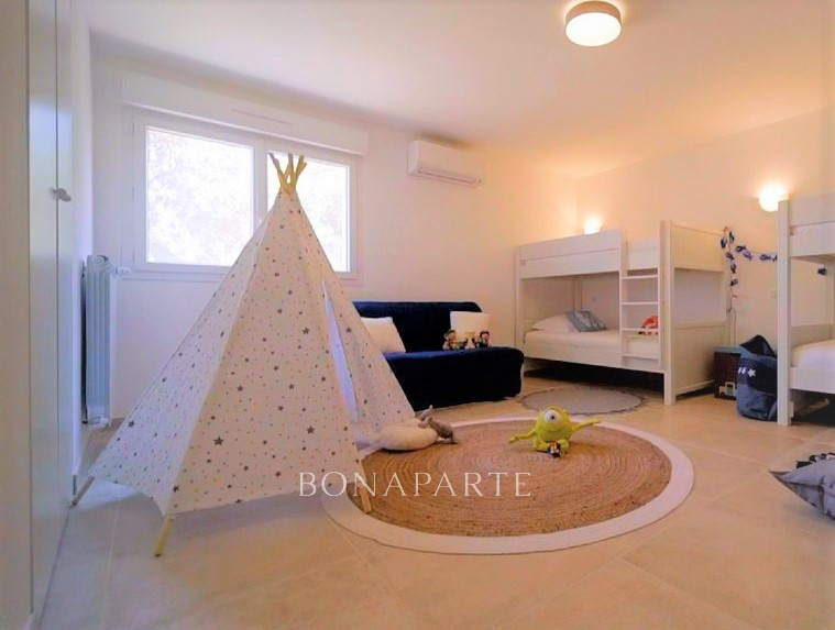 Une suite parentale à l'étage avec vue panoramique sur la mer, une chambre au rez-de-chaussée donnant sur terrasse, deux autres chambres sur jardin, ainsi qu'un bureau.