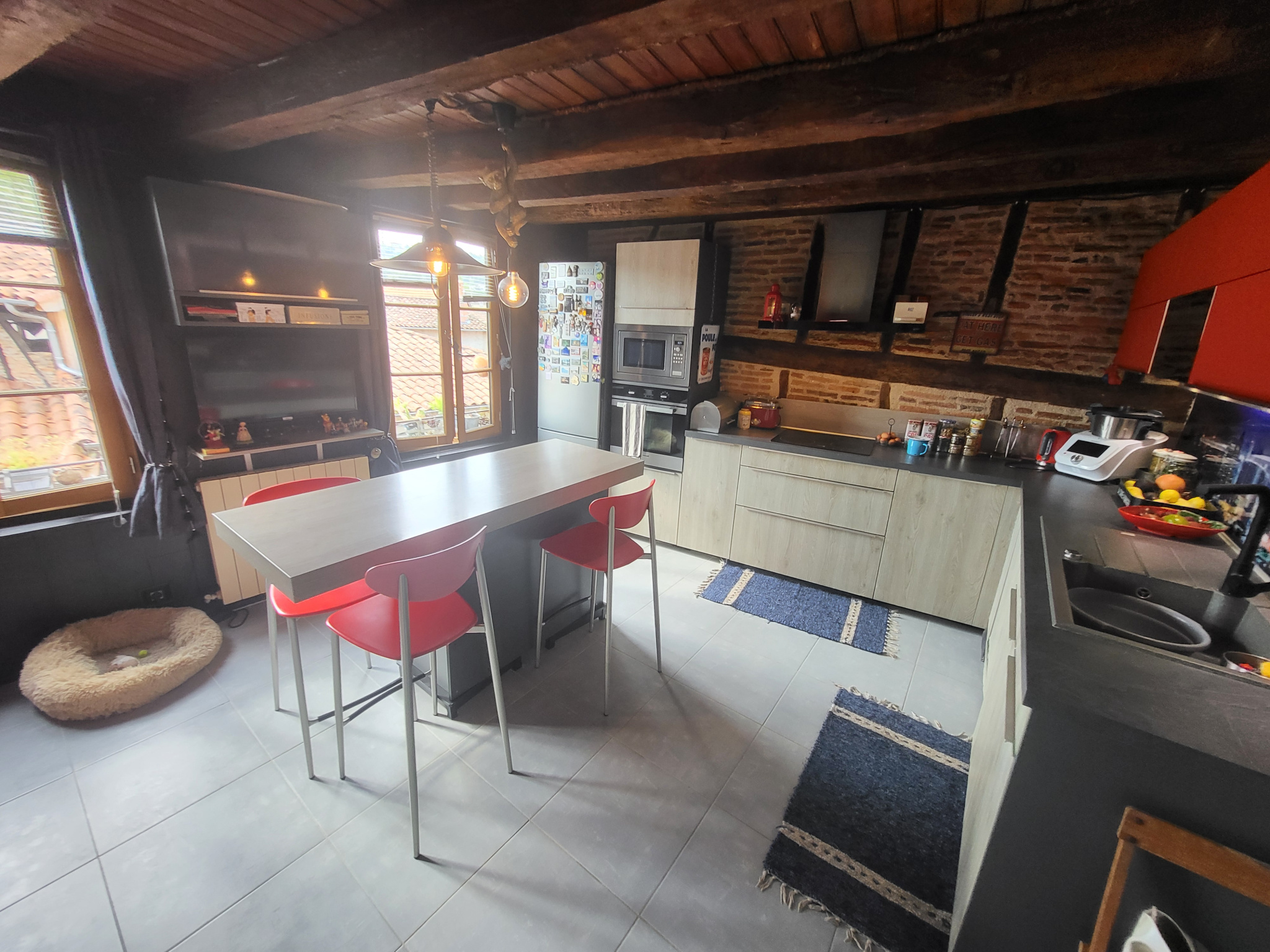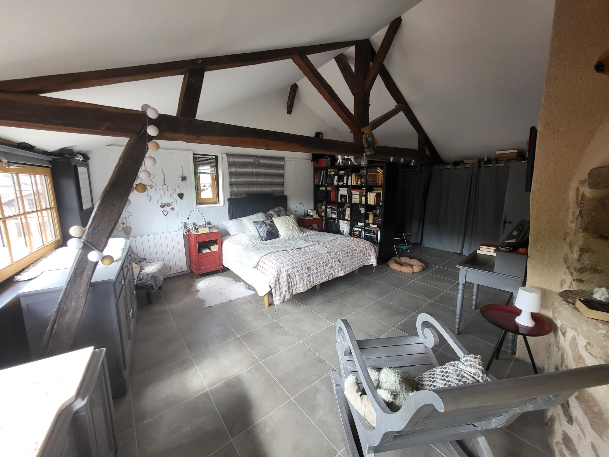 Le grand logement est composée d'une grande entrée desservant l'étage et les caves. Salon-séjour avec poutres, briquettes et pierres apparentes, cuisine séparée aménagée et équipée, salle d'eau, wc indépendant et une grande chambre au premier niveau. Au deuxième niveau, un joli patio, deux belles chambres mansardées dont une avec dressing et une salle de bain.