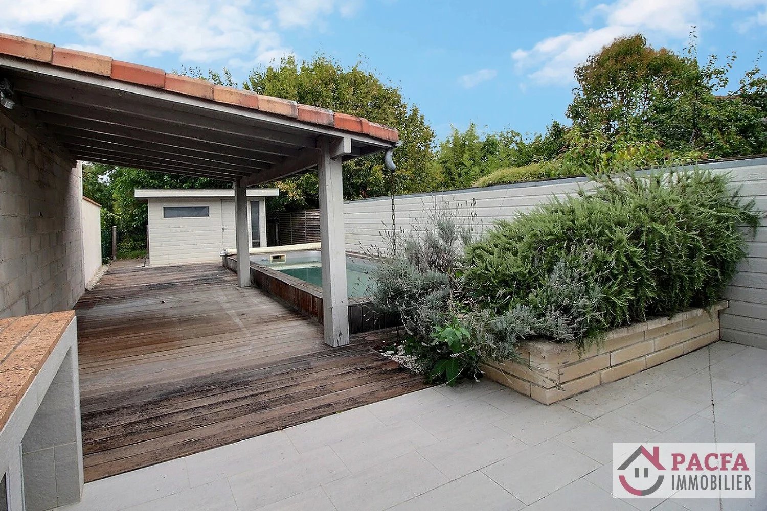 Avec ses 108m² habitables et son jardin arboré de 430m² clos avec piscine, cette maison offre un cadre de vie chaleureux et pratique.