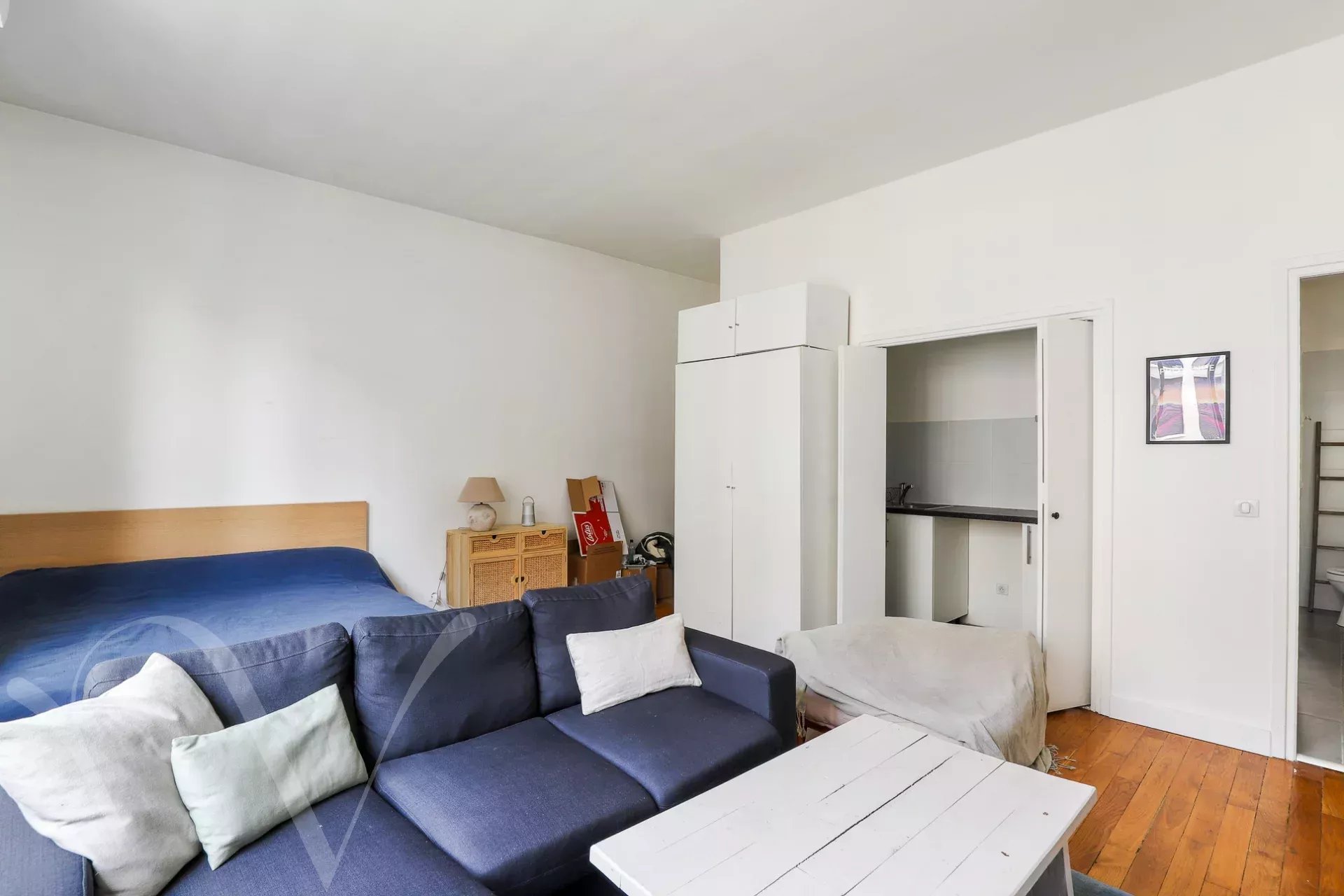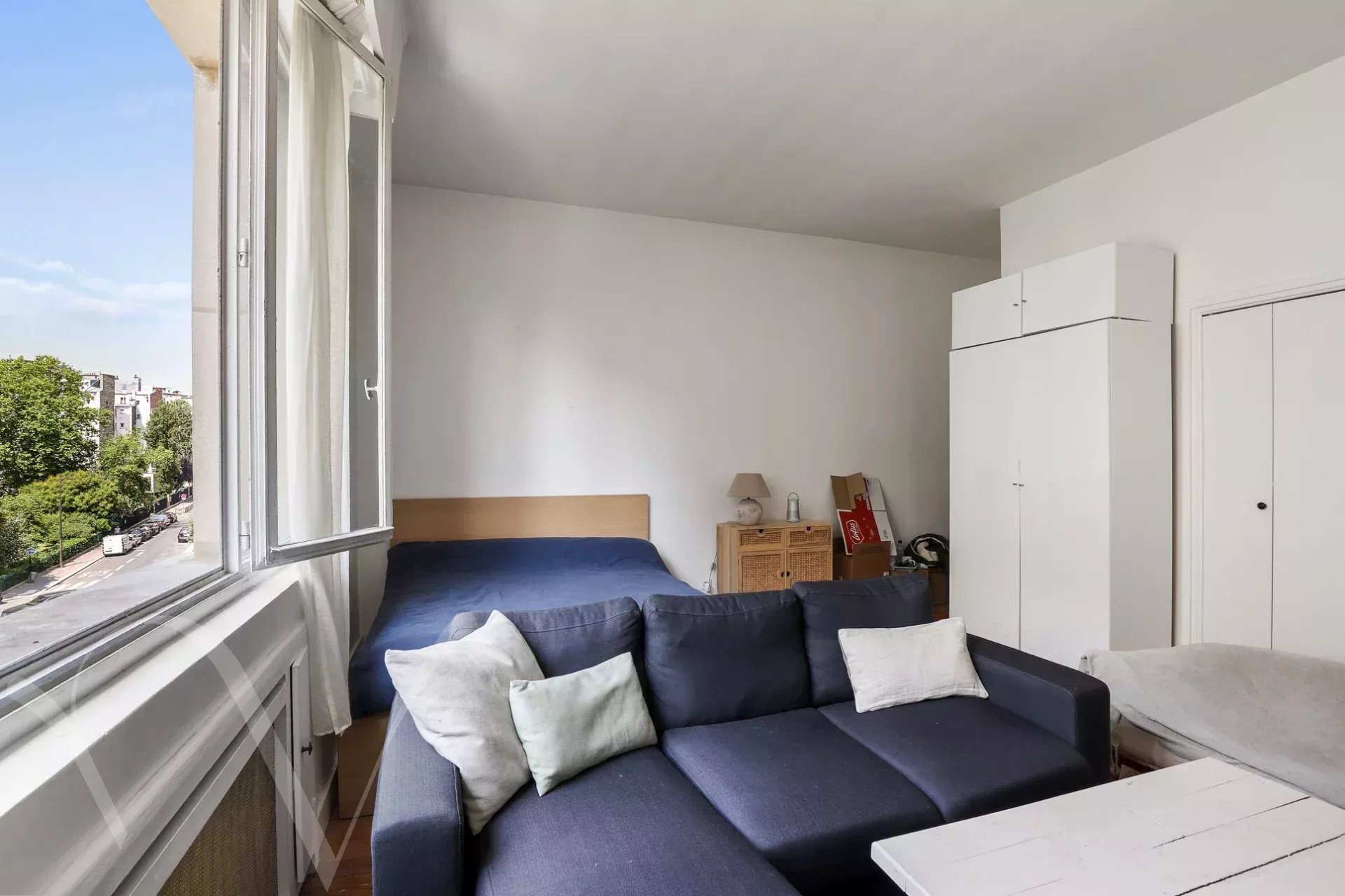 Exclusivité - Dans le quartier d'Auteuil, à quelques pas du métro Jasmin et du métro Ranelagh, dans un ancien hôtel particulier élevé en 1930 un studio de 35 m² (33.73 m² loi Carrez) au 3e étage accessible par ascenseur qui se compose d'une entrée ouvrant sur un grand séjour de 23 m² orienté ouest, éclairé par une grande fenêtre, un coin kitchenette (qui peut se fermer), une belle salle de bains avec toilette. Appartement en bon état, beau volume de 3.10 m. Très clair, calme. Une cave de 5 m² complète ce bien. DPE PROJETE : en isolatant le plafond avec un R > 4.5 le DPE passe en E.