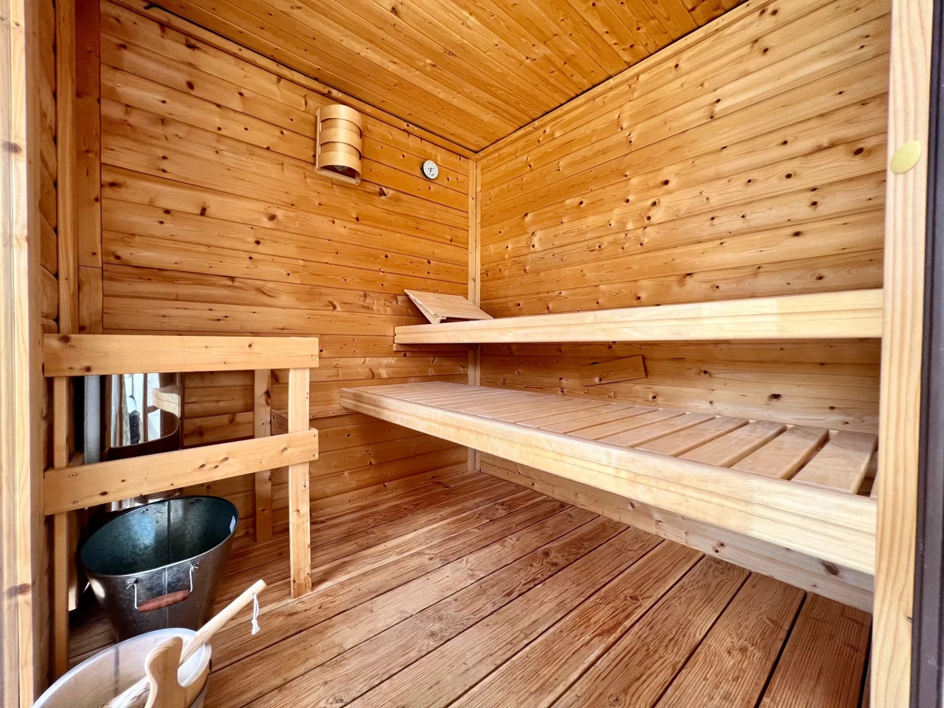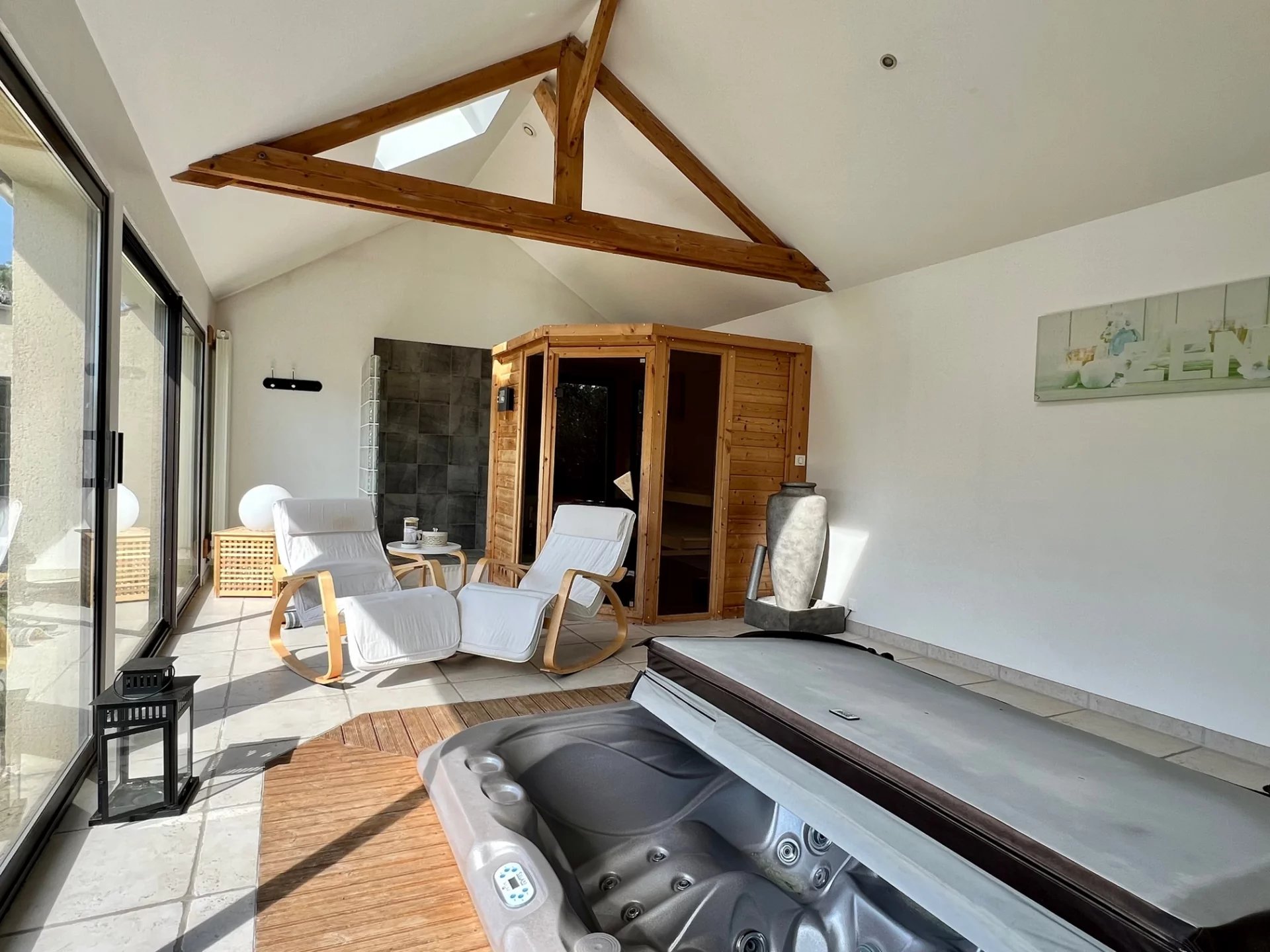 Au rez-de-chaussée, l'entrée dessert la cuisine aménagée, un double séjour avec une cheminée centrale donnant également sur la terrasse et une autre pièce aménagée en spa avec jacuzzi, douche et sauna.