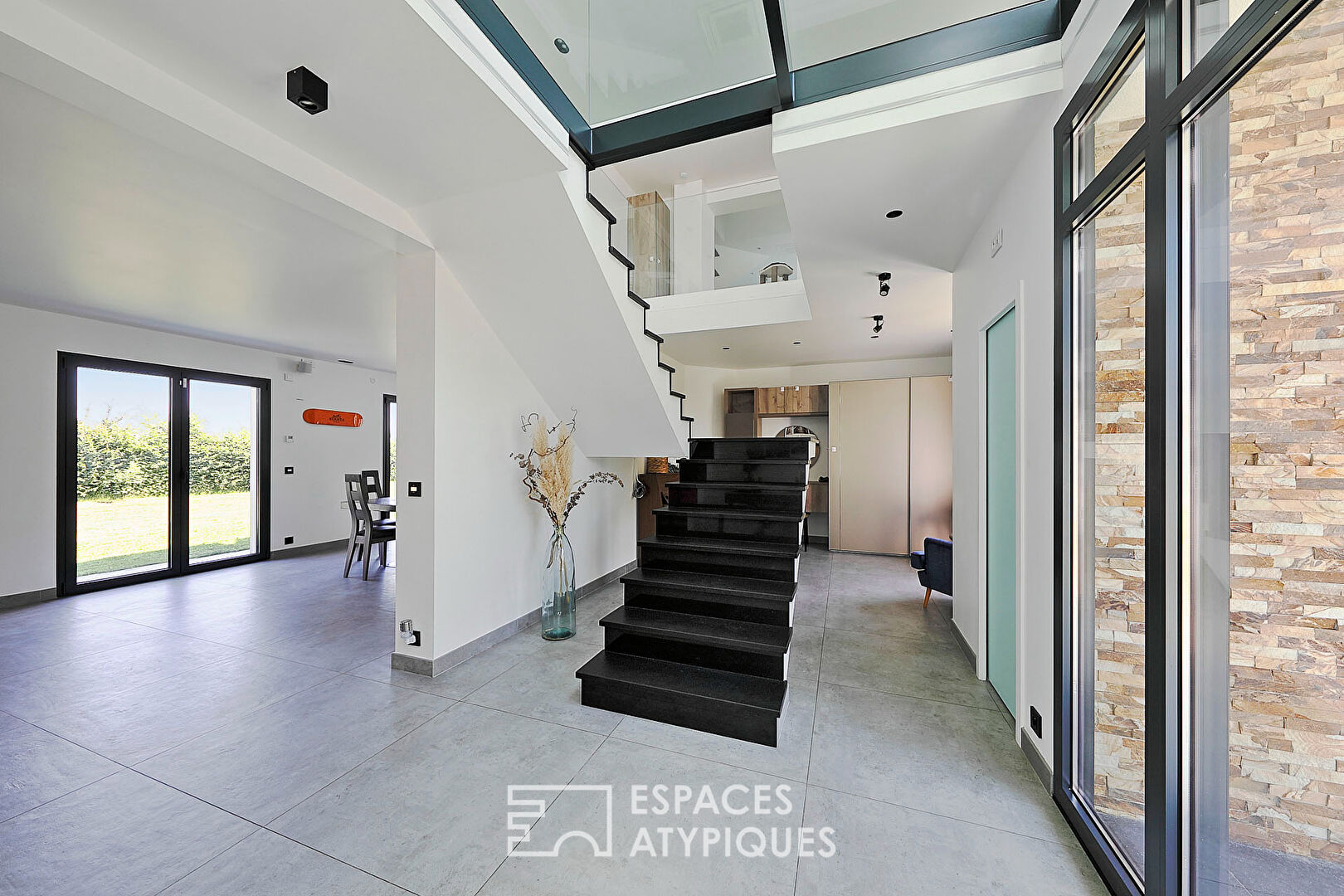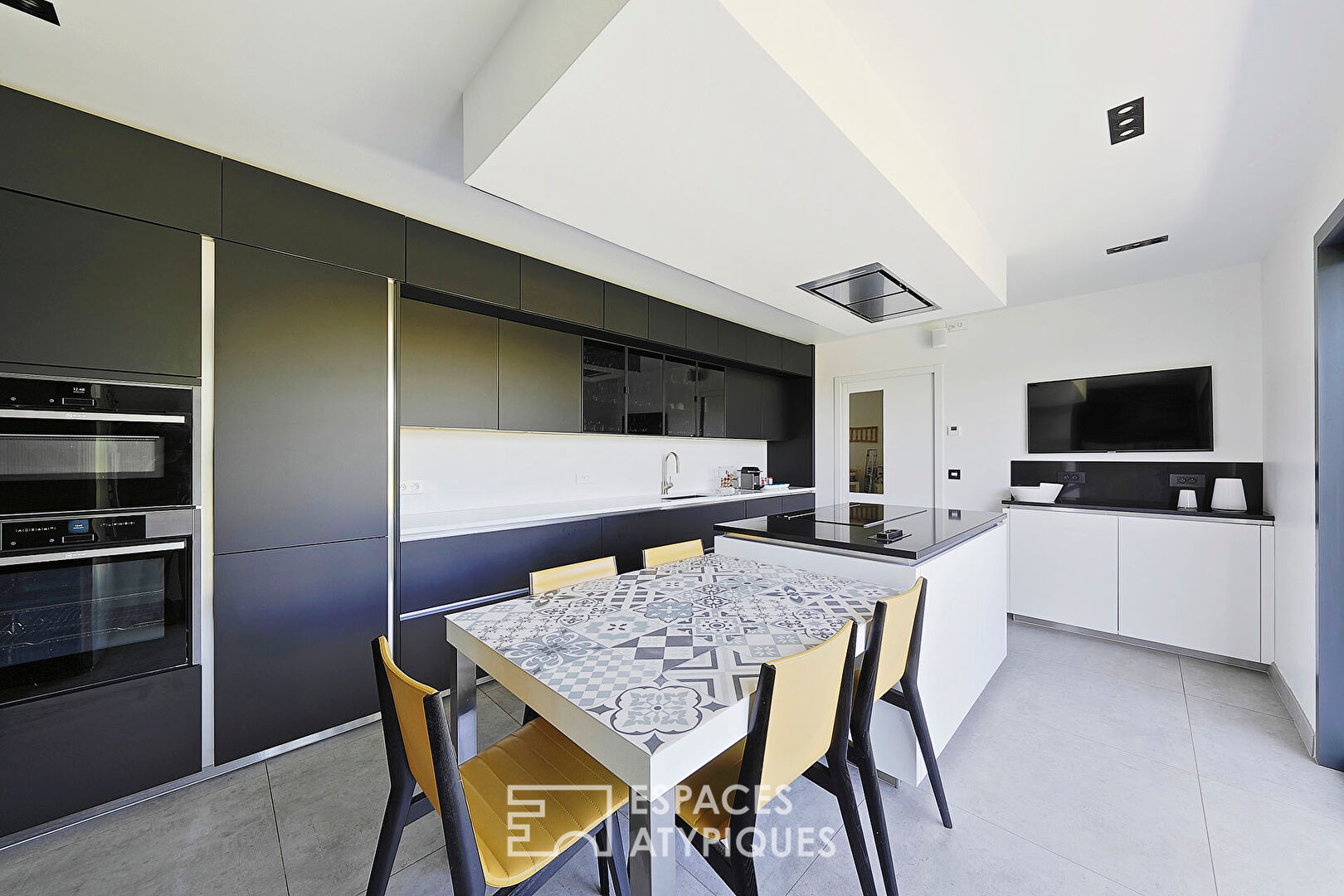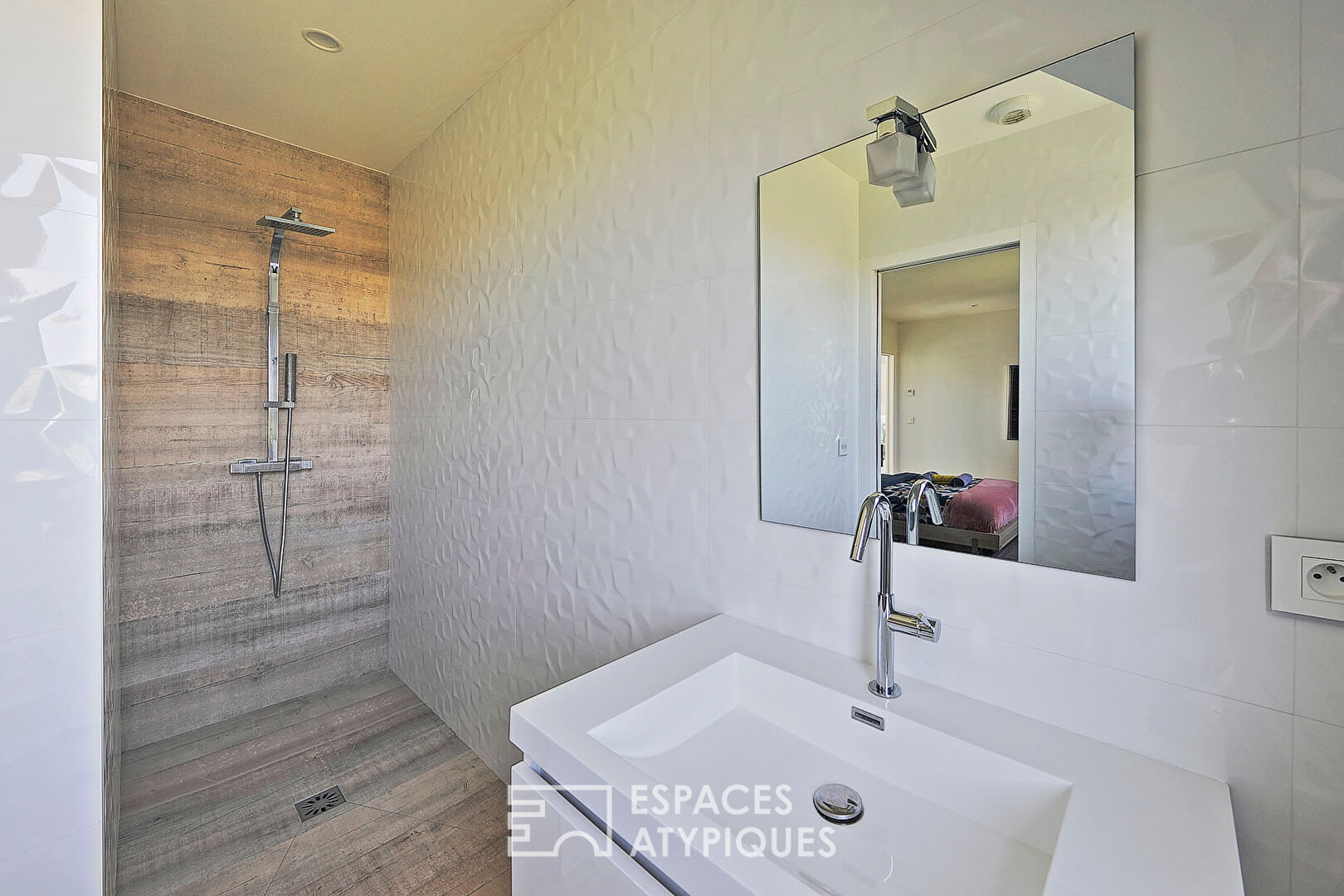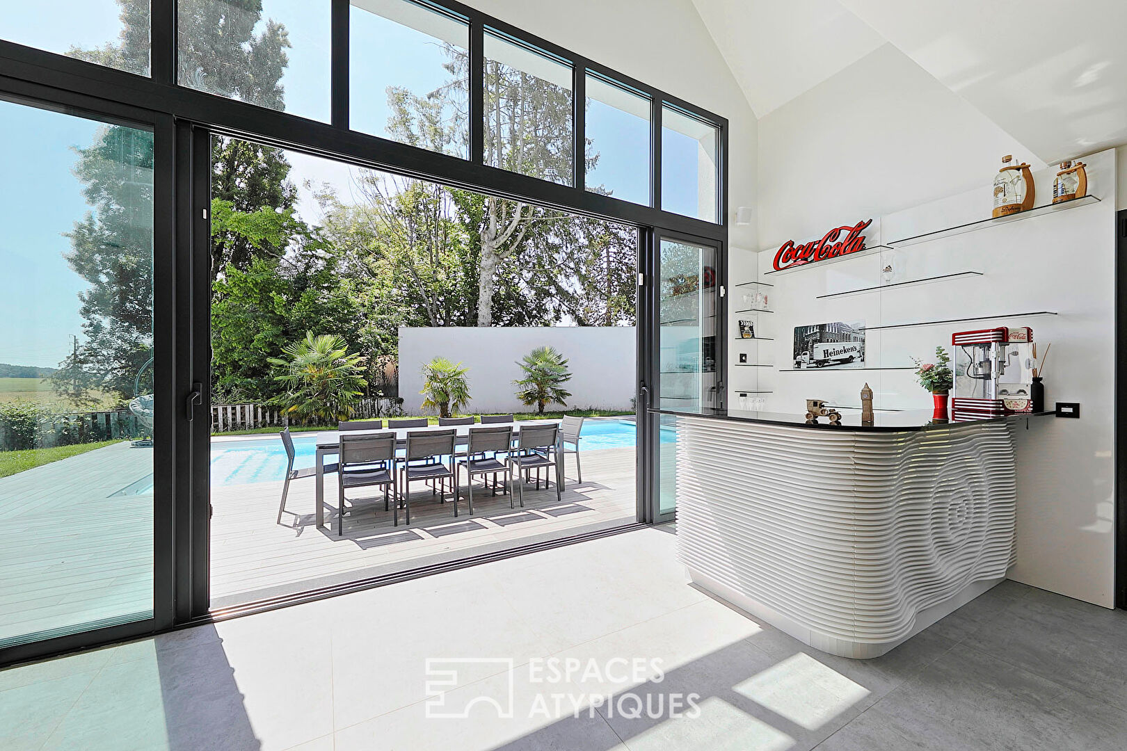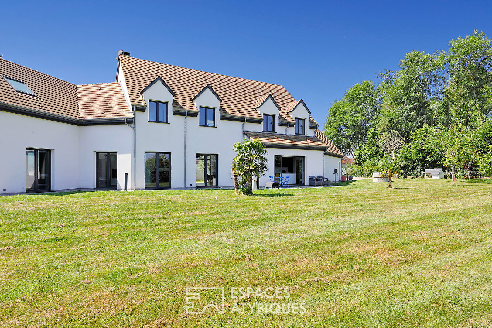 Dans un hameau à mi-chemin entre Crécy-la-Chapelle et La Ferté-sous-Jouarre dans un environnement préservé et verdoyant, cette maison d'architecte contemporaine de 2018 développe une surface habitable de 334 m² au total sur deux niveaux, sur un terrain paysager de presque 2800m². Pensée pour conjuguer volumes, lumière et confort haut de gamme, elle dispose de cinq suites, d'une piscine chauffée au sel, d'un jacuzzi, d'un garage de 50m² avec borne électrique à charge rapide, et d'une vue dégagée sur la campagne. Dès l'entrée, les lignes épurées, les matériaux choisis, la luminosité et la générosité des volumes donnent le ton. Le rez-de-chaussée accueille une suite parentale avec double dressing et salle d'eau, un espace bureau, une salle à manger, une cuisine indépendante équipée avec arrière-cuisine et cellier, des sanitaires, ainsi qu'un salon baigné de lumière par une baie vitrée ouvrant sur la terrasse et la piscine. Un espace bar et un home cinéma aux multiples écrans enrichissent la convivialité des lieux. A l'étage, le palier à sol en verre dessert trois suites avec dressing et salle d'eau, une quatrième suite avec salle de bain balnéo, un salon en mezzanine et une salle de sport/jeux. La distribution intérieure, pensée avec soin, permet une circulation fluide et fonctionnelle. Les espaces extérieurs offrent une véritable parenthèse de détente : piscine chauffée 5x11 m, jacuzzi 5 places, terrasse filante, cuisine d'été équipée, salle d'eau et sanitaires pour la sortie de la piscine ou du spa, ainsi qu'un jardin paysager structuré autour d'essences variées, d'oliviers, de palmiers, de cerisiers et de haies colorées. Le puits équipé assure l'arrosage et l'alimentation des sanitaires. A une heure de Paris, cette propriété profite d'un cadre bucolique tout en restant proche des commodités, établissements scolaires et axes de transport. Panneaux solaires, chauffage au sol par insert, pompes à chaleur réversibles, double vitrage alu, domotique et performance énergétique optimale: un bien rare, au caractère atypique, idéal pour une grande famille et à fort potentiel locatif, actuellement exploité en Airbnb. CLASSE ENERGIE : A/ CLASSE CLIMAT : A Montant des dépenses annuelles d'énergie pour un usage standard établi à partir des prix de l'énergie indexés sur les années 2021, 2022,2023 (abonnement compris) entre 965 euros et 1305 euros par an. Contact : Elvire de la MARTINIERE - 06 03 05 05 96 RSAC : 800 930 232 MEAUX Elvire DE LA MARTINIERE (EI) Agent Commercial - Numéro RSAC : 800 930 232 - MEAUX.
