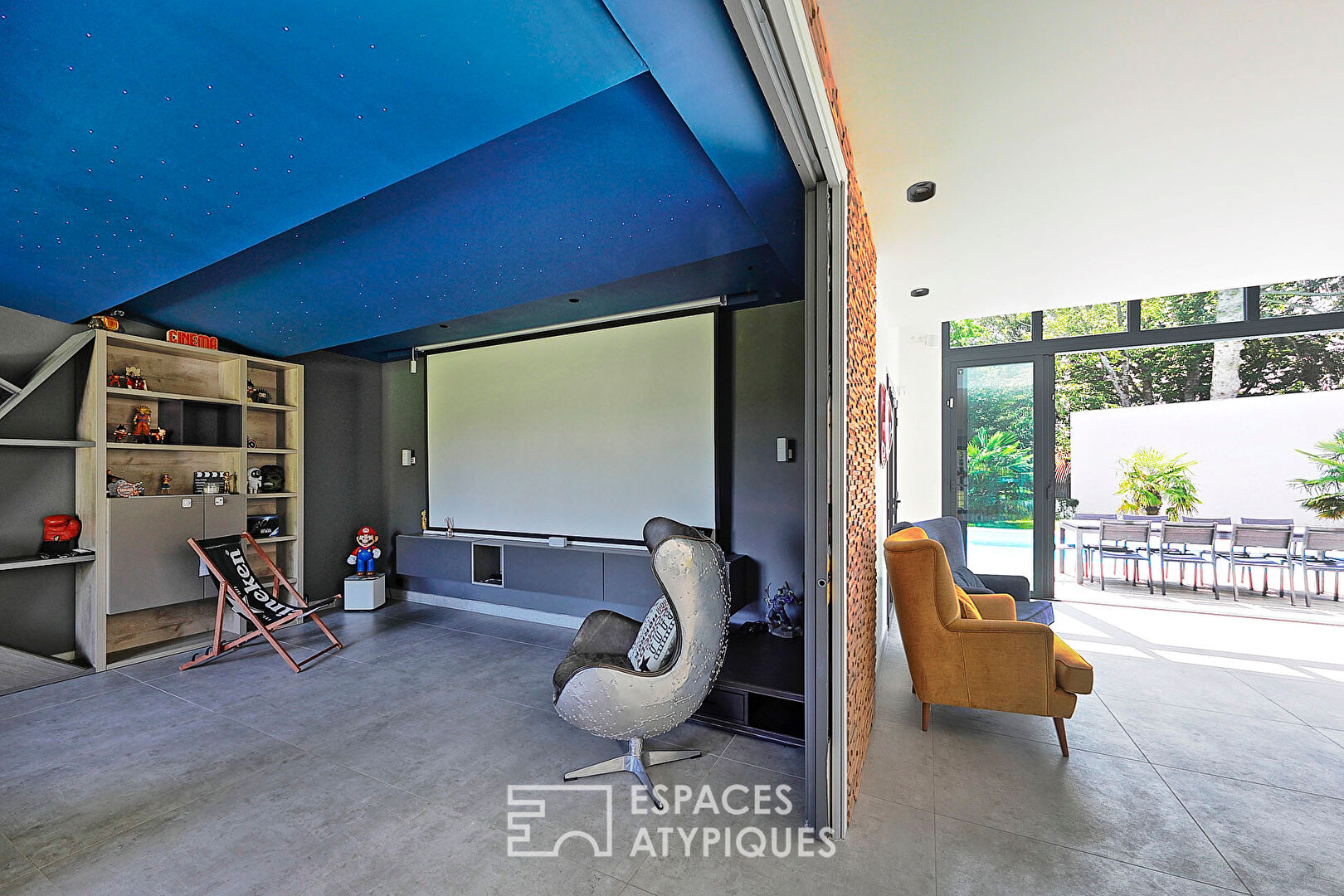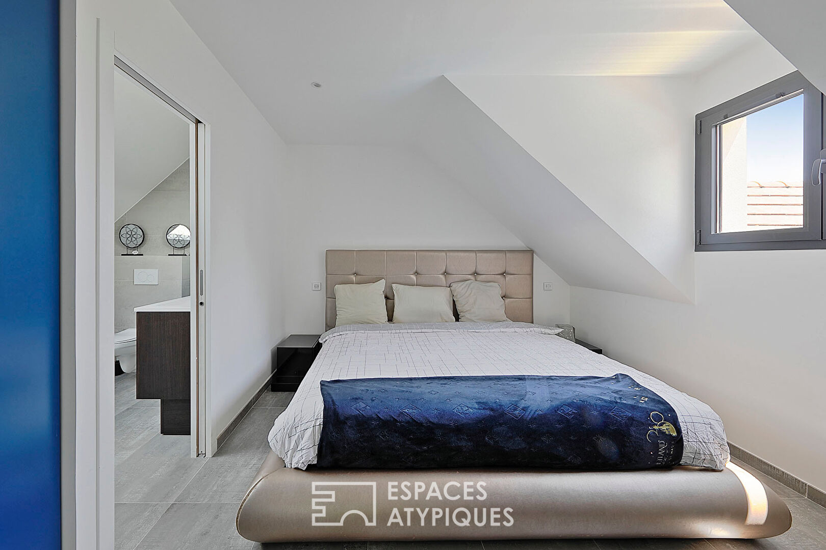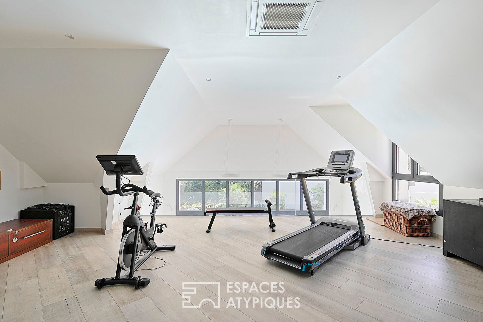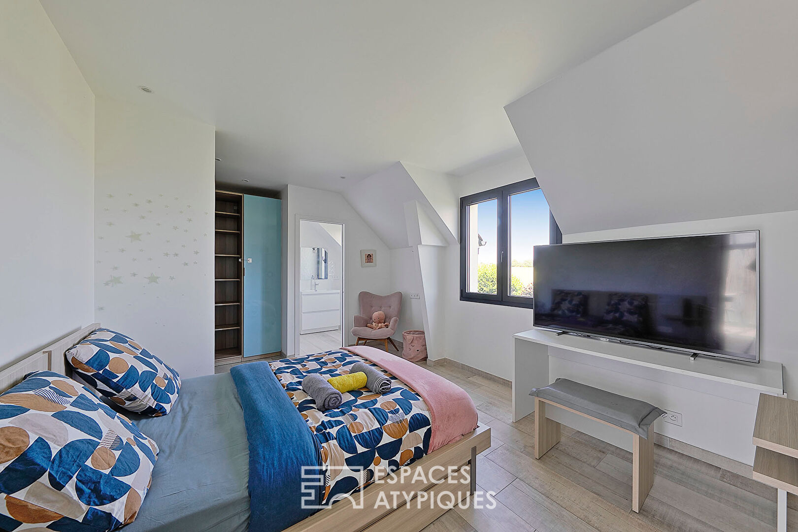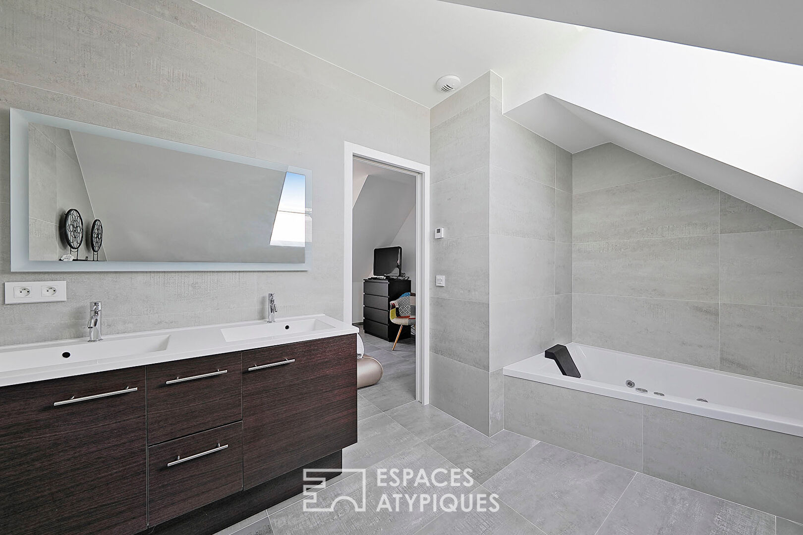 Dans un hameau à mi-chemin entre Crécy-la-Chapelle et La Ferté-sous-Jouarre dans un environnement préservé et verdoyant, cette maison d'architecte contemporaine de 2018 développe une surface habitable de 334 m² au total sur deux niveaux, sur un terrain paysager de presque 2800m². Pensée pour conjuguer volumes, lumière et confort haut de gamme, elle dispose de cinq suites, d'une piscine chauffée au sel, d'un jacuzzi, d'un garage de 50m² avec borne électrique à charge rapide, et d'une vue dégagée sur la campagne. Dès l'entrée, les lignes épurées, les matériaux choisis, la luminosité et la générosité des volumes donnent le ton. Le rez-de-chaussée accueille une suite parentale avec double dressing et salle d'eau, un espace bureau, une salle à manger, une cuisine indépendante équipée avec arrière-cuisine et cellier, des sanitaires, ainsi qu'un salon baigné de lumière par une baie vitrée ouvrant sur la terrasse et la piscine. Un espace bar et un home cinéma aux multiples écrans enrichissent la convivialité des lieux. A l'étage, le palier à sol en verre dessert trois suites avec dressing et salle d'eau, une quatrième suite avec salle de bain balnéo, un salon en mezzanine et une salle de sport/jeux. La distribution intérieure, pensée avec soin, permet une circulation fluide et fonctionnelle. Les espaces extérieurs offrent une véritable parenthèse de détente : piscine chauffée 5x11 m, jacuzzi 5 places, terrasse filante, cuisine d'été équipée, salle d'eau et sanitaires pour la sortie de la piscine ou du spa, ainsi qu'un jardin paysager structuré autour d'essences variées, d'oliviers, de palmiers, de cerisiers et de haies colorées. Le puits équipé assure l'arrosage et l'alimentation des sanitaires. A une heure de Paris, cette propriété profite d'un cadre bucolique tout en restant proche des commodités, établissements scolaires et axes de transport. Panneaux solaires, chauffage au sol par insert, pompes à chaleur réversibles, double vitrage alu, domotique et performance énergétique optimale: un bien rare, au caractère atypique, idéal pour une grande famille et à fort potentiel locatif, actuellement exploité en Airbnb. CLASSE ENERGIE : A/ CLASSE CLIMAT : A Montant des dépenses annuelles d'énergie pour un usage standard établi à partir des prix de l'énergie indexés sur les années 2021, 2022,2023 (abonnement compris) entre 965 euros et 1305 euros par an. Contact : Elvire de la MARTINIERE - 06 03 05 05 96 RSAC : 800 930 232 MEAUX Elvire DE LA MARTINIERE (EI) Agent Commercial - Numéro RSAC : 800 930 232 - MEAUX.