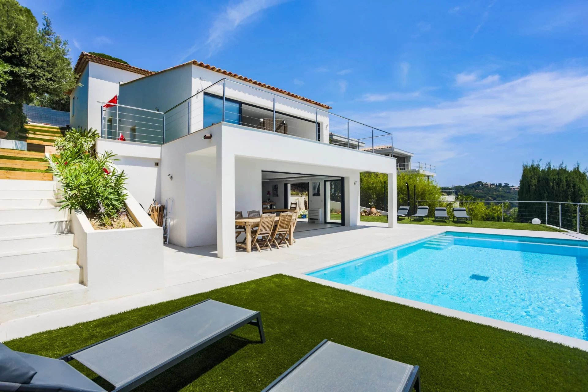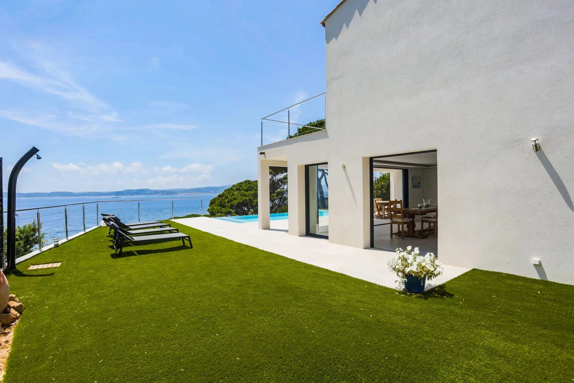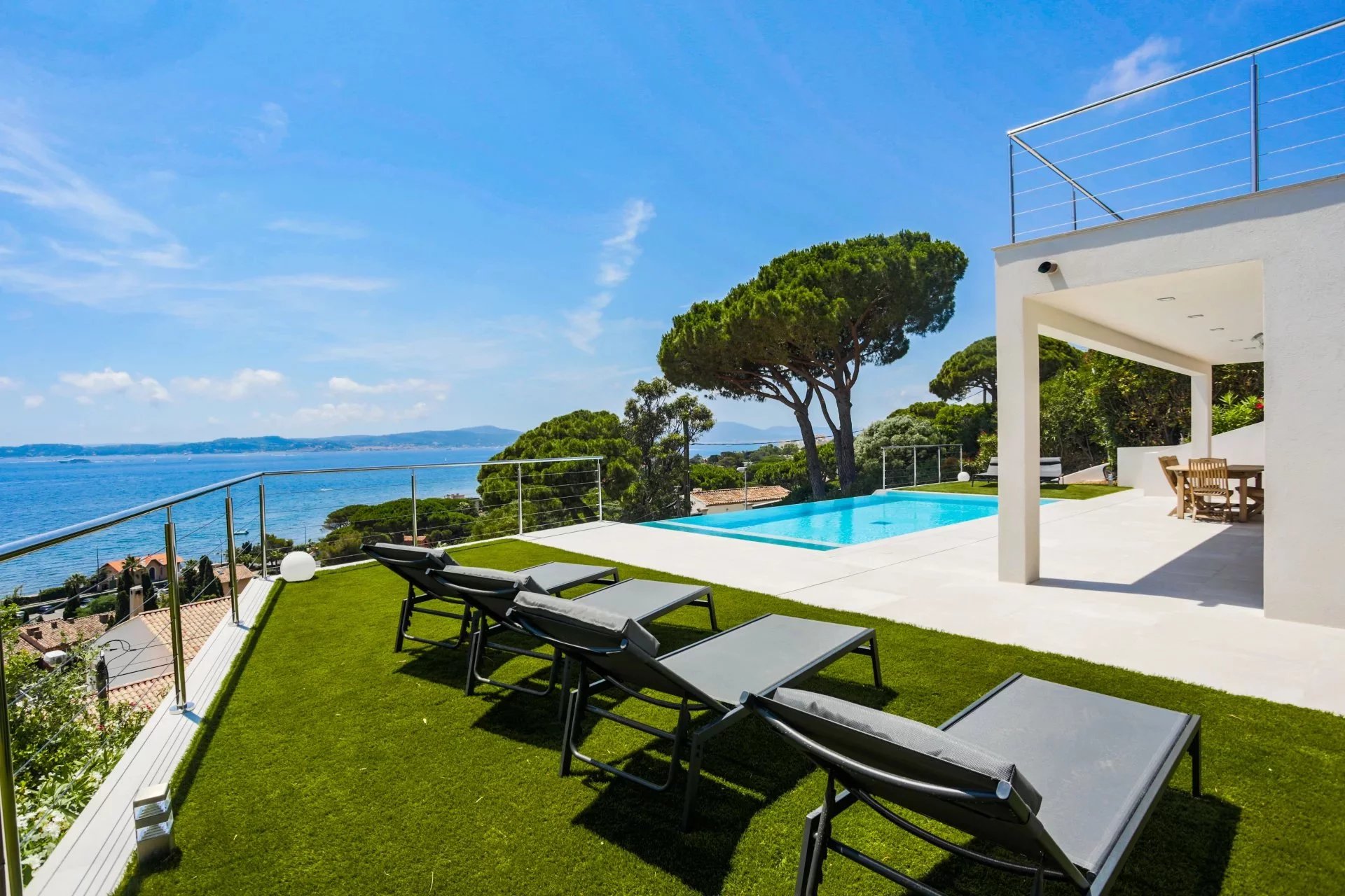 Située dans l'un des quartiers les plus recherchés de Sainte-Maxime, villa moderne d'une surface habitable (Loi Carrez) de 255m2 implantée sur un terrain de 1033m2 parfaitement aménagé. Répartie sur 4 niveaux desservis par un ascenseur la villa offre un cadre de vie agréable mêlant volumes généreux et une vue mer panoramique depuis toutes les pièces principales. La villa est composée comme suit: Niveau 4 : Espace parental privilégié Une entrée principale avec rangements Une chambre master avec espace bureaux un dressing Une salle de douche avec douche à l'italienne, double vasque, WC, un sèche serviette. Grande terrasse avec jacuzzi donnant sur une vue mer panoramique. Niveau 3: Espace nuit invités ou enfants Deux chambres, chacune avec dressing et salle de douche privative, un WC invité terrasse avec vue mer Niveau 2 : Espace détente et réception Grand salon lumineux avec espace bar Terrasse spacieuse avec vue mer panoramique Niveau 1 : Coeur de vie WC invité Vaste séjour / salle à manger avec cuisine américaine aménagée et équipée Accès terrasse avec piscine à débordement face à la mer. Prestations complémentaires: Garage Coin golf d'entraînement ( Putting green synthétique) Espace barbecue Petite salle de cinéma privée Salle de sport Cave à vin Un environnement au calme et privilégié, à pied de la plage et à seulement quelques minutes du centre-ville et de ses commerces. A visiter sans tarder !
