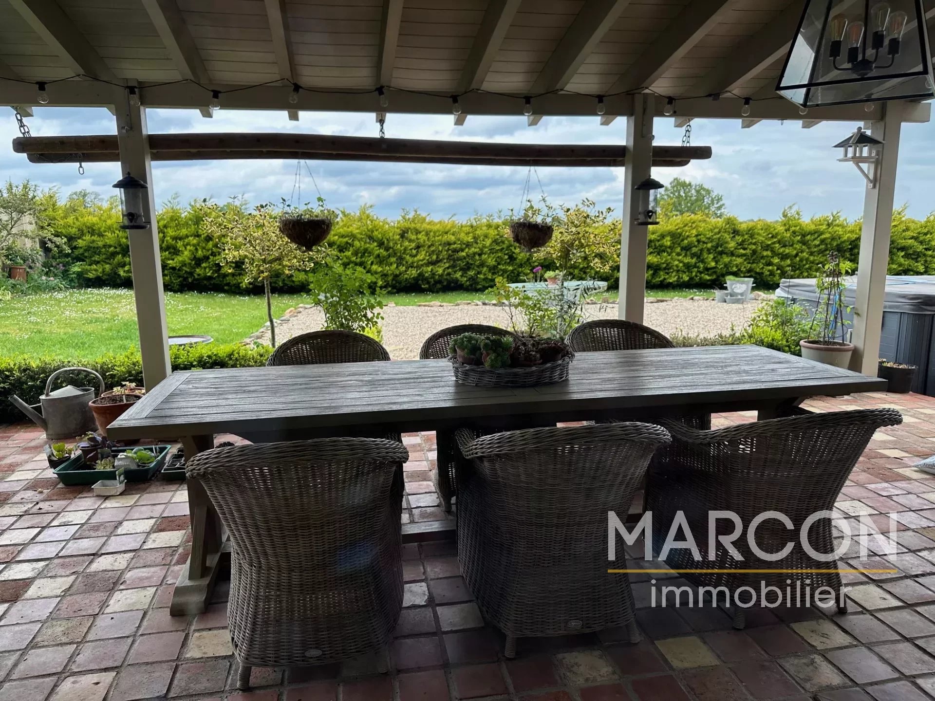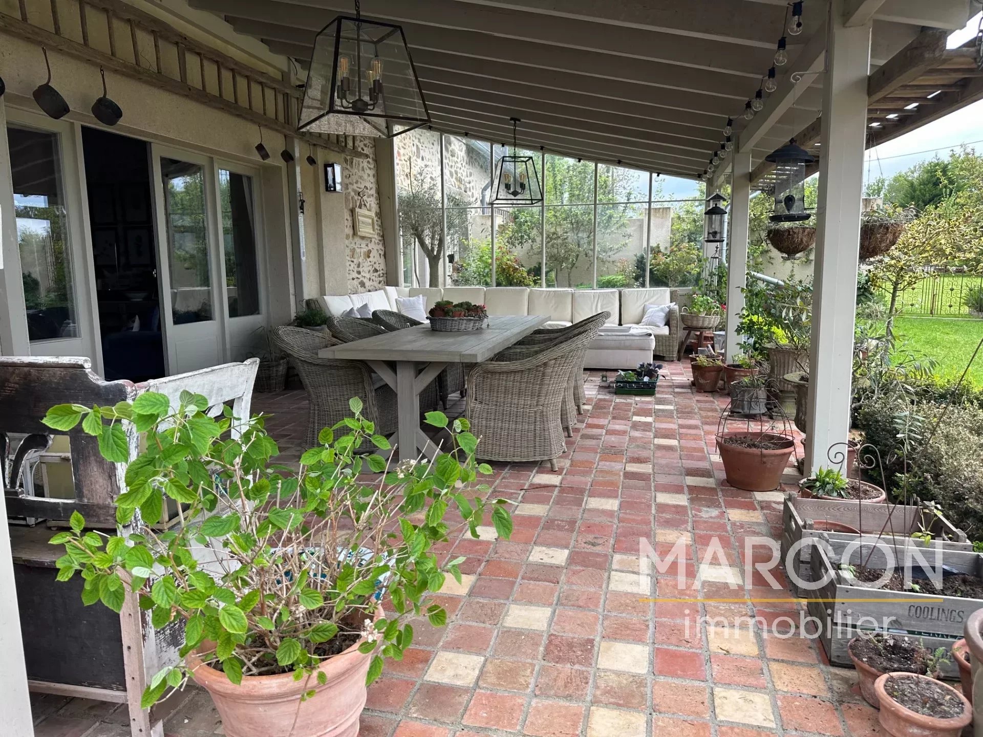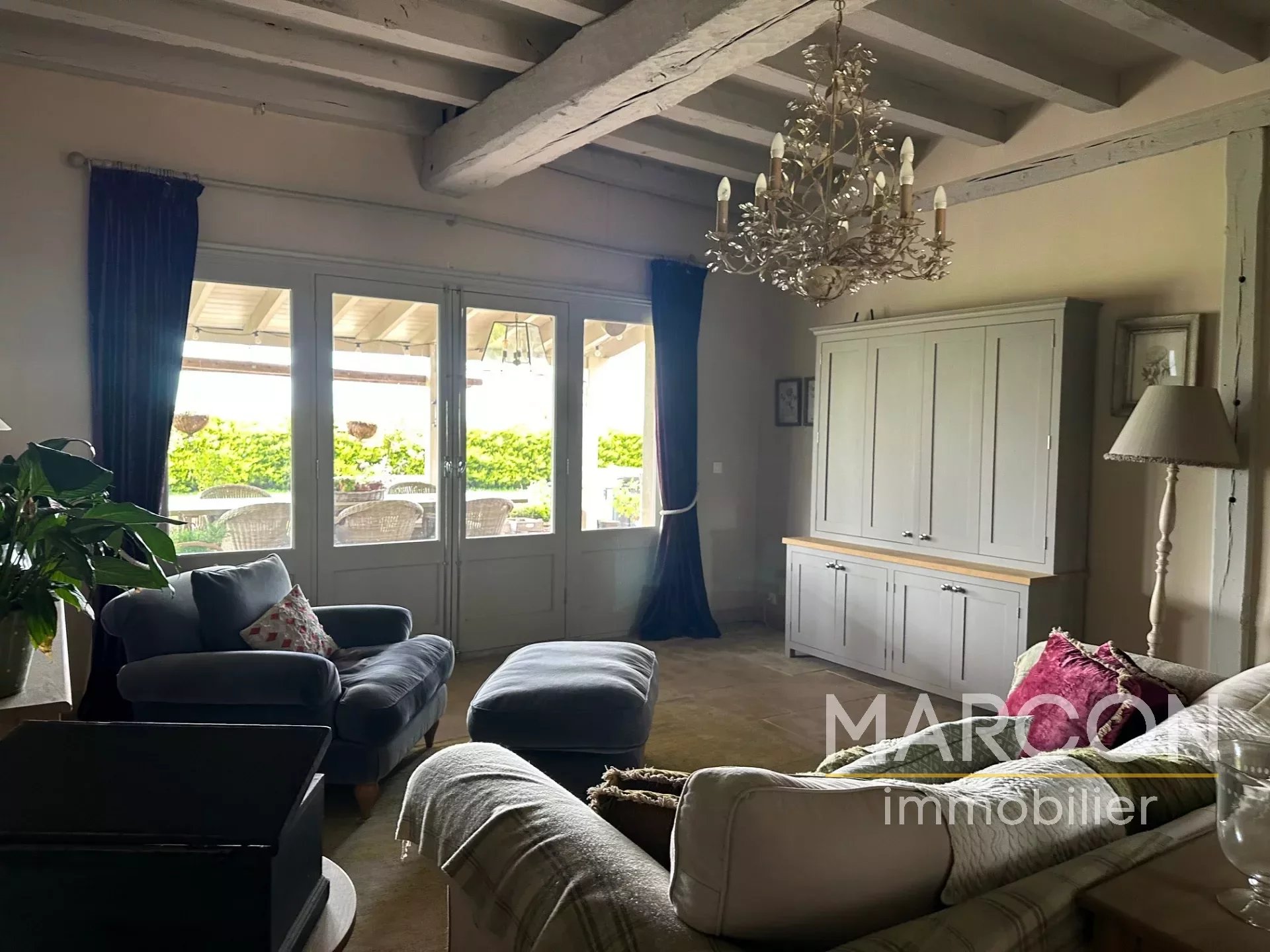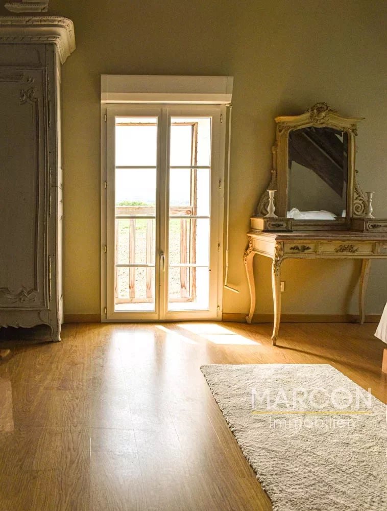 La maison se compose d'une grande cuisine, d'un salon un séjour, une buanderie, 6 chambres et 4 salles de bains, une terrasse couverte. La maison se caractérise par son charme (tomette, pierres, charpente apparente) .