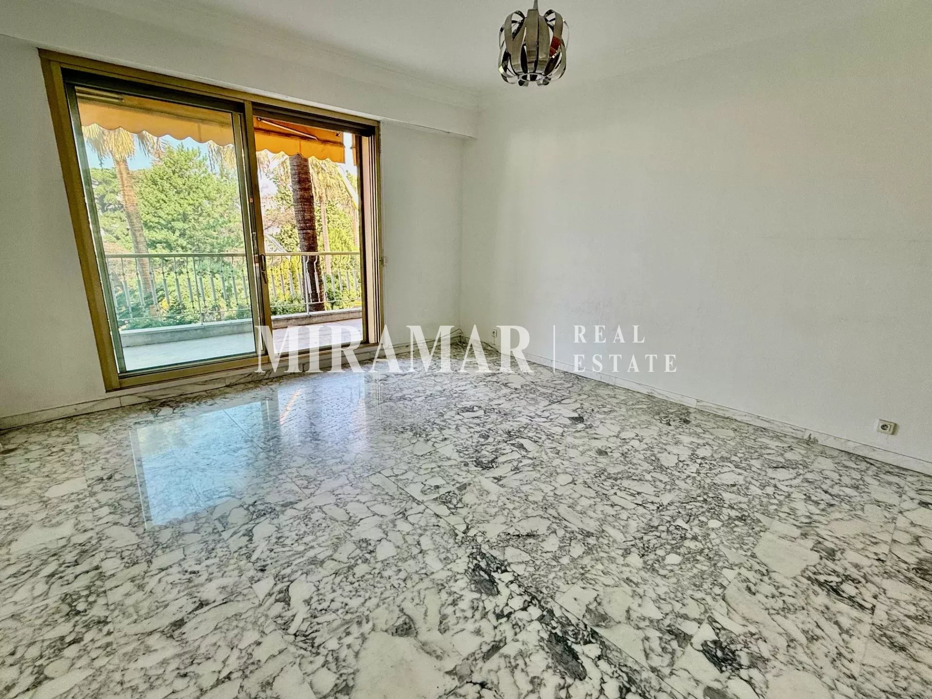Bas Cimiez / Paradisio Dans résidence de standing donnant sur un magnifique parc. Vue verdure et collines pour ce beau 3 pièces 79,59 m² avec terrasse profonde 14 m². Traversant Est / Ouest, l'appartement est composé d'un séjour et d'une chambre donnant une terrasse avec vue sur le parc, en exposition Ouest. Côté Est, une deuxième chambre avec balcon (5 m²) et une cuisine indépendante. Une salle de bain ainsi qu'une salle d'eau et des rangements. Travaux à prévoir. Cave en sous-sol. Possibilité achat d'un immense garage 65 m² (environ 3 places) en supplément pour 100 000 euros.