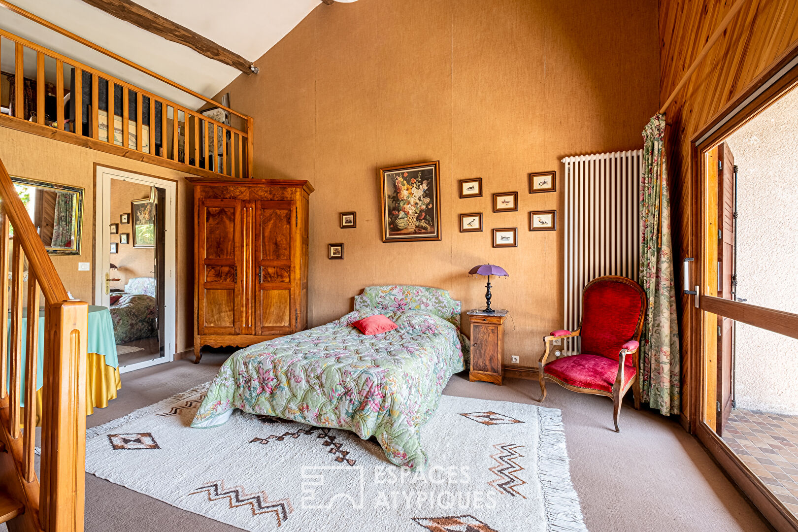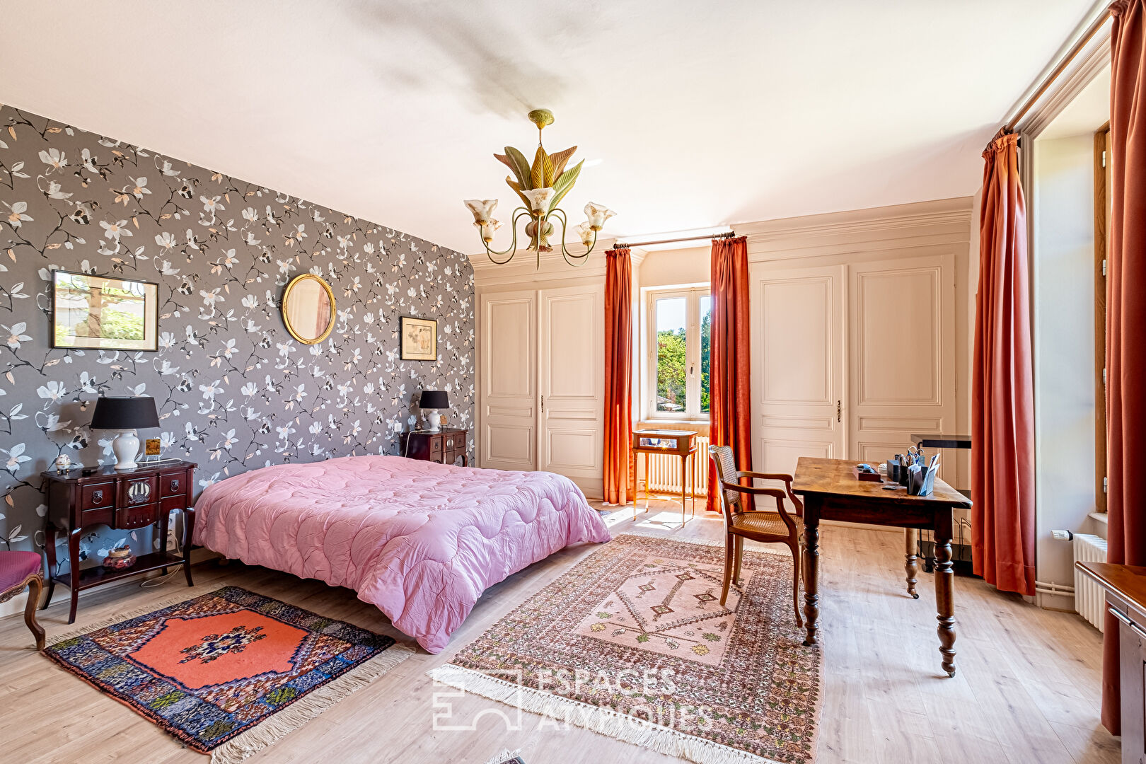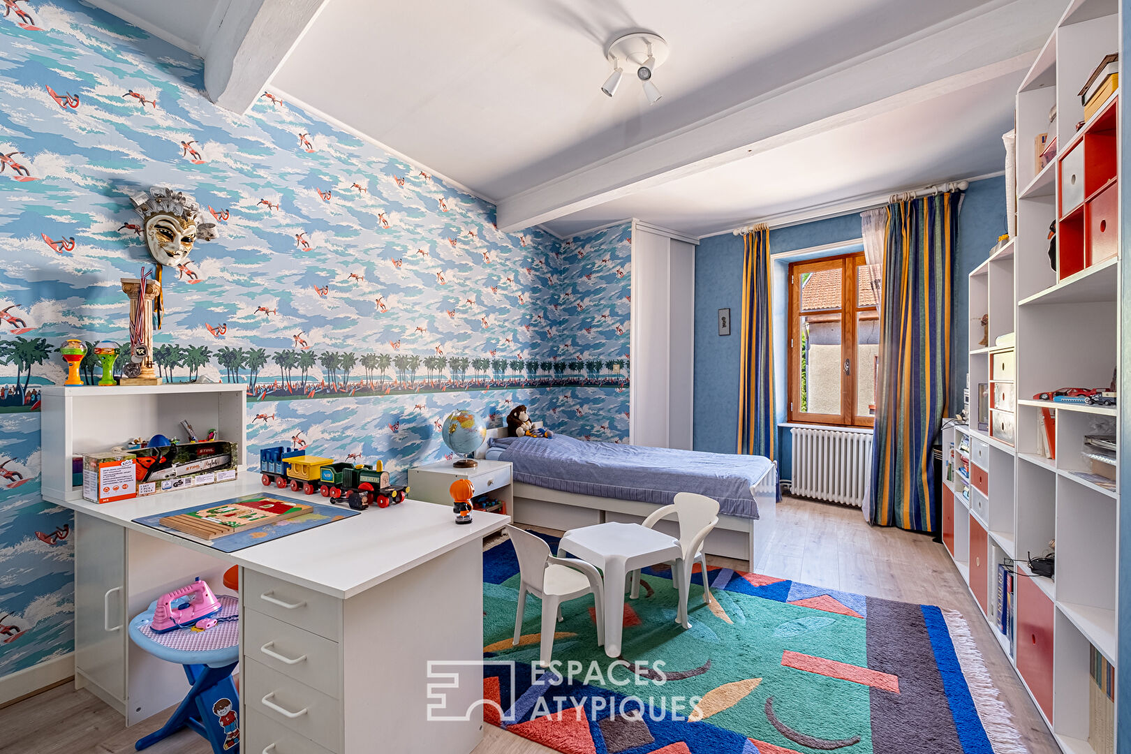Au coeur d'un écrin de verdure, en bordure de la rivière d'Ain, cette propriété rare et pleine de charme, construite en 1860, vous offre un cadre de vie exceptionnel, où nature, élégance et sérénité se conjuguent à la perfection. Située sur la paisible commune de Mollon, à seulement 7 kilomètres de Meximieux et de sa gare reliant Lyon Part-Dieu en 30 minutes, cette demeure de caractère allie avec harmonie le cachet de l'ancien et le confort d'une maison parfaitement entretenue. D'une superficie de 280 m2 habitable, la maison se déploie sur trois niveaux et offre dix pièces lumineuses aux volumes généreux, dont cinq chambres. Le rez-de-chaussée s'organise autour de deux salons chaleureux, d'une salle à manger conviviale, d'une cuisine indépendante équipée entièrement rénovée en 2018, et de toilettes invités. A l'étage, une suite parentale séduisante avec salle de bain, toilettes, et terrasse privative donnant sur le parc, s'accompagne de trois grandes chambres, d'une salle de bain supplémentaire et d'un second toilette. Le dernier niveau abrite une vaste salle de jeux ou espace vidéo, une chambre supplémentaire, une salle d'eau avec toilettes et un dressing. A l'extérieur, le charme opère immédiatement. Le parc de 4500 m², soigneusement arboré et paysagé, accueille de nombreuses essences d'arbres, des massifs floraux colorés, et offre une atmosphère paisible et ombragée. Une piscine chauffée par panneaux solaires s'intègre parfaitement dans cet environnement naturel, avec en bordure un bâtiment secondaire aménagé en cuisine d'été et salle de réception, capable d'accueillir confortablement une vingtaine de personnes. A l'extrémité du jardin, un portillon donne un accès privé à la rivière pour des baignades, parties de pêche ou balades en canoë au fil de l'eau. Pour compléter ce tableau d'exception, un authentique four à pain d'époque, parfaitement fonctionnel, vient enrichir cette propriété unique. Un robot de tonte haut de gamme, inclus dans la vente, assure l'entretien du terrain en toute autonomie. Une adresse confidentielle et pleine de poésie, idéale pour les amateurs de nature et de patrimoine, à proximité immédiate de Meximieux et de ces commodités et à moins d'une heure de Lyon. CLASSE ENERGIE : C / CLASSE CLIMAT : D Montant moyen estimé des dépenses annuelles d'énergie pour un usage standard, établi à partir des prix de janvier 2021, 2022 et 2023 : entre 2360 euros et 3250 euros Contact : Morgan - 06 16 35 84 66 Morgan ROCFORT (EI) Agent Commercial - Numéro RSAC : 509 970 729 - Bour-en-Bresse.