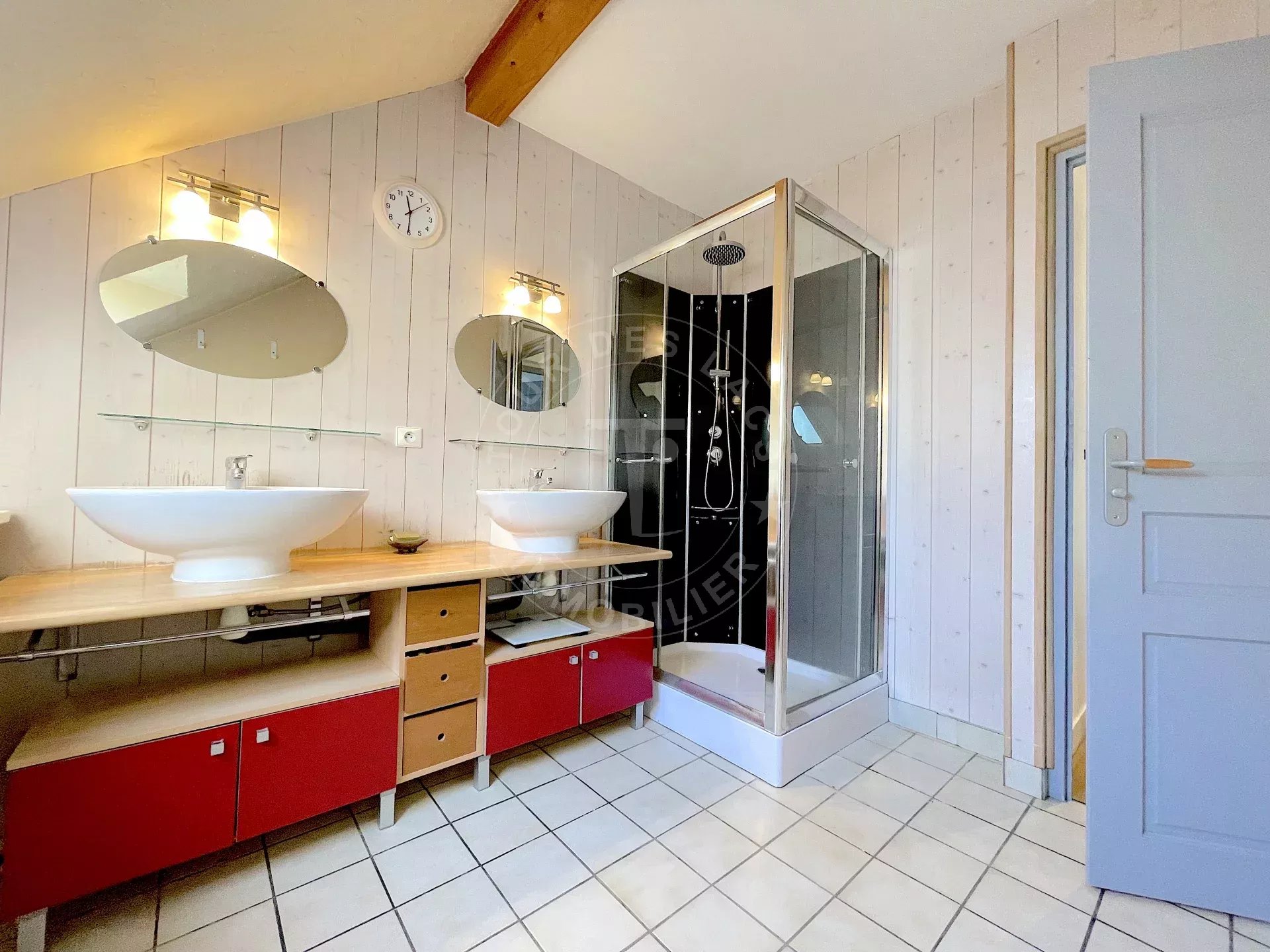 L'espace à vivre se compose d'une cuisine équipée ouvrant sur une salle-à-manger et un salon ayant accès à une terrasse avec vue sur les montagnes. Un couloir dessert 2 chambres donnant sur un balcon, une salle de bains et un WC indépendant. Une mezzanine et un grenier développant 30.46 m², complètent l'ensemble.