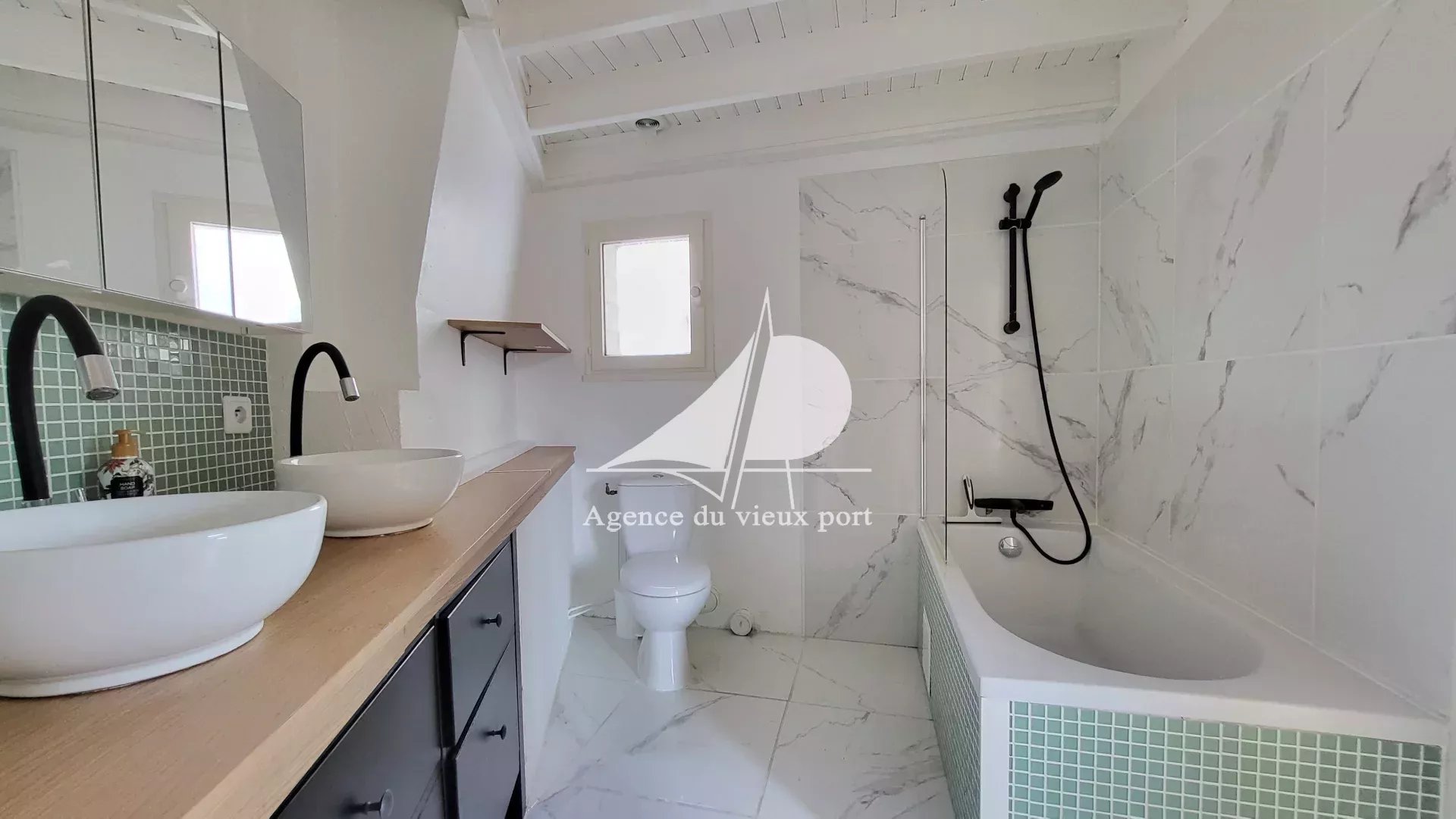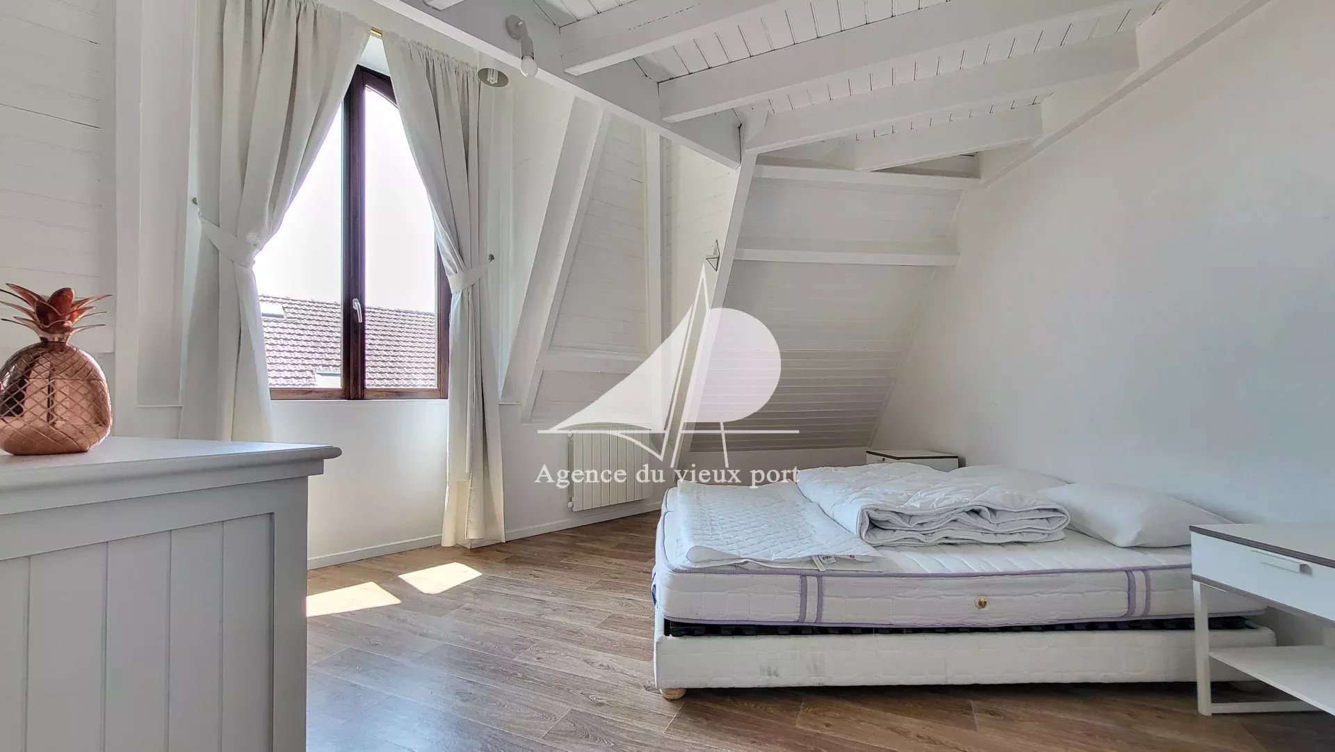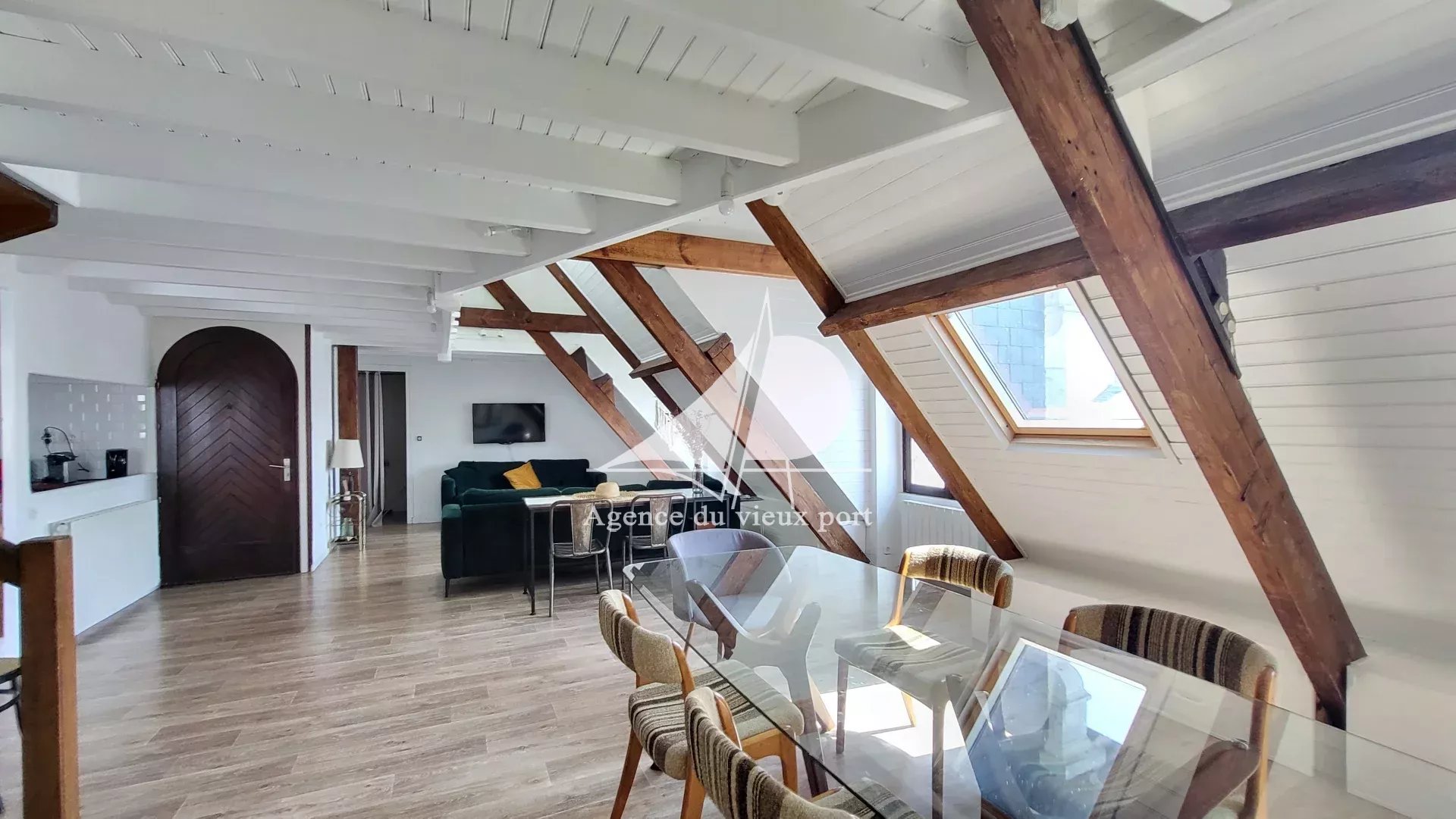 Agence du Vieux Port Pornic, à vendre : centre ville Pornic, idéalement situé : bel appartement duplex à vendre au dernier étage d'un immeuble ancien. Il comprend : une entrée sur salon-séjour, une cuisine américaine aménagée et équipée ouverte sur un balcon, lingerie, une chambre et une salle de bains avec WC. A l'étage : une mezzanine, deux chambres mansardées, un WC. Une cave en sous-sol. Copropriété de 3 lots principaux, pas de procédure en cours, montant des charges annuelles 1175 €. Prix FAI : 346 500 € dont 5 % d'honoraires TTC charge acquéreur. Les informations sur les risques auxquels ce bien est exposé sont disponibles sur le site Géorisques. https://www.georisques.gouv.fr