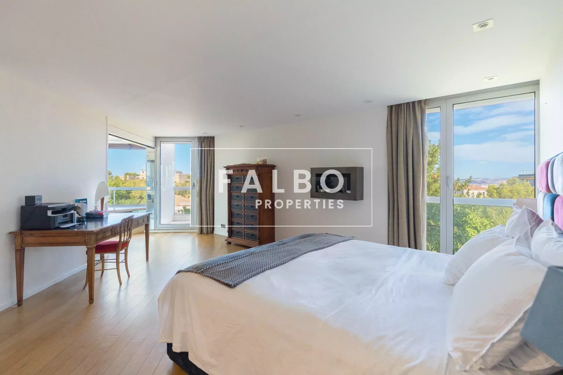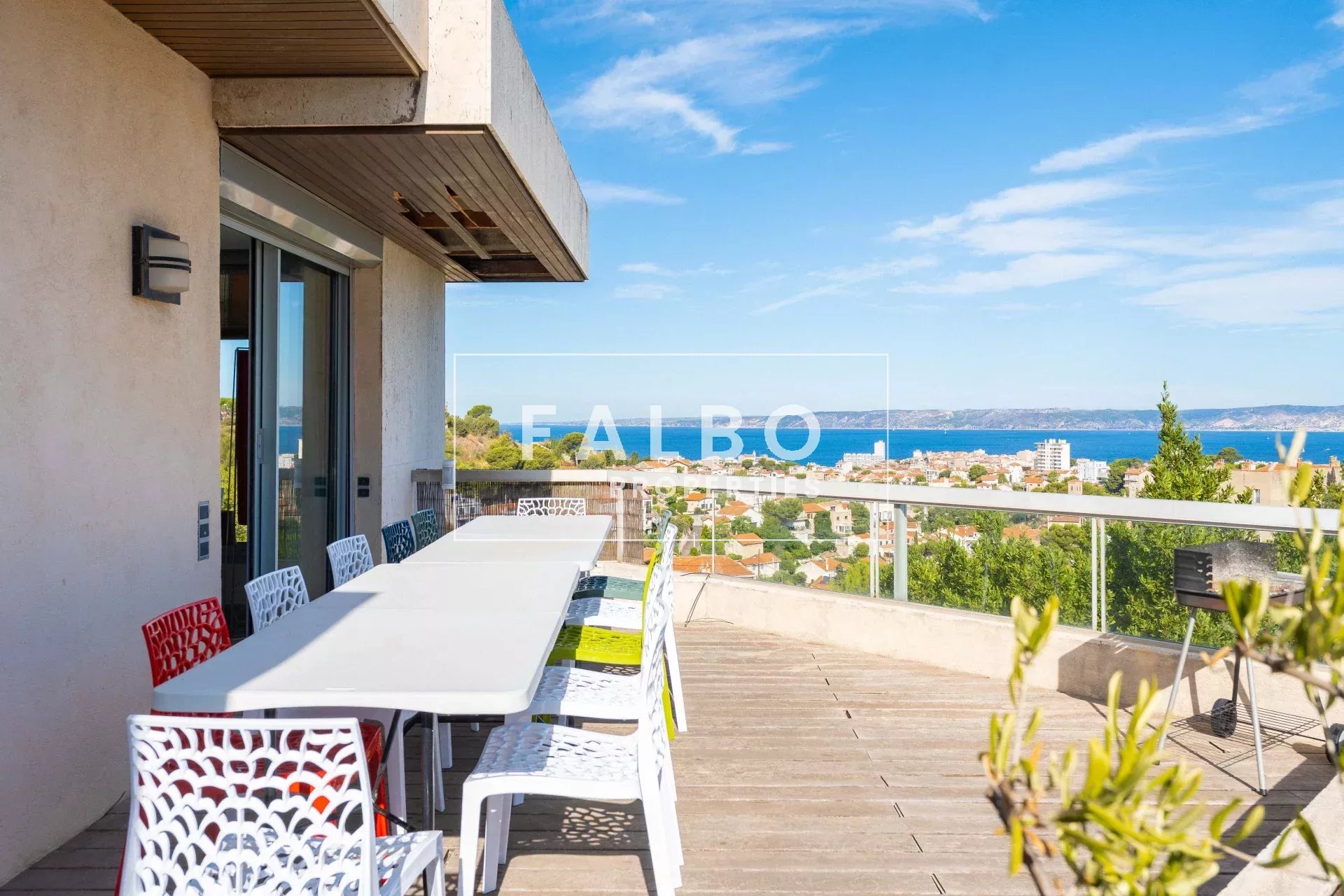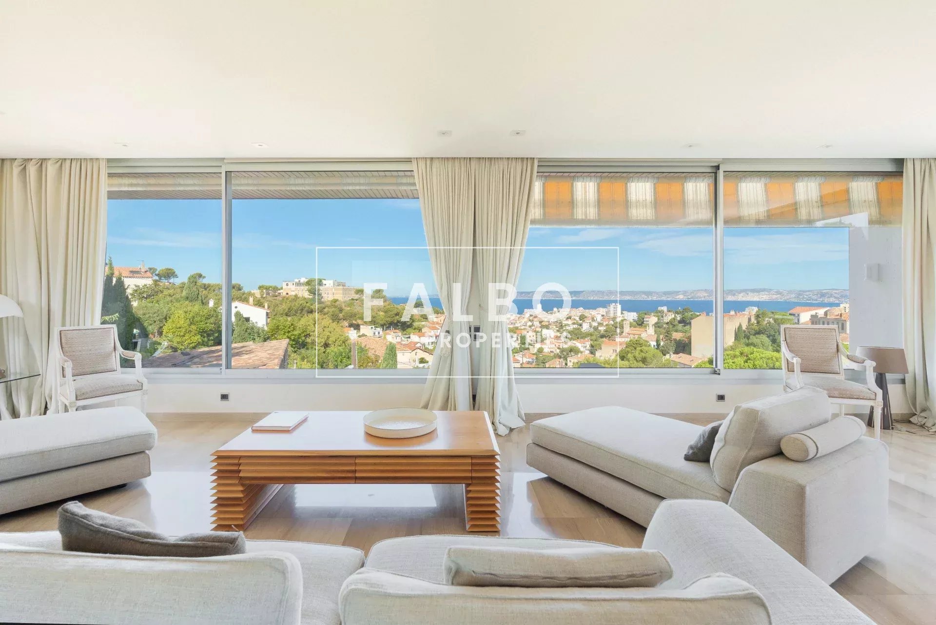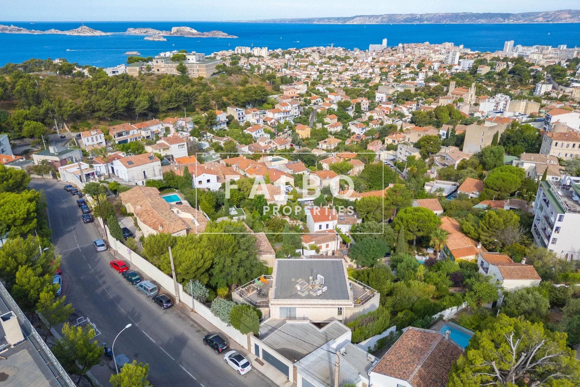 Cette élégante maison d'architecte de plus de 300m² agrémentée d'une piscine, juchée au-dessus d'un vallon typique au coeur du 7e, dominant la mer avec une vue panoramique où figurent aussi Notre-Dame de la Garde et son si singulier relief, est un produit peu commun. Beau témoignage de l'architecture des années 60, la villa est disposée sur 3 niveaux avec un ascenseur, elle offre 5 chambres et une belle réception sur 75 m² et une grande cuisine. Épousant le terrain de 900 m², la bâtisse se prolonge de chaque côté par deux terrasses au premier plan, qui se compose d'une entrée et d'un grand séjour lumineux, à la vue captivante, ainsi que de la cuisine. Un superbe escalier conduit au deuxième niveau où se trouvent 3 chambres et leurs salles d'eau/WC, ainsi qu'une master de 50 m² avec sa spacieuse salle de bain et son dressing. Chacune est baignée de lumière tandis qu'un petit salon/espace de lecture, situé en retrait, donne sur la verdure. Au rez-de-chaussée, une salle de jeu et un studio indépendant équipé (salle de bain/WC, kitchenette) donnent de plain-pied sur la piscine. Le premier niveau, à l'entrée de la villa, comporte un abri à voiture muni d'une prise électrique. Emplacement résidentiel recherché à mi-chemin entre Périer et la Corniche.