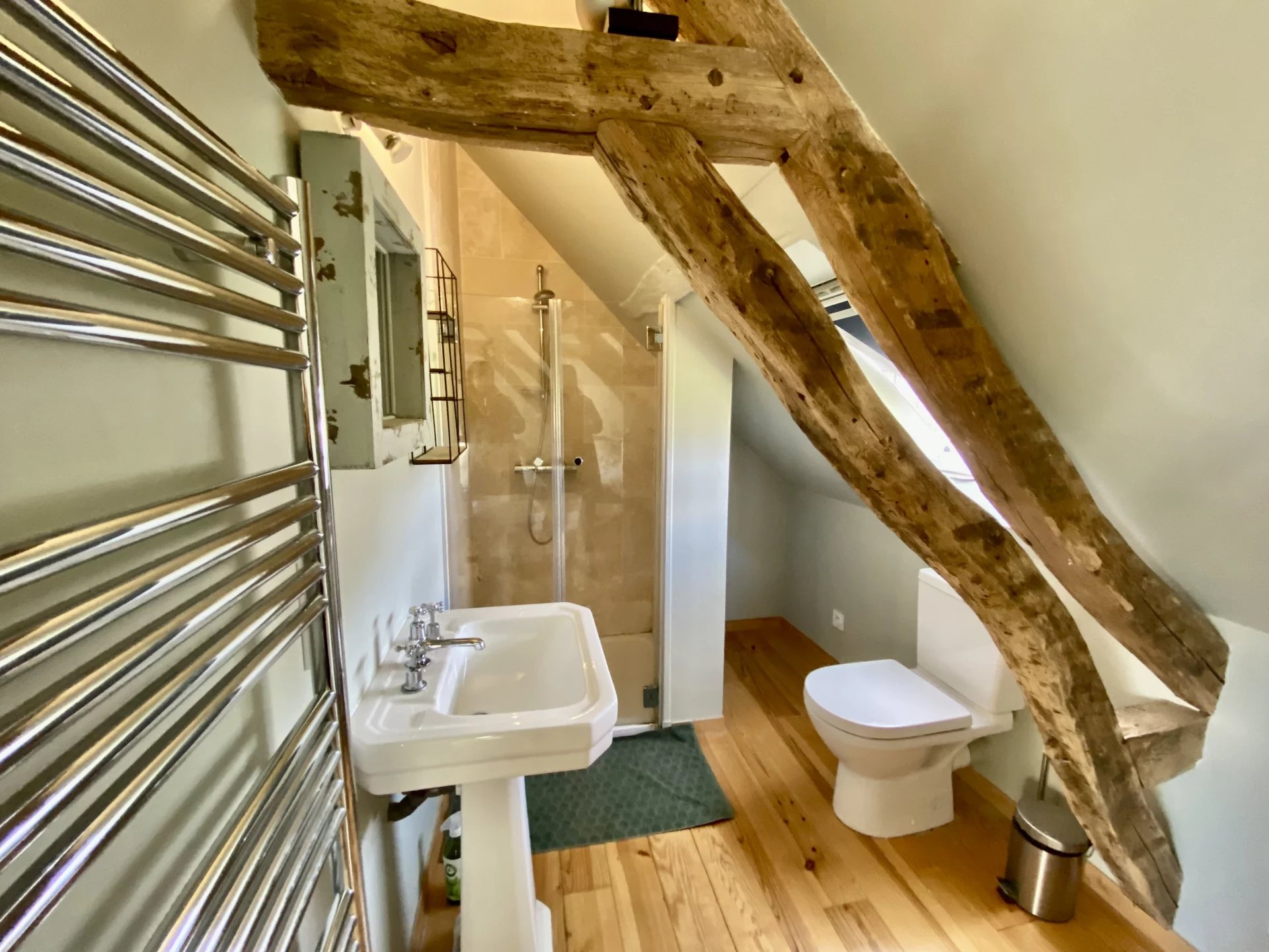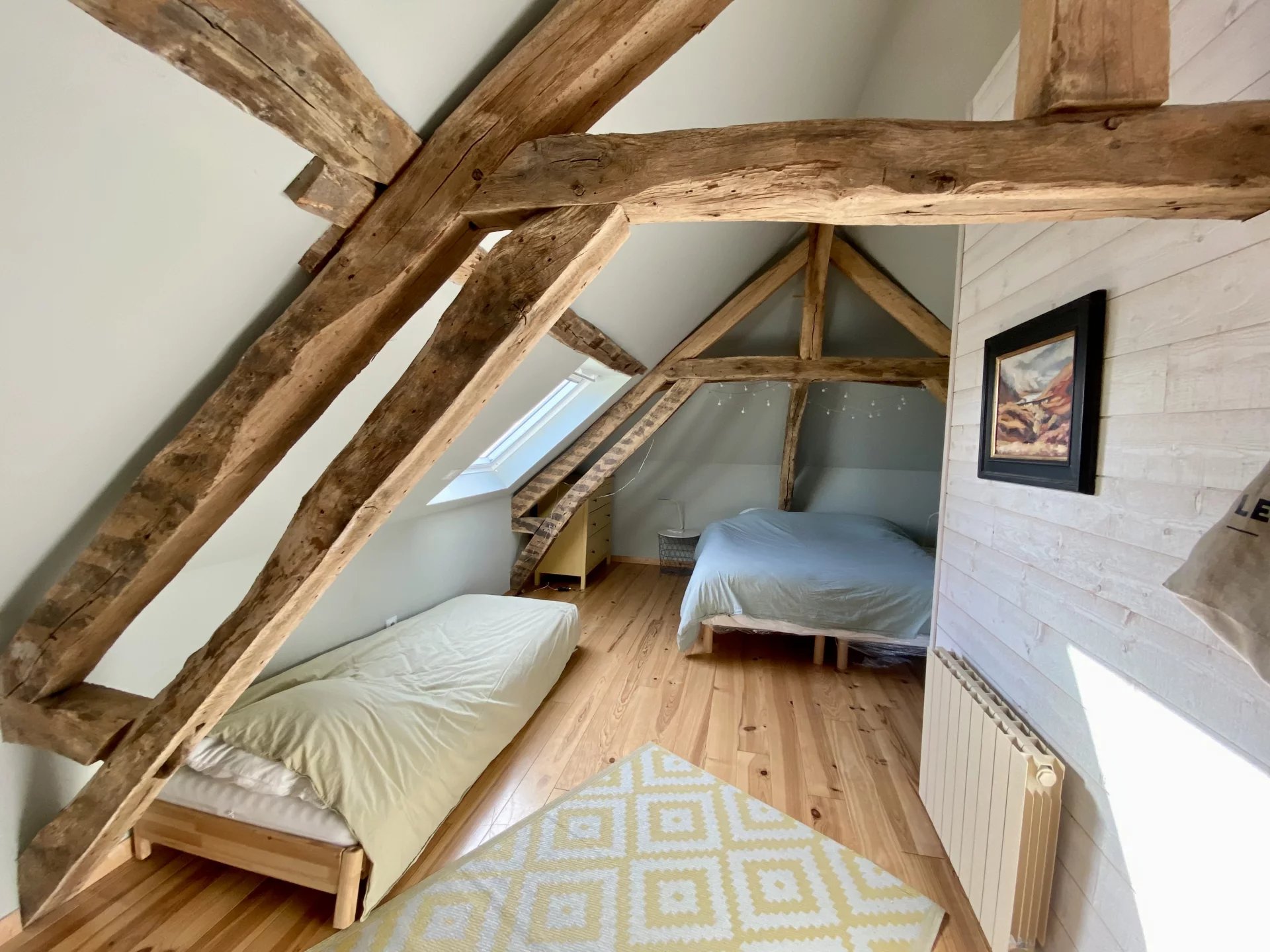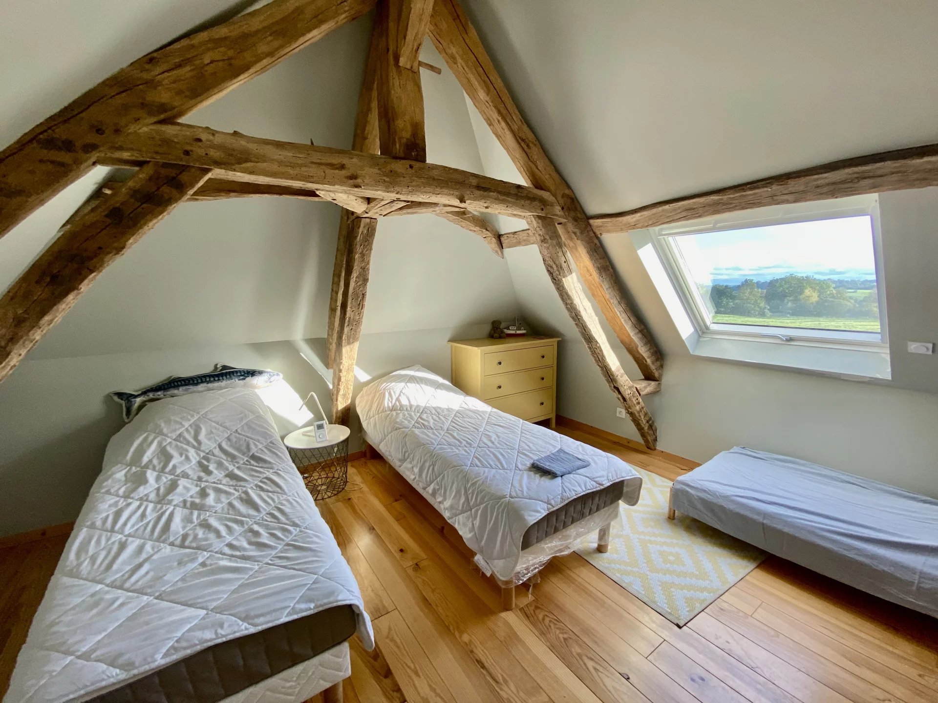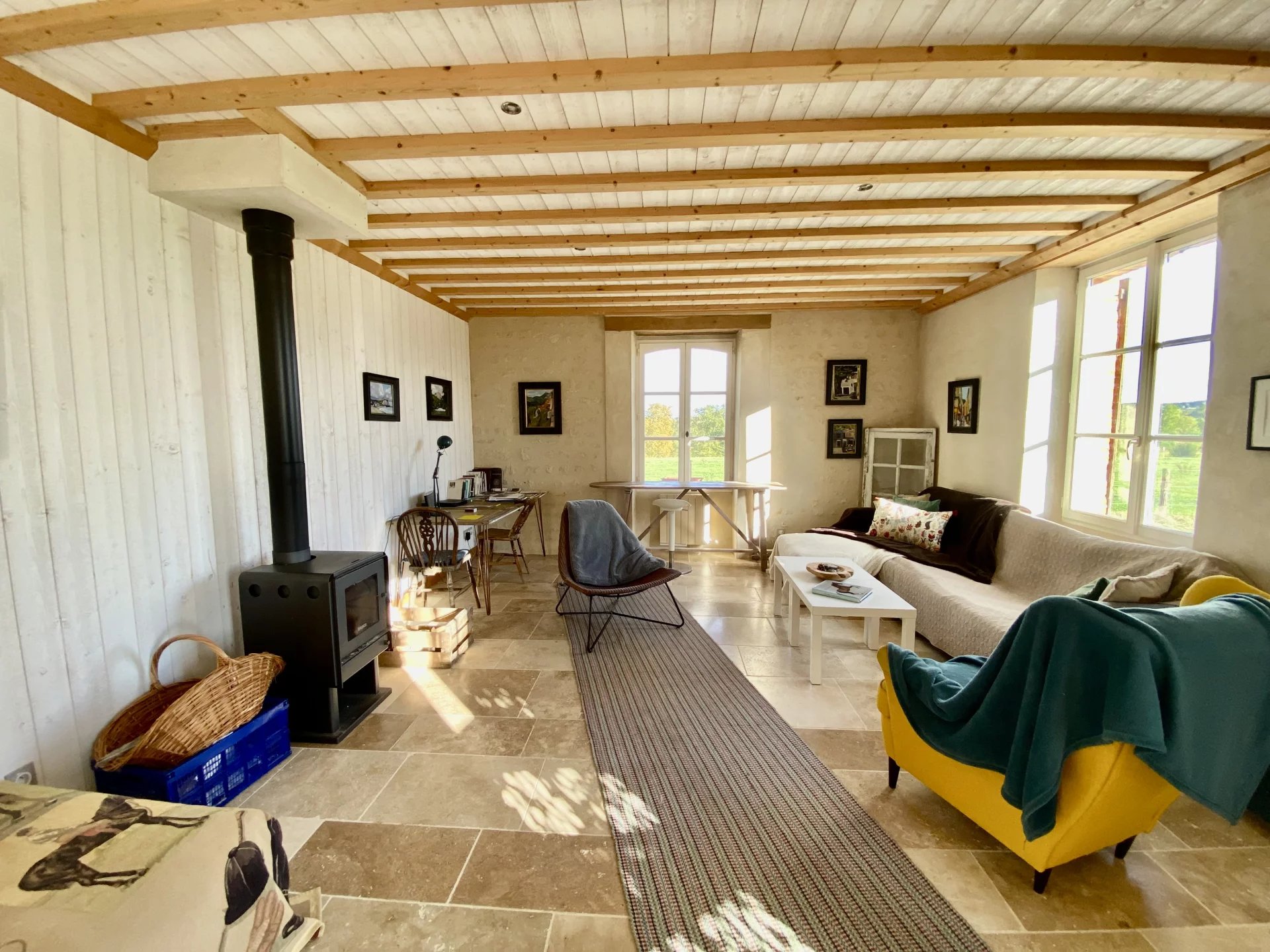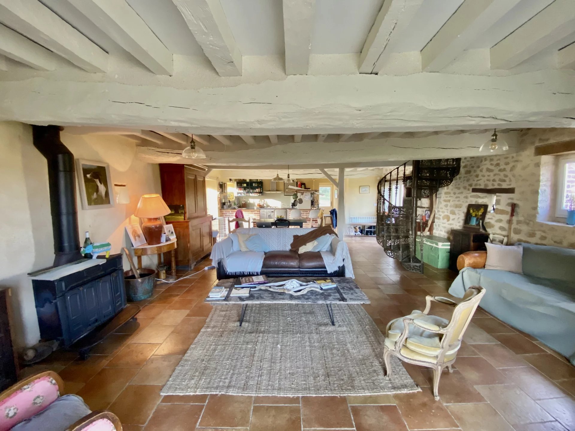 La maison principale de 120 m2 est composée comme suit : un grand séjour chaleureux avec un poêle et des poutres, une cuisine ouverte avec son bar convivial et un WC. Une salle de bain, une salle de douche et quatre chambres occupent l’étage. Un appentis remplit la fonction de buanderie.