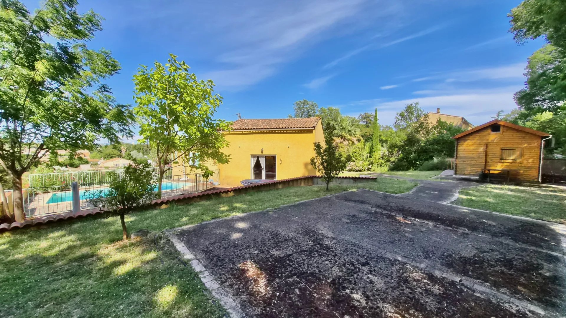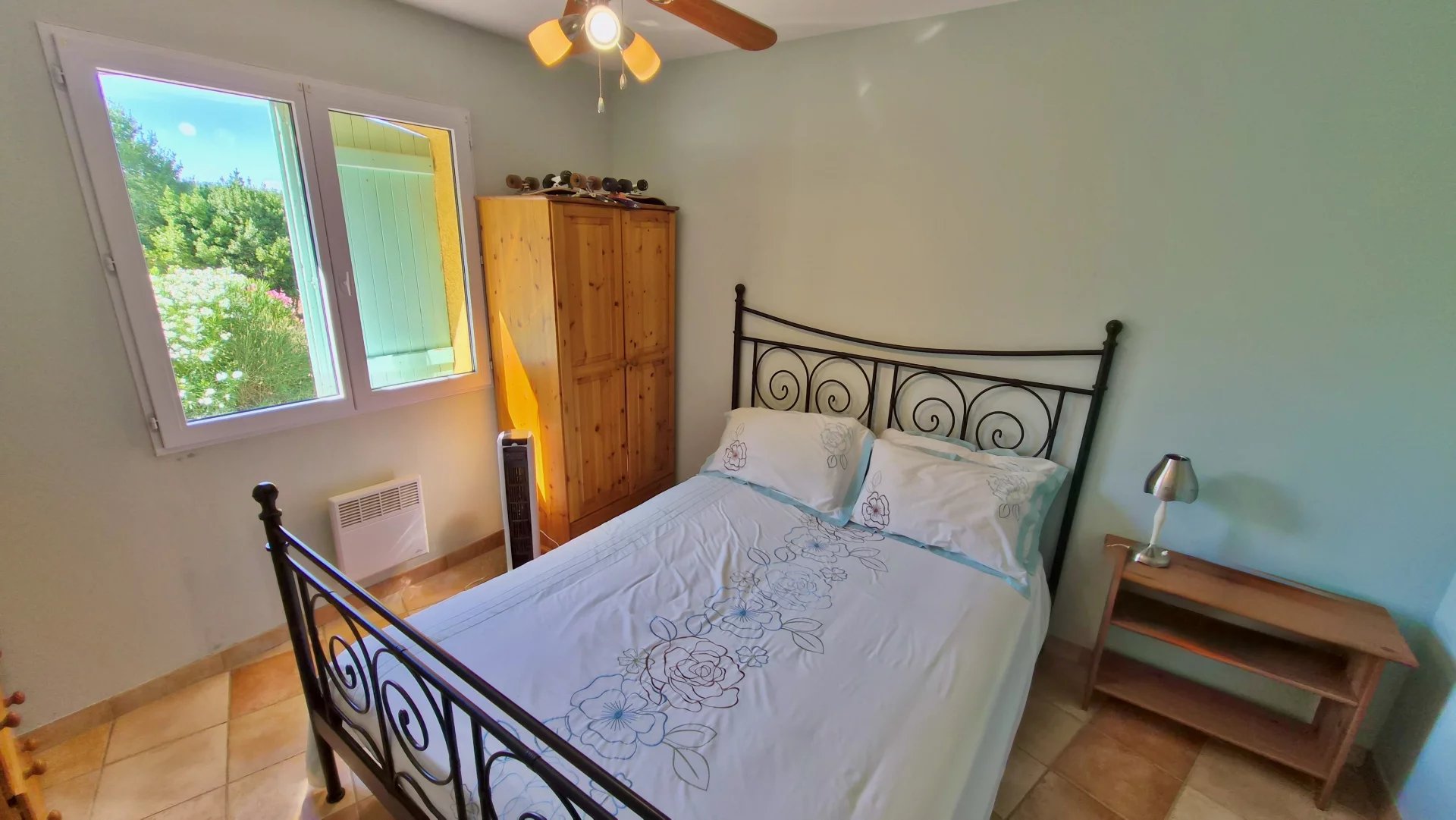 À l’extérieur, le jardin de 1 340 m² est un véritable atout. La piscine profite d’une position privilégiée, surplombant la campagne environnante, offrant un lieu intime et paisible pour se détendre et recevoir sous le soleil méditerranéen.