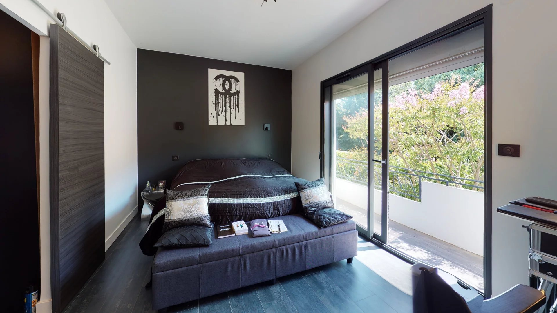 Celui-ci donne directement sur sa terrasse, piscine et son jardin paysagé .