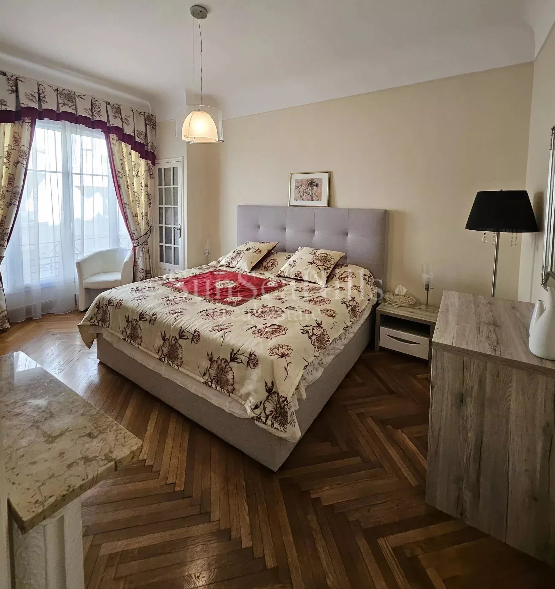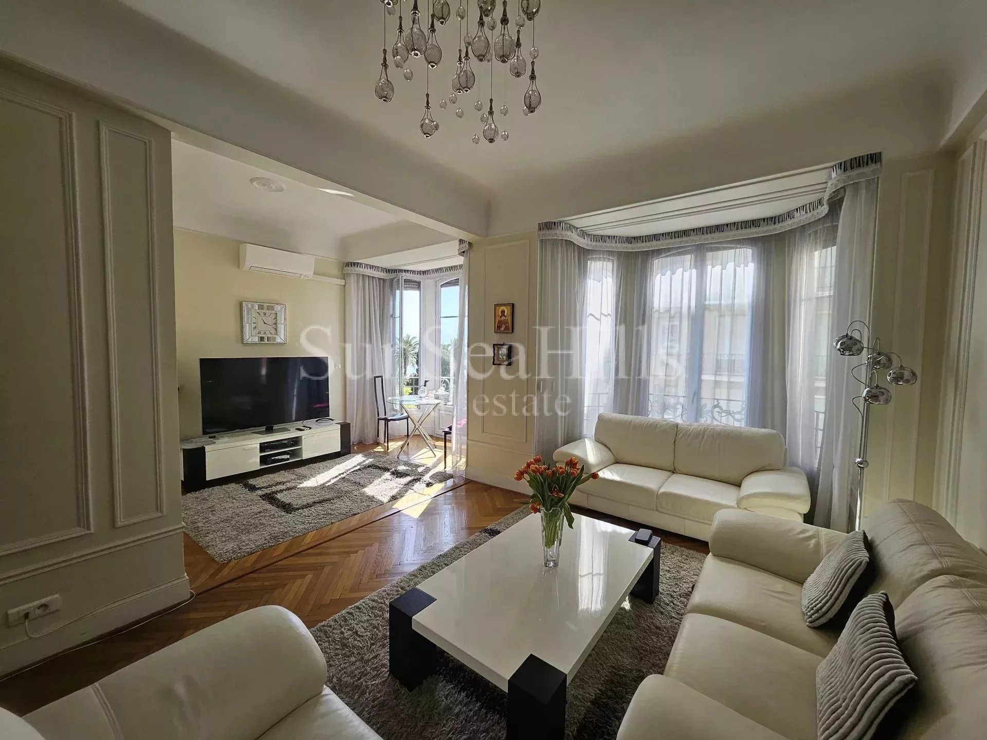 Appartement unique de 115m², niché au sein du prestigieux Gloria Mansion, juste derrière la Promenade des Anglais. Ce bien d'exception se compose de 4 pièces : une entrée accueillante, un vaste salon double aux plafonds hauts, deux spacieuses chambres principales, ainsi qu'une chambre supplémentaire dédiée aux enfants. Vous trouverez également une cuisine indépendante et entièrement équipée, une salle de bain avec toilettes, et une salle de douche avec WC. Une touche supplémentaire de charme est apportée par le petit balcon offrant une vue sur la mer depuis l'une des chambres. Avec sa rénovation soignée et ses meubles inclus, cet appartement offre un cadre de vie exceptionnel à ses futurs résidents.