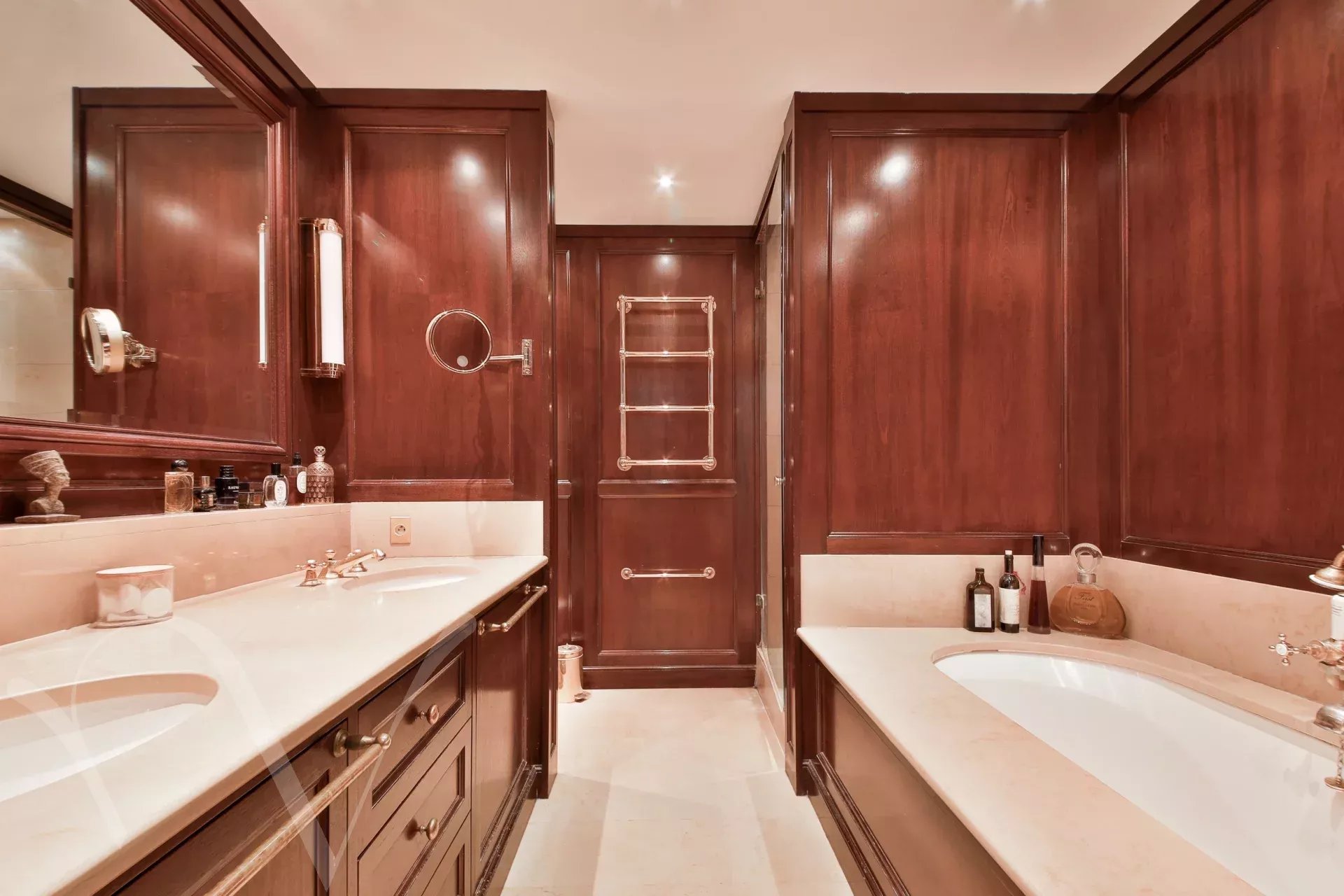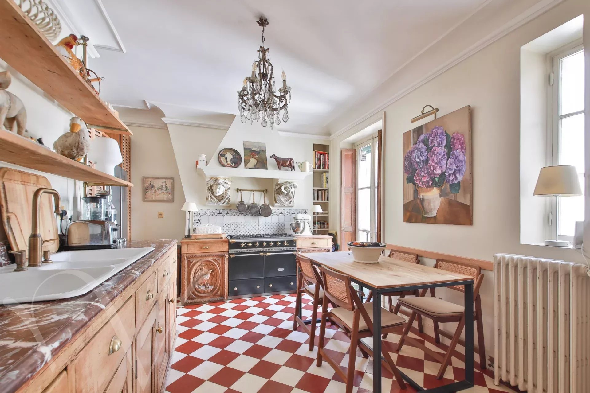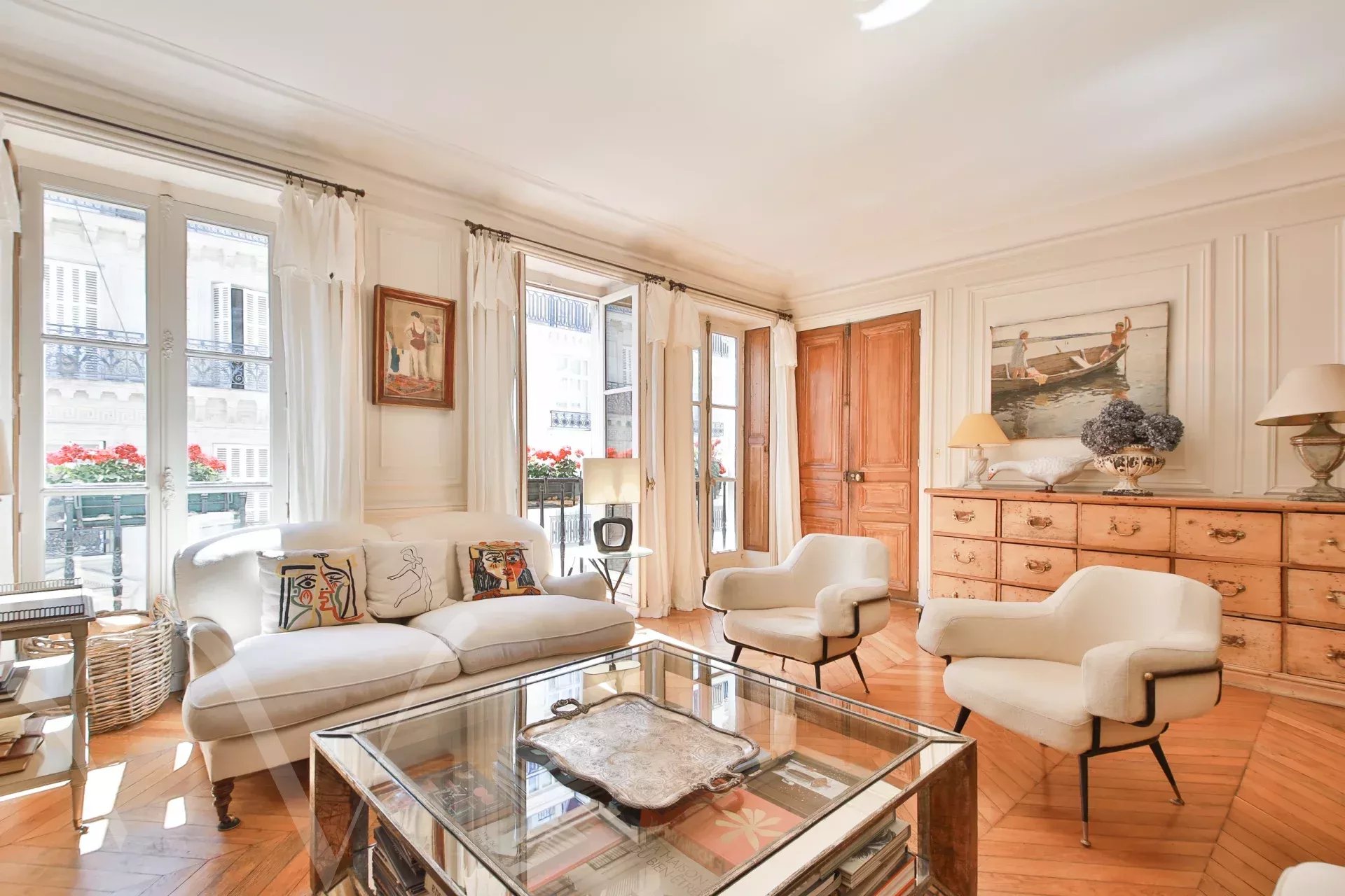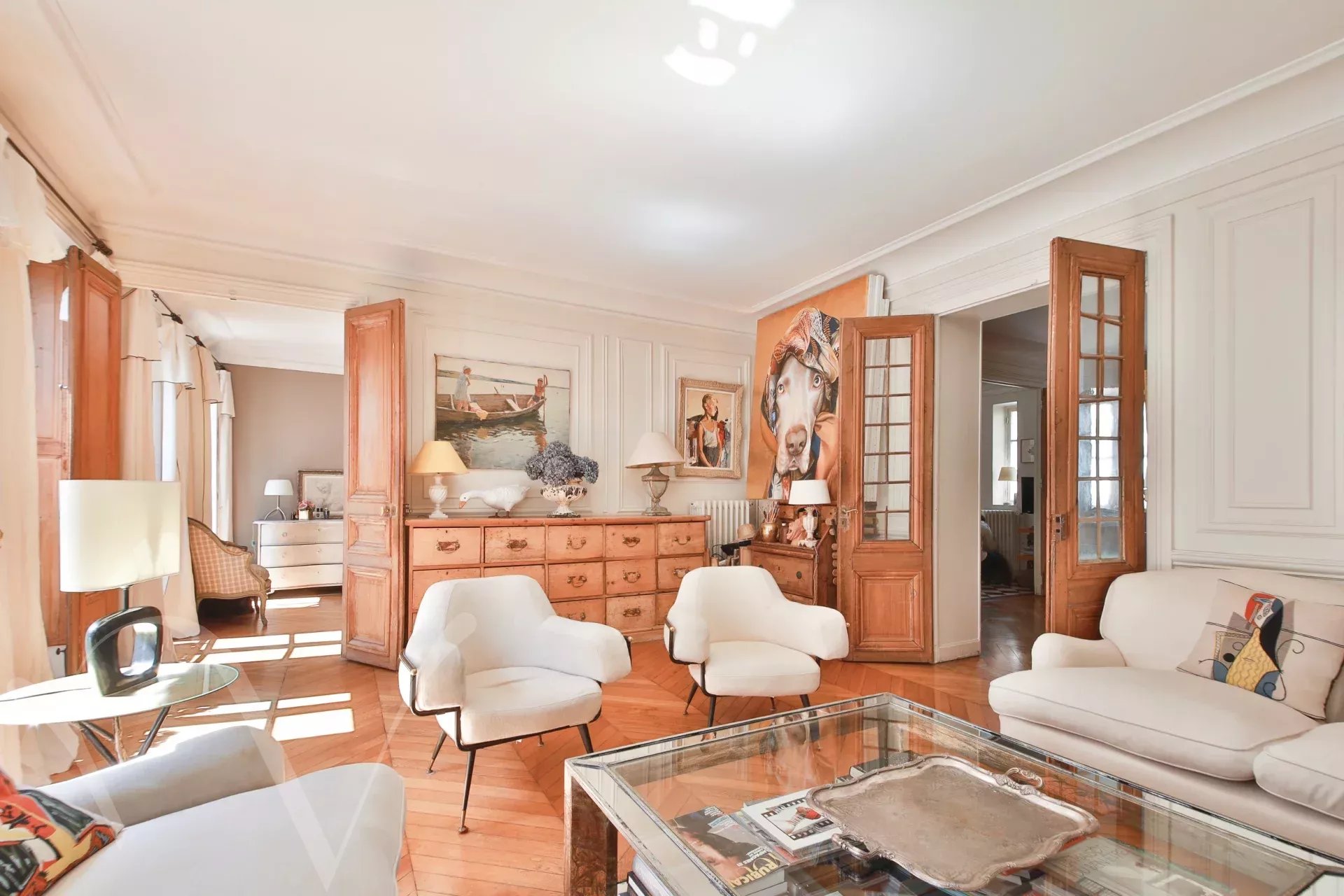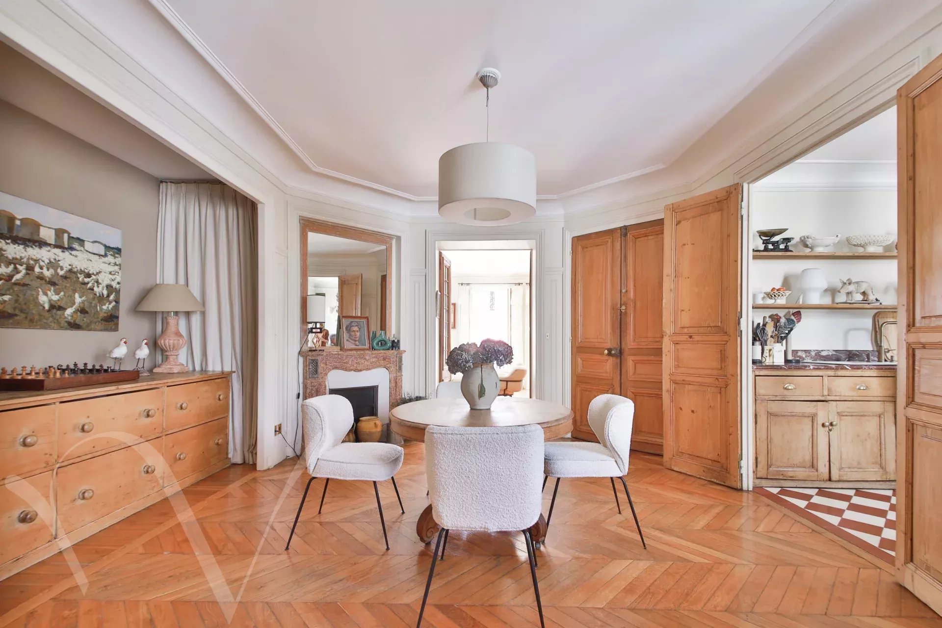 Quartier Bac / Grenelle. Dans un immeuble en pierre de taille au 4e étage avec ascenseur, un appartement traversant de 140 m² loi carrez, exposé est et ouest, composé d'une entrée desservant la salle à manger avec la cuisine contiguë, le salon, trois chambres, une salle de bains et une salle de douche. Chambres climatisées.