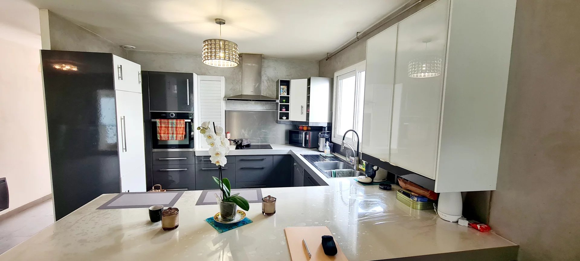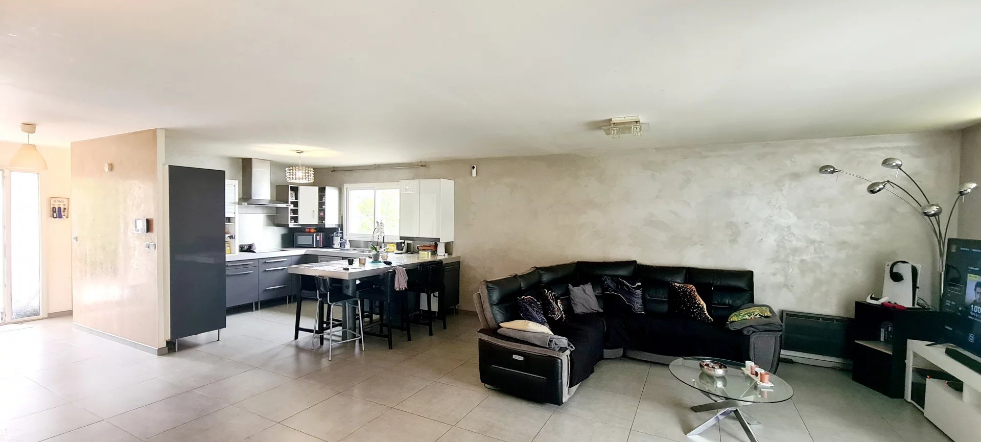 -Une grande pièce de vie lumineuse avec cuisine américaine équipée, ouverte sur une superbe véranda pour des moments conviviaux.