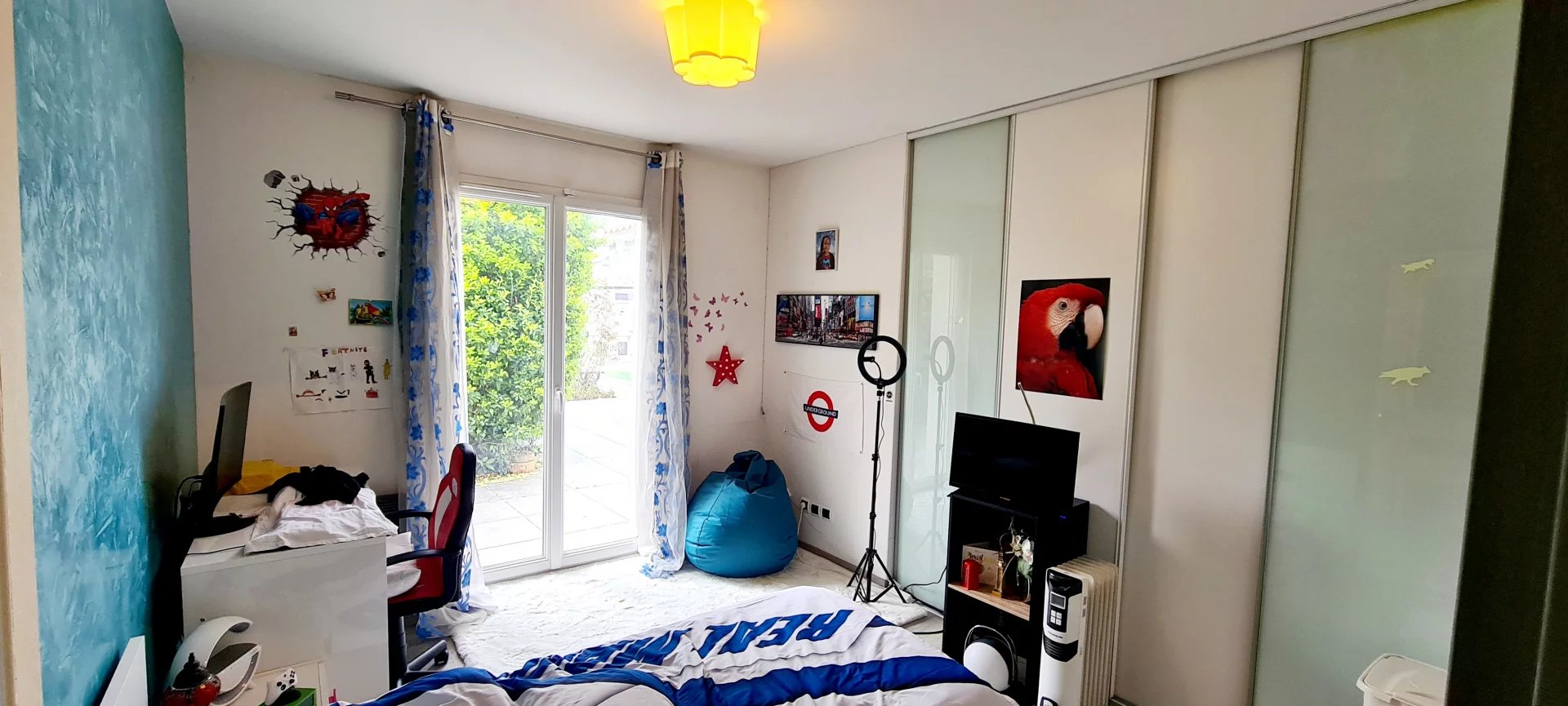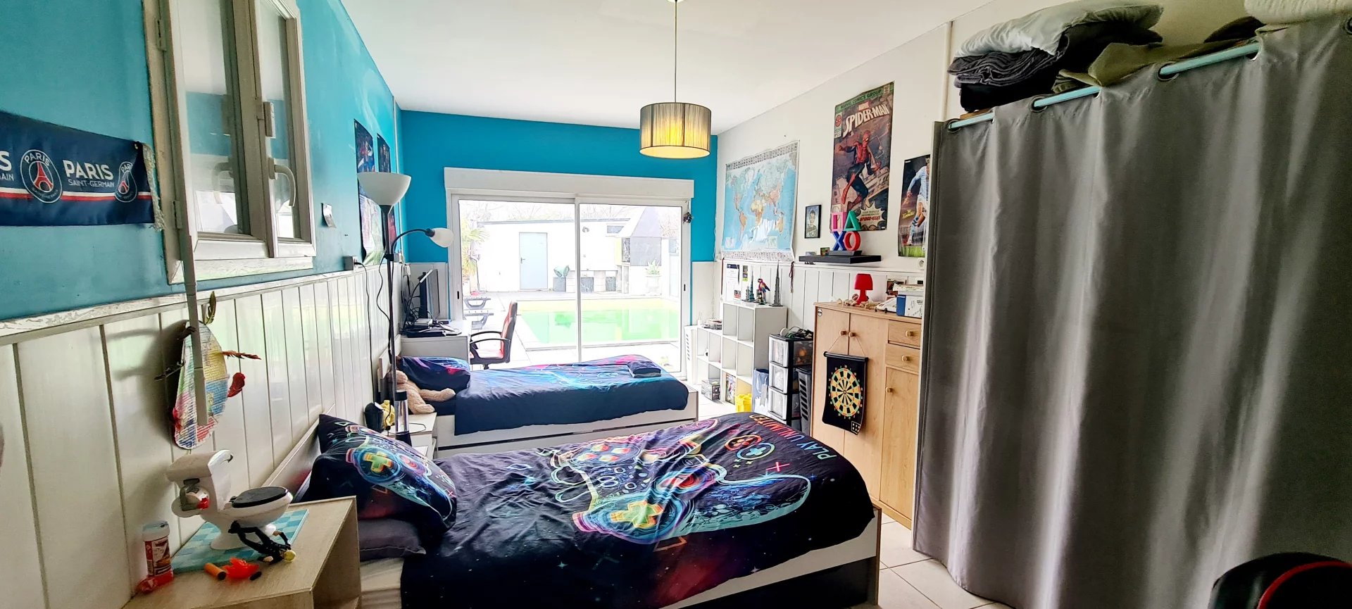 -Une grande chambre ou salle de jeu, avec vue directe sur la piscine, idéale pour se divertir ou se relaxer.