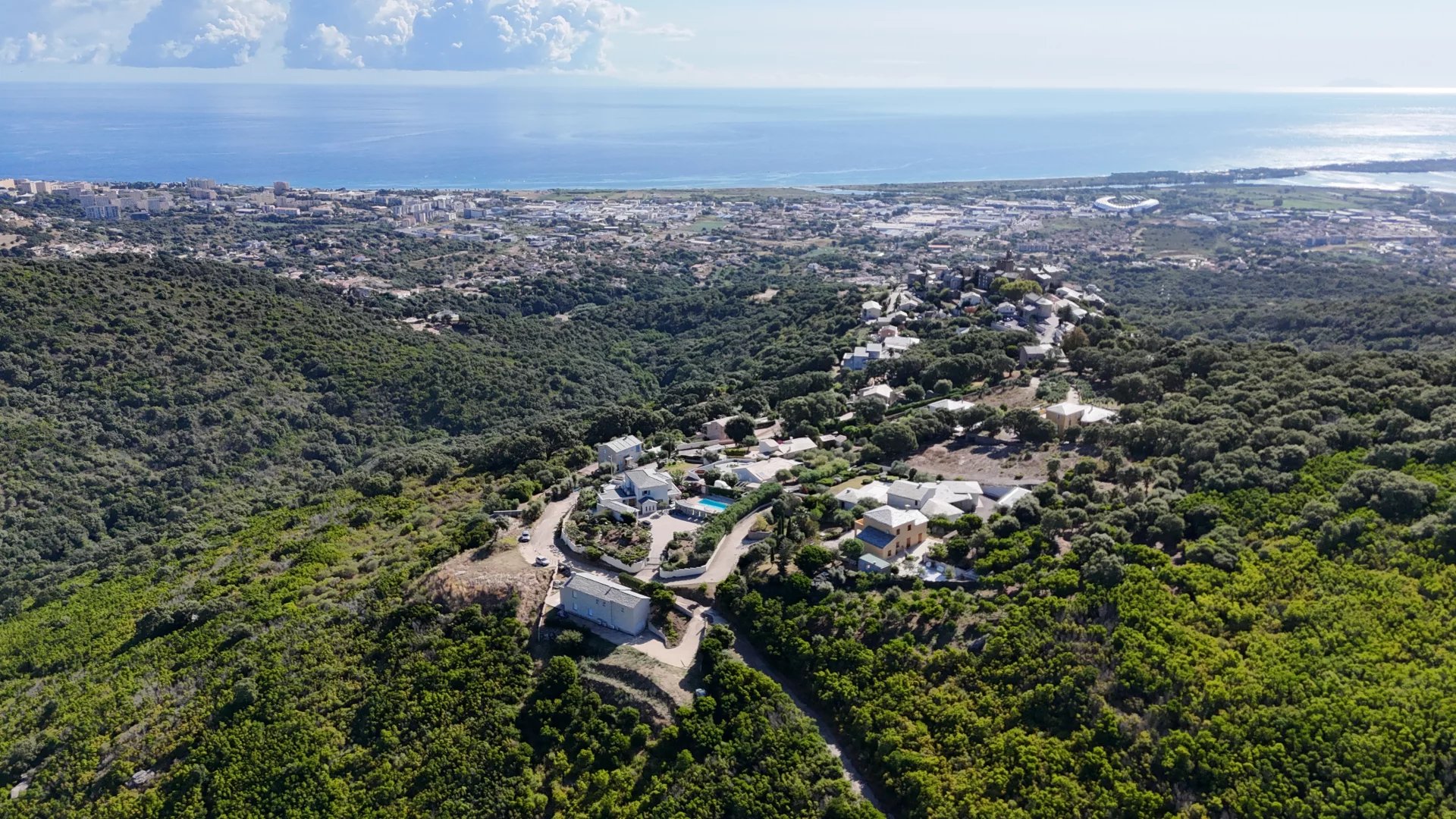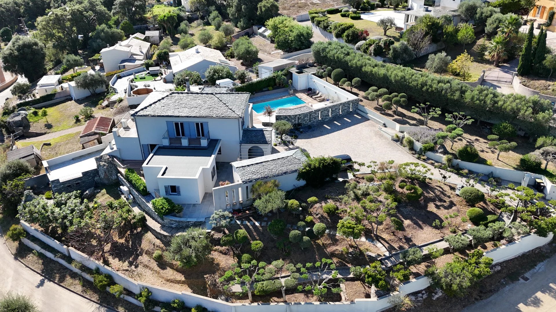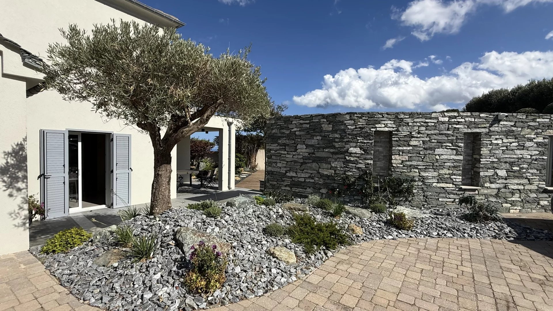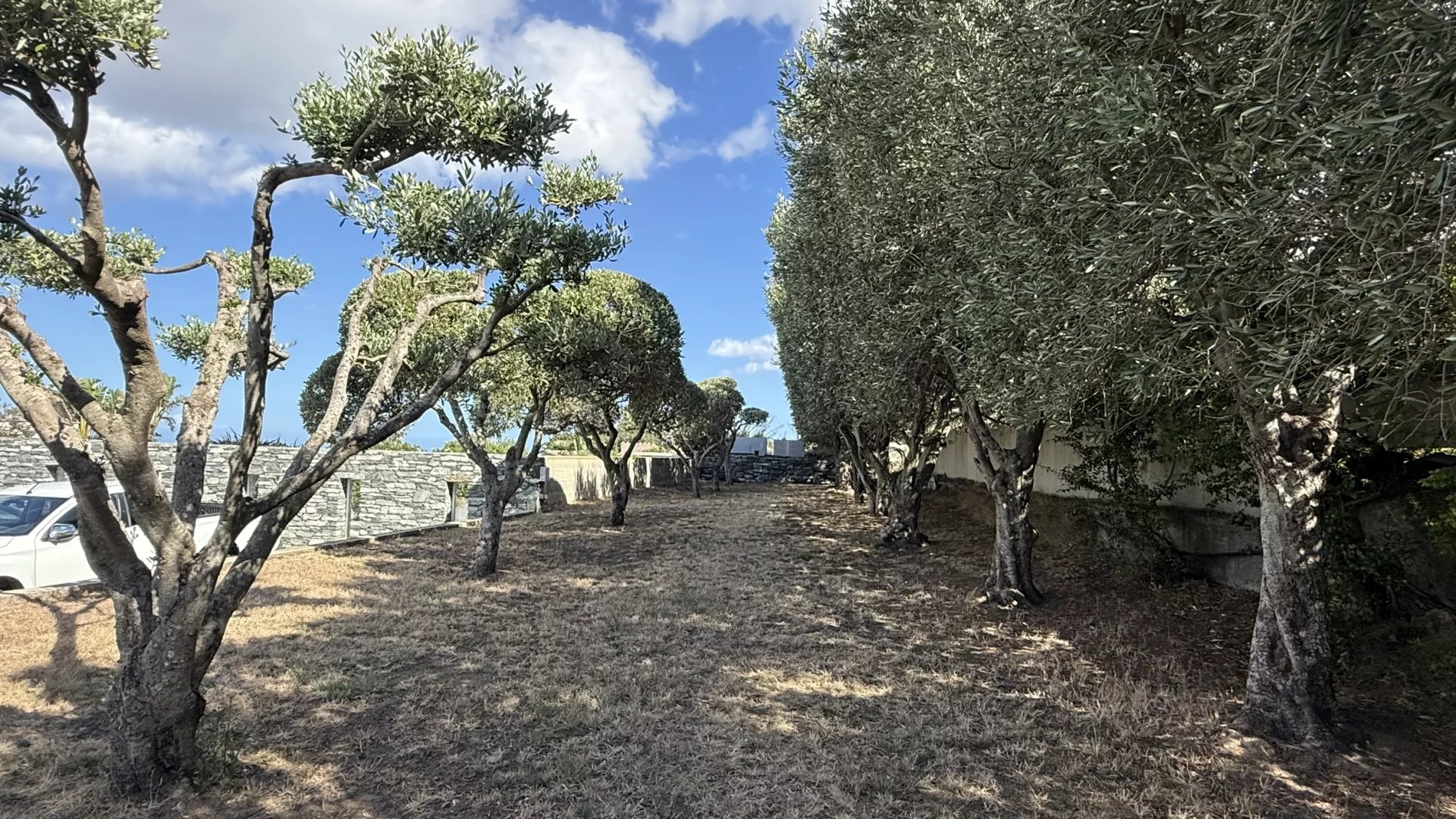 Un terrain clôt de 2000 m2 planté d’oliviers, d’essences naturels endémiques et de plantes exotiques côté piscine / portail électrique coulissant.