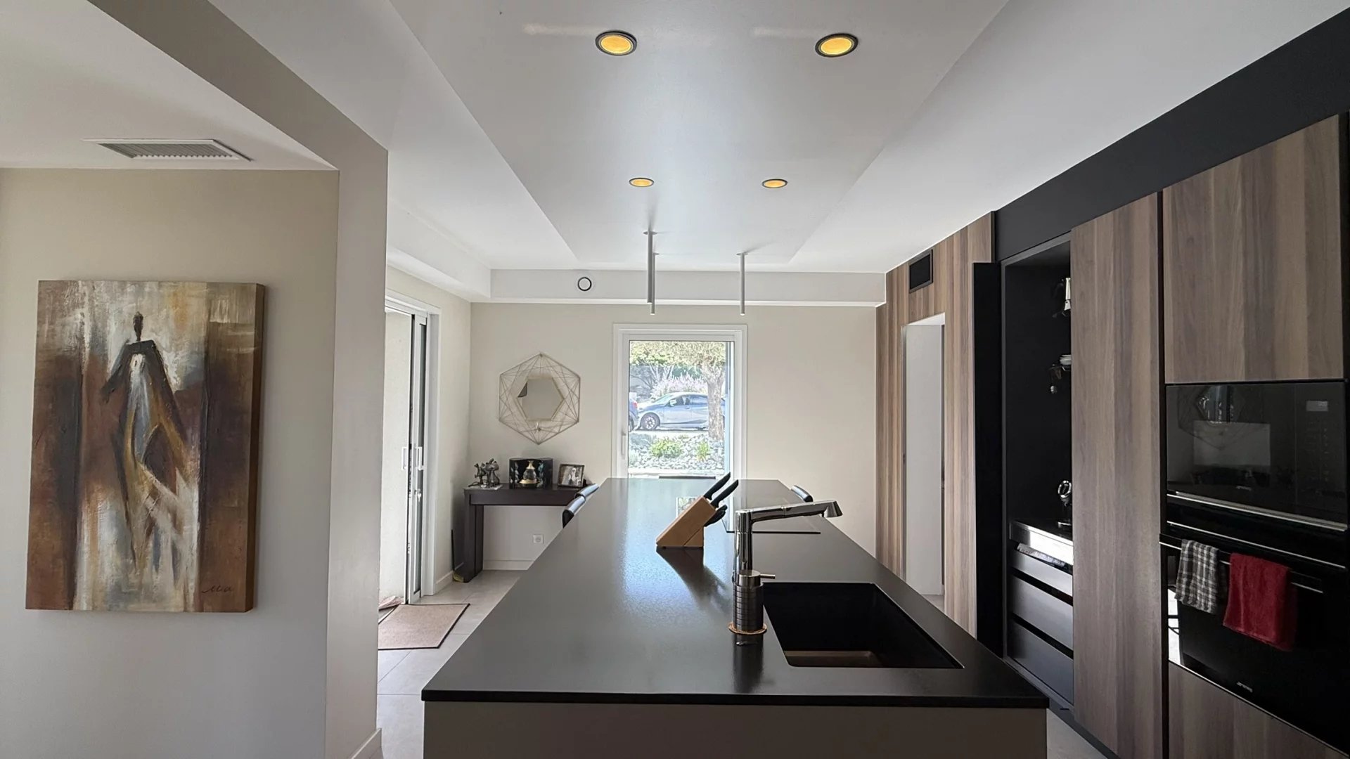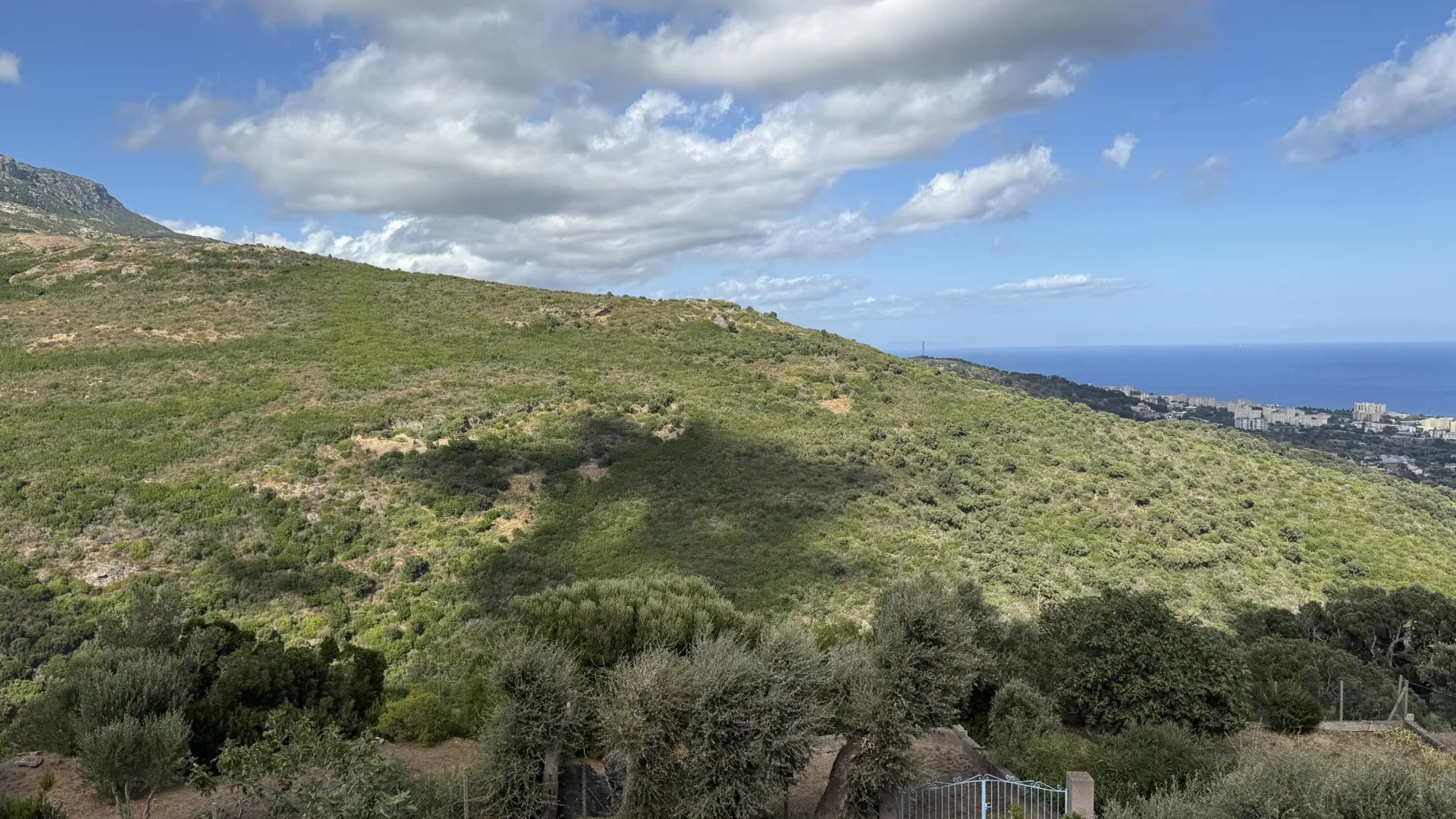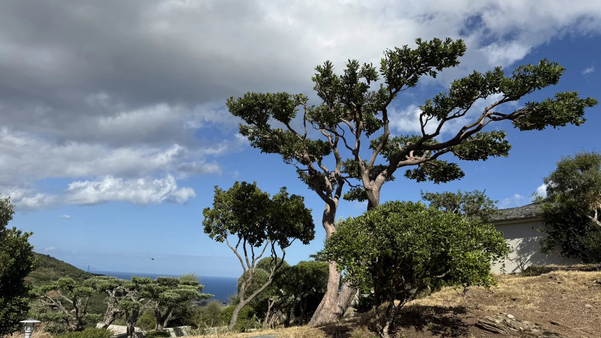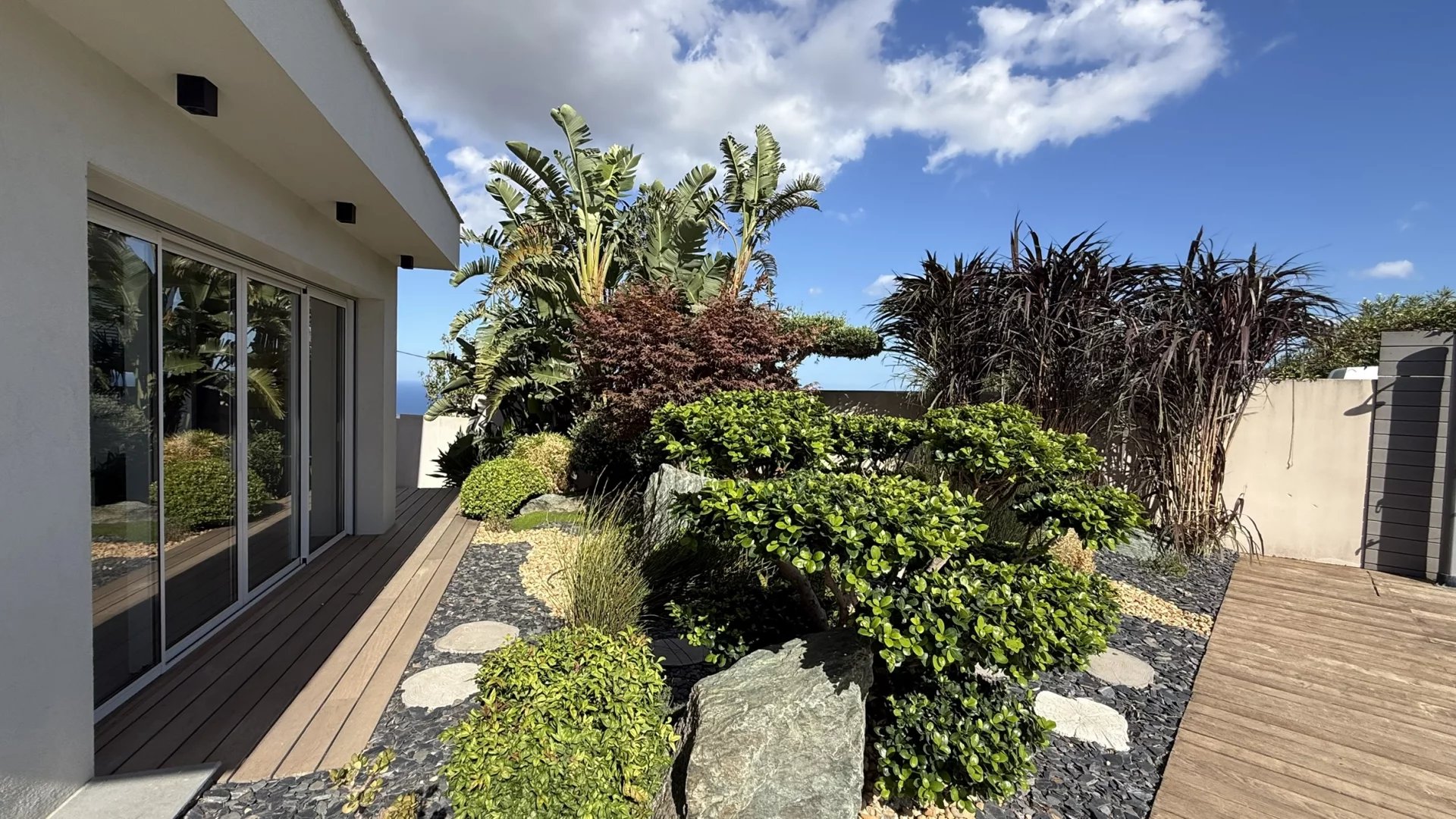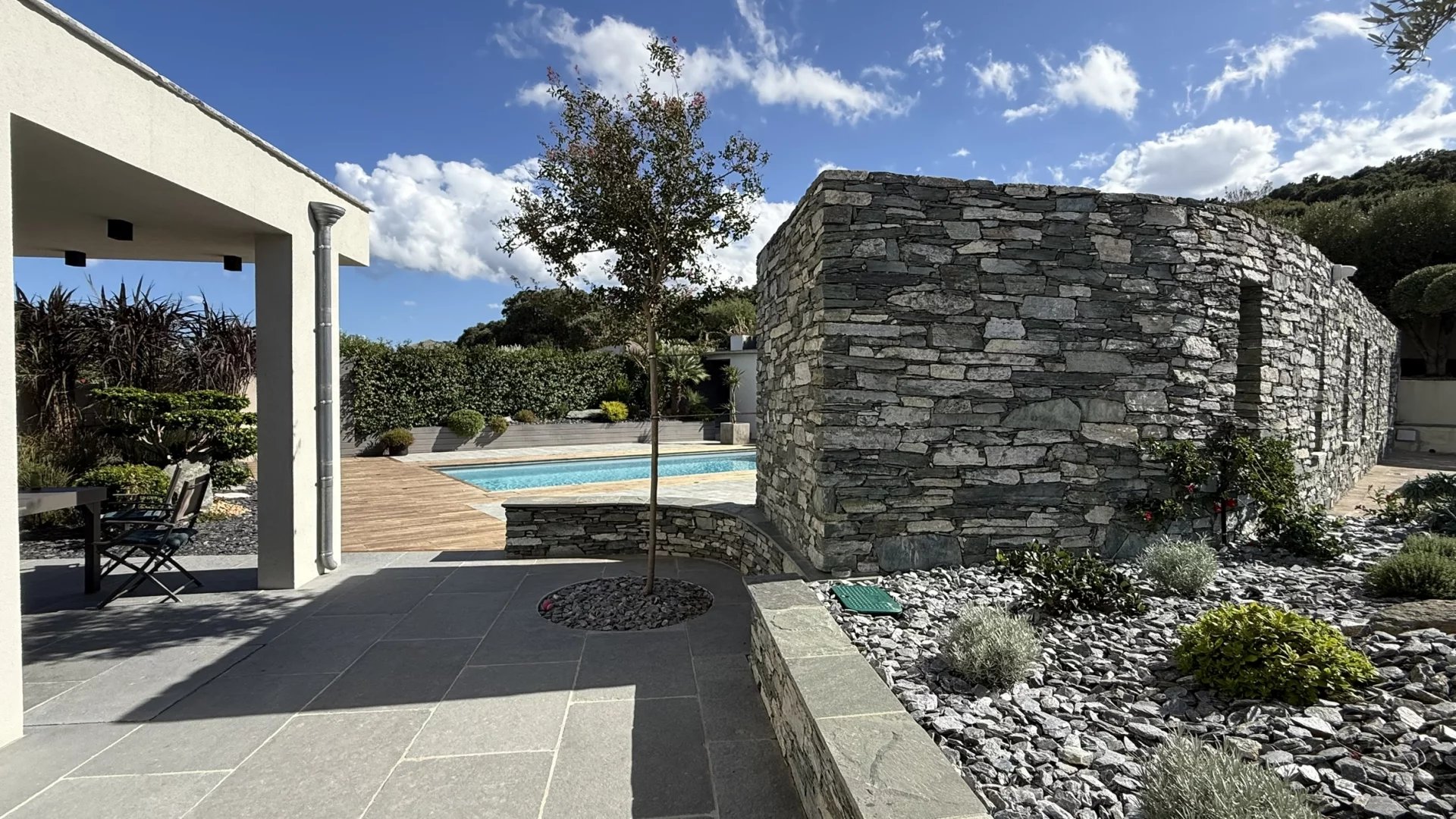 Un terrain clôt de 2000 m2 planté d’oliviers, d’essences naturels endémiques et de plantes exotiques côté piscine / portail électrique coulissant.