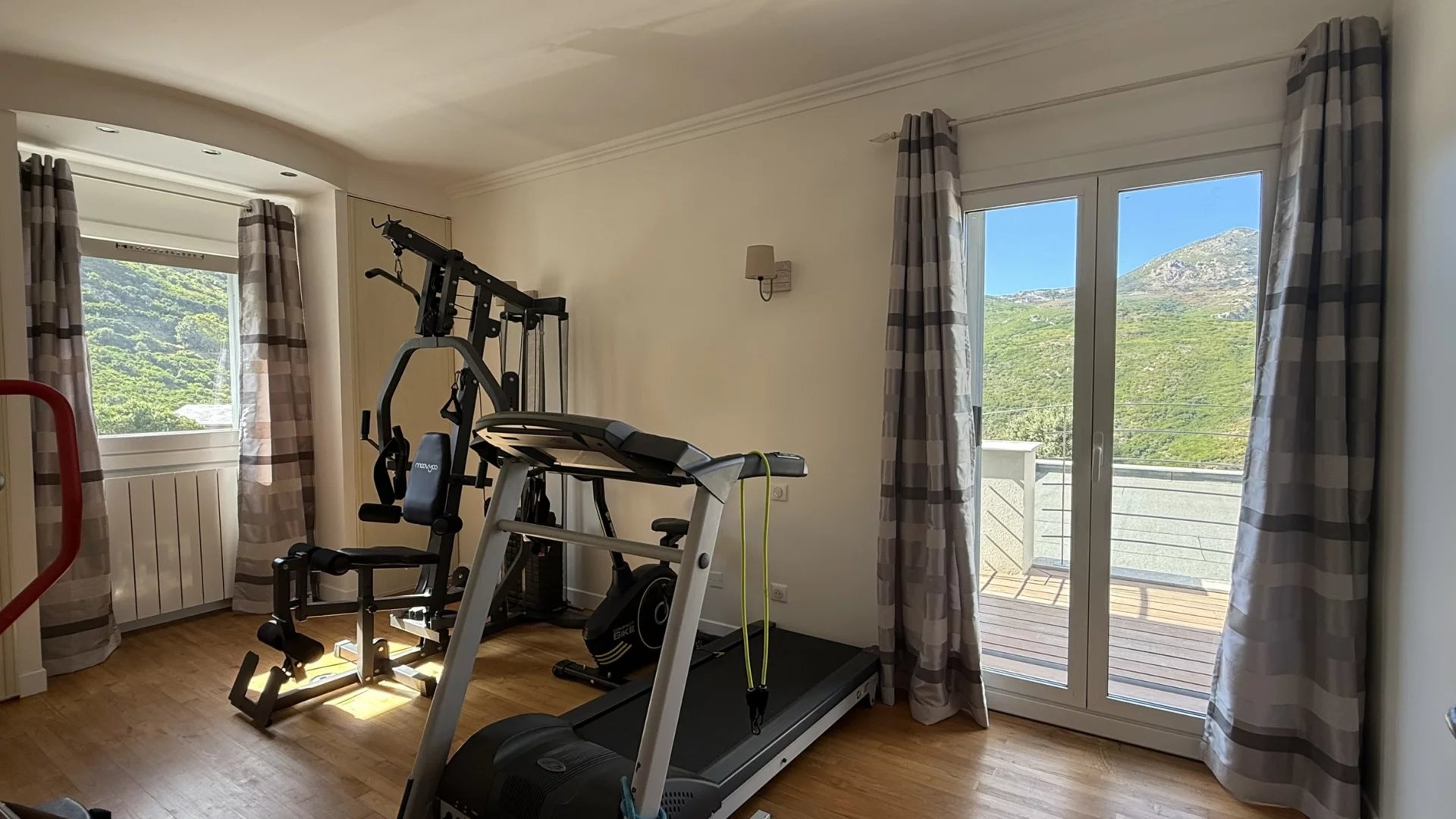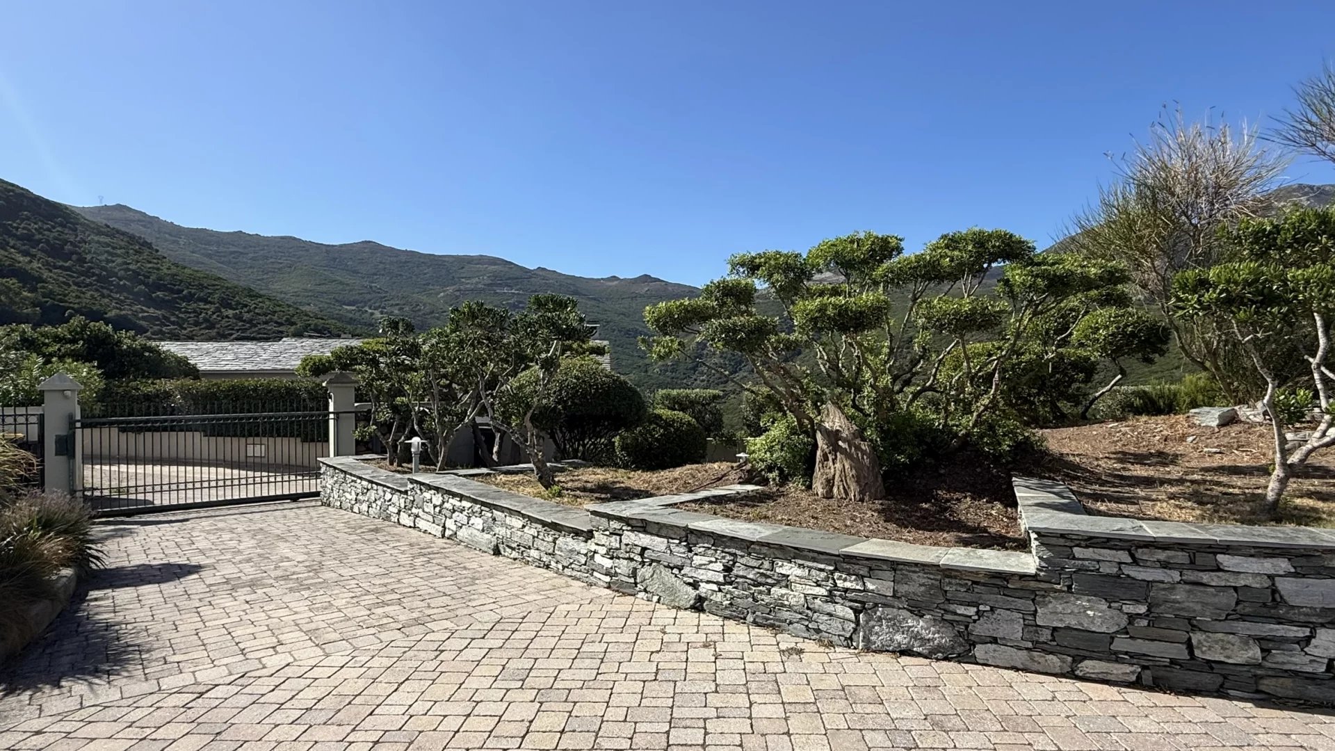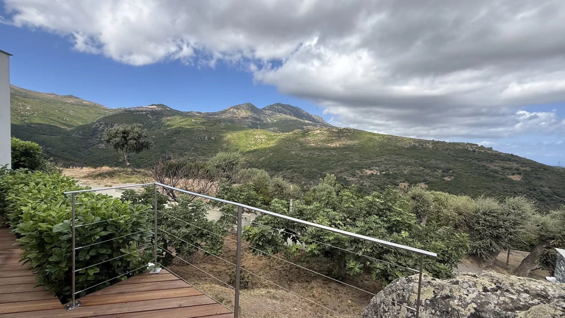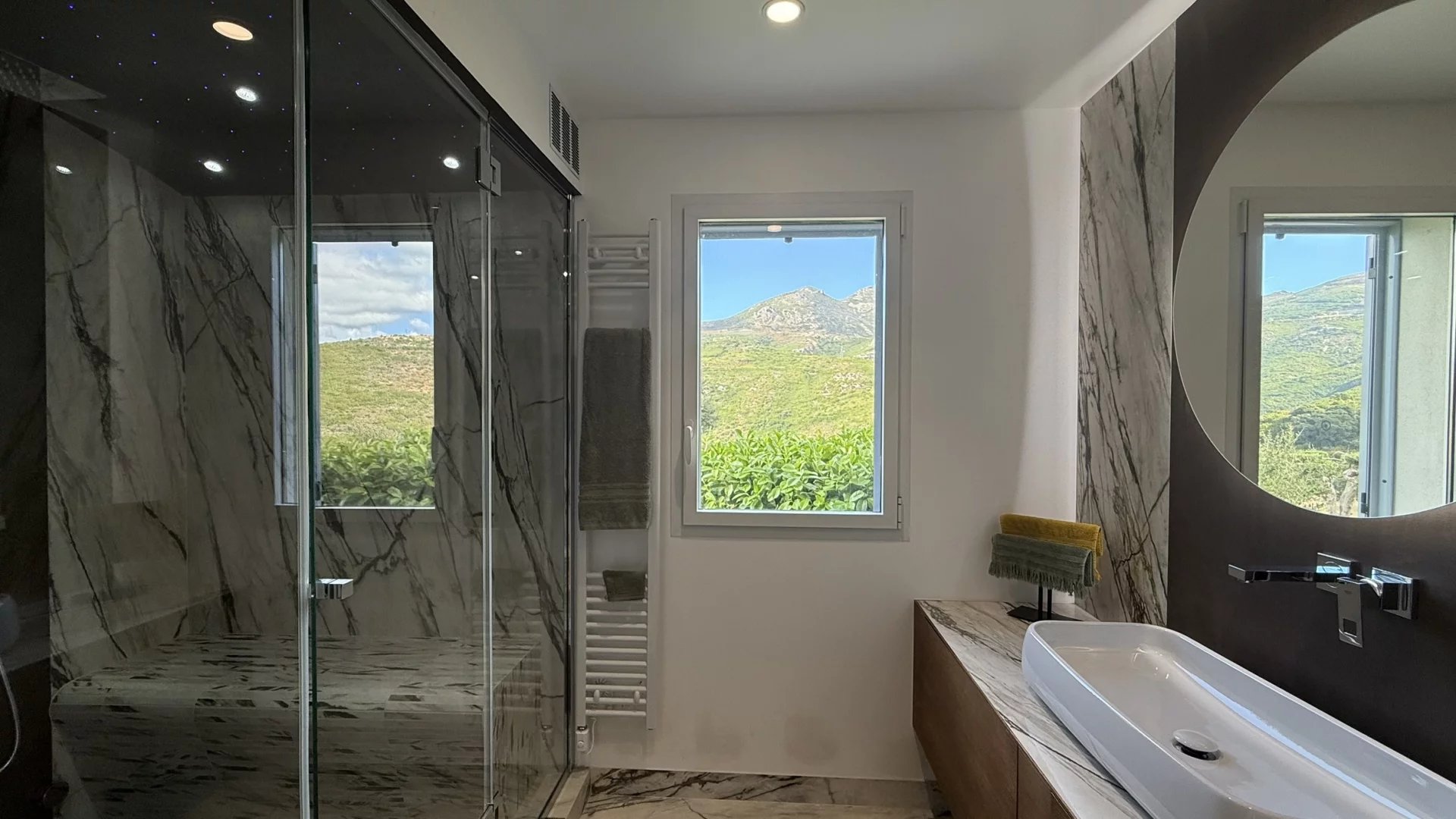 Elle se compose d'un hall d'entrée, d'une spacieuse pièce de vie avec cheminée et son accès terrasse vue mer et montagne, une cuisine moderne équipée et son arrière cuisine, un coin repas et son accès terrasse côté piscine, une chambre parentale avec dressing salle de douche et sa terrasse vue mer, un toilette à l’entrée, une buanderie agencée, à l'étage une chambre parentale avec salle de bain et douche vue mer et montagne, deux autres chambres avec terrasse vue mer et montagne, une salle de bain et douche, un toilette.
