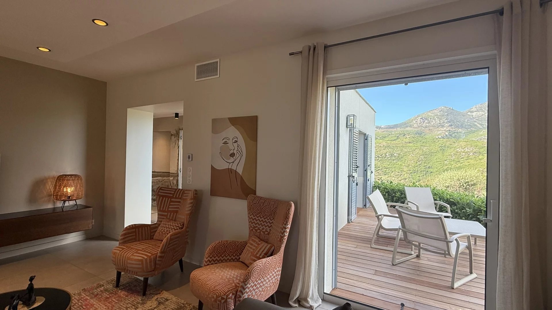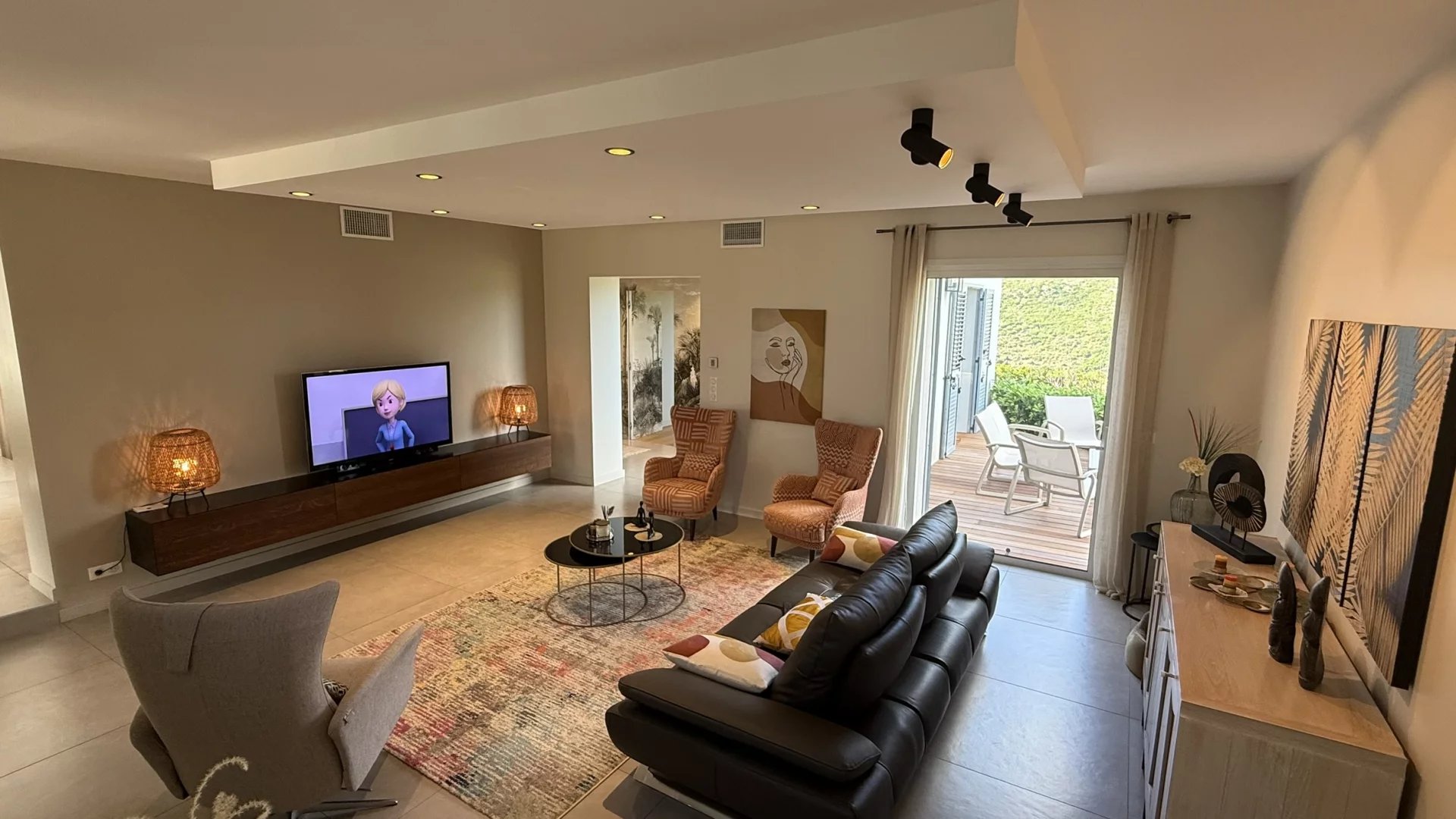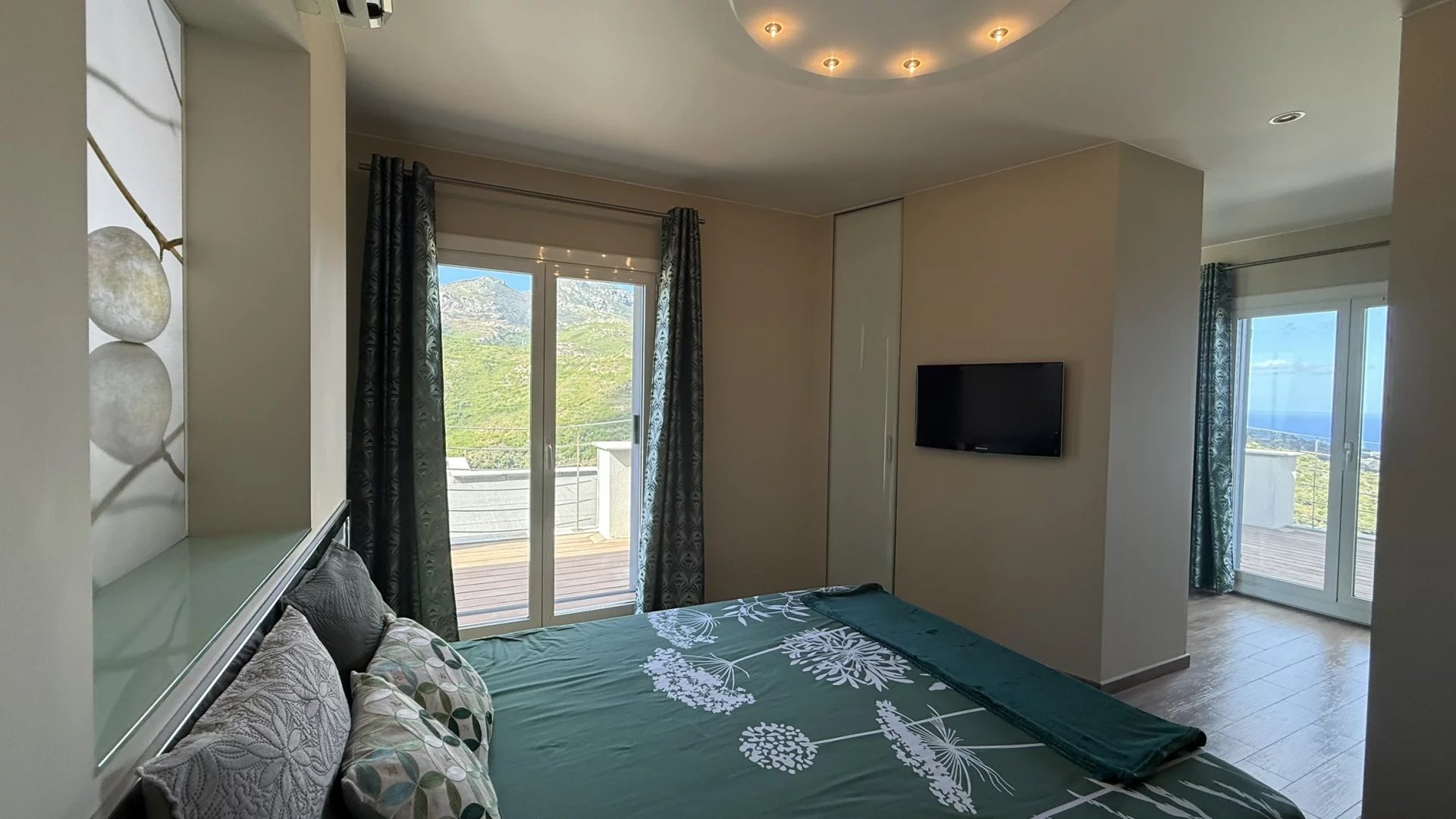 Elle se compose d'un hall d'entrée, d'une spacieuse pièce de vie avec cheminée et son accès terrasse vue mer et montagne, une cuisine moderne équipée et son arrière cuisine, un coin repas et son accès terrasse côté piscine, une chambre parentale avec dressing salle de douche et sa terrasse vue mer, un toilette à l’entrée, une buanderie agencée, à l'étage une chambre parentale avec salle de bain et douche vue mer et montagne, deux autres chambres avec terrasse vue mer et montagne, une salle de bain et douche, un toilette.