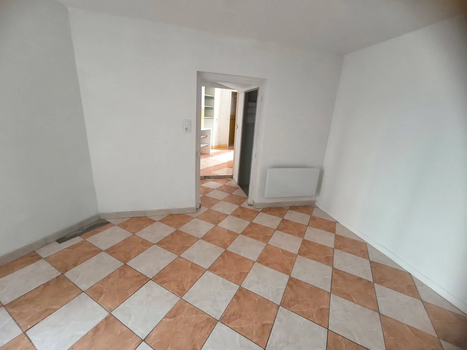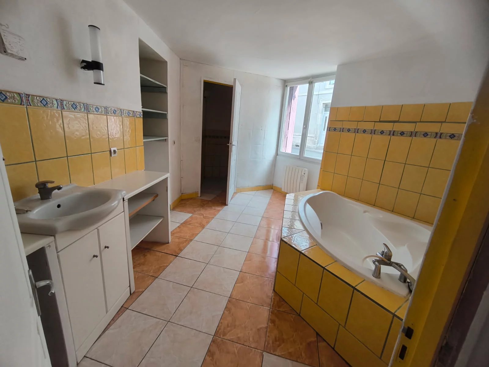 Rez-de-chaussée : appartement rénové (menuiseries PVC double vitrage, électricité refaite), actuellement loué 550 €/mois, comprenant une salle de bain avec baignoire d’angle.
