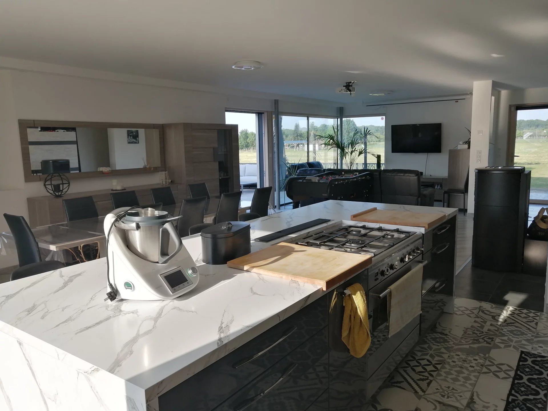 Grande pièce de vie lumineuse avec cuisine ouverte et poêle à granulés hydraulique.