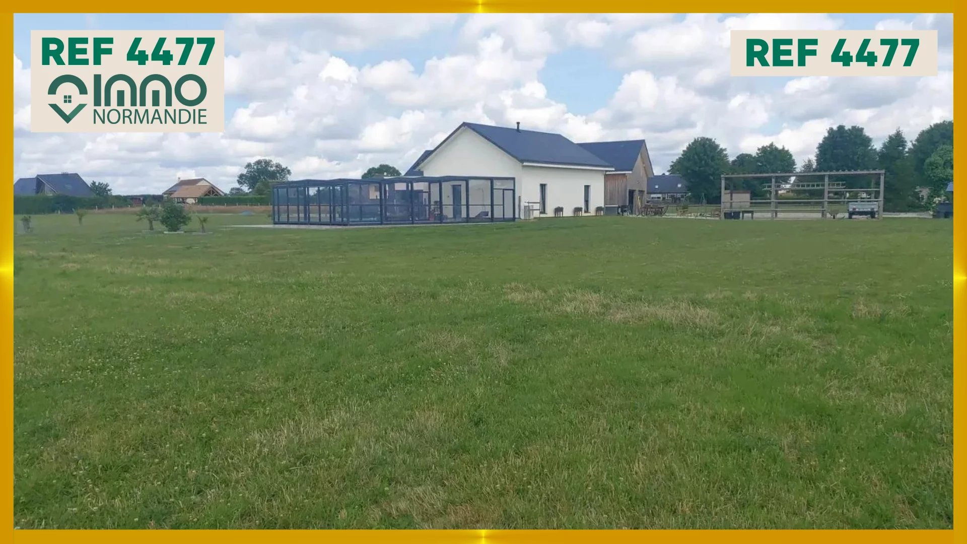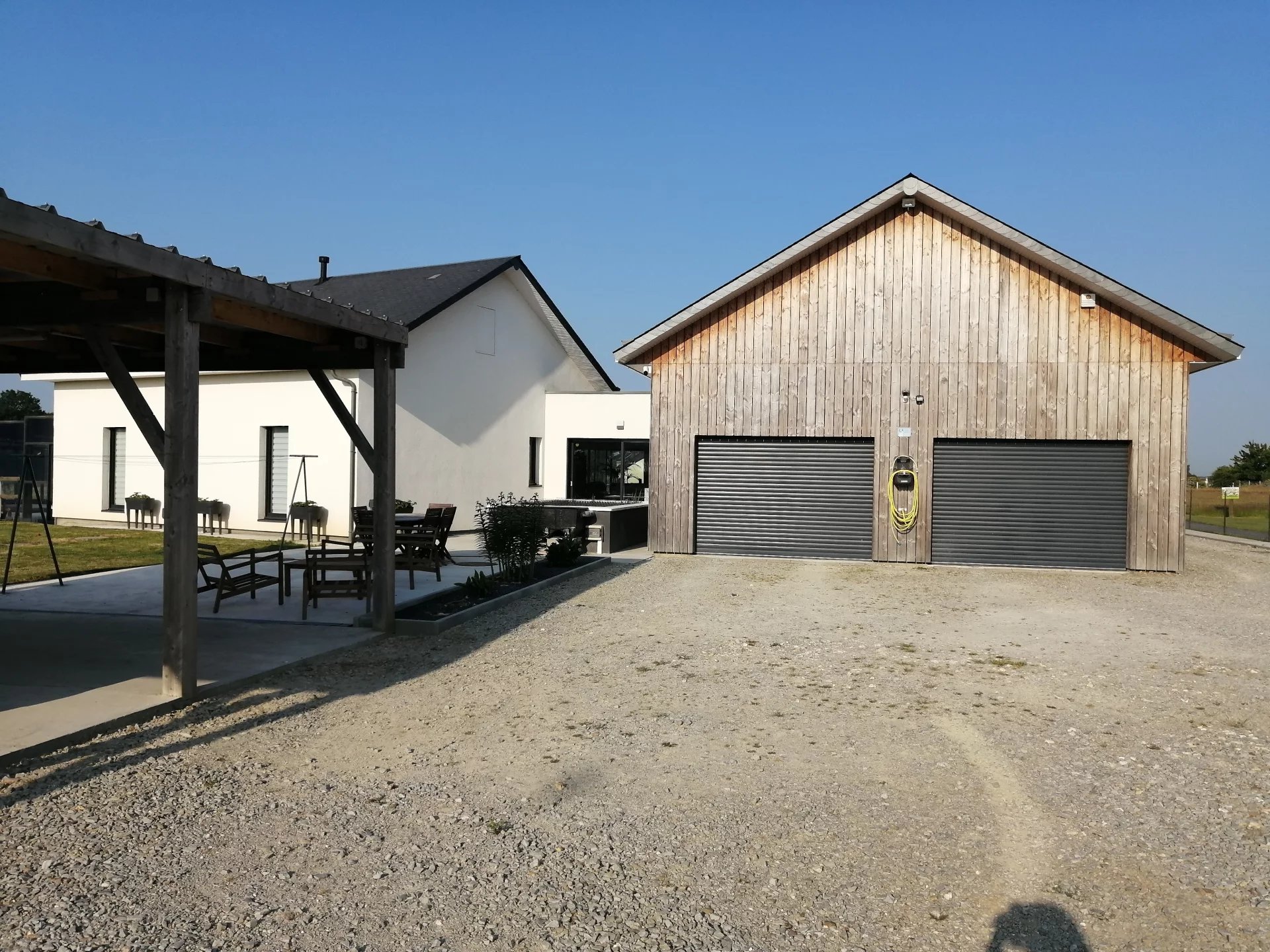 Double garage, buanderie, carport pour plusieurs véhicules et charreterie.