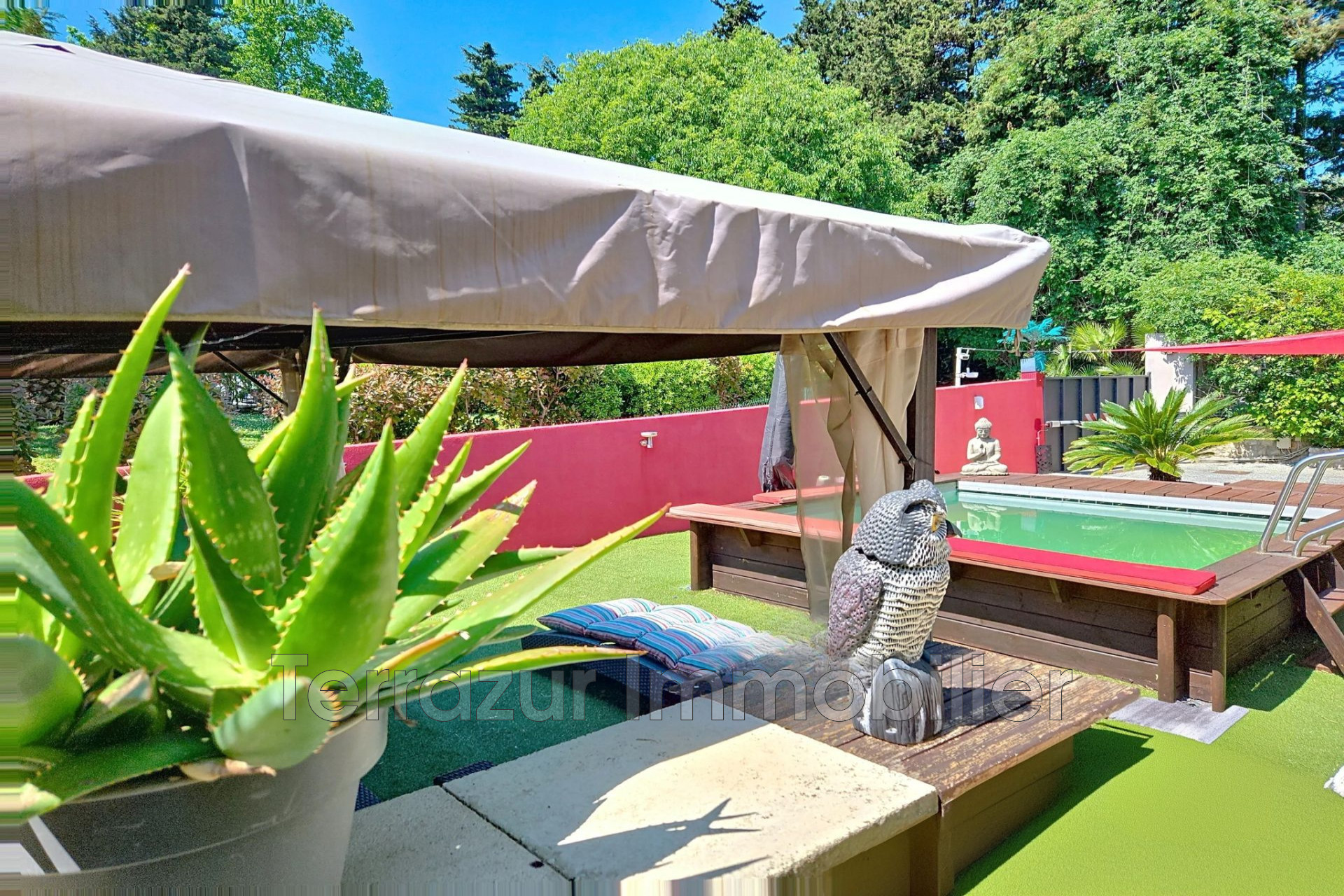 À l'extérieur, profitez d'un jardin intimiste sans vis-à-vis agrémenté d'un espace longe avec une piscine.