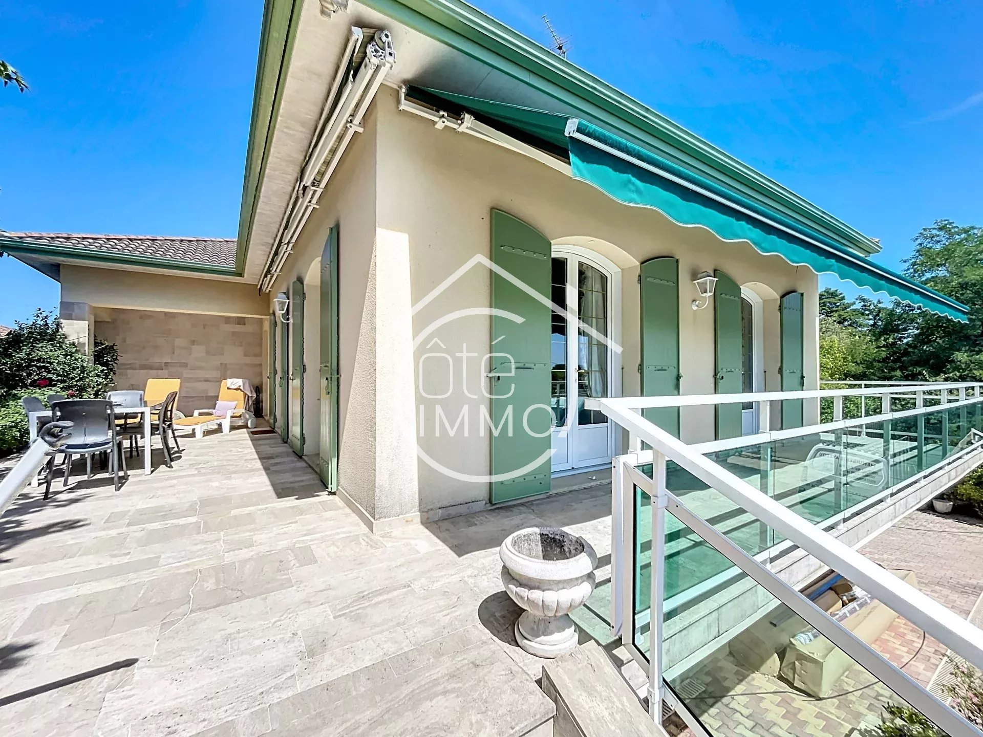 À l’arrière, le rez-de-chaussée semi-enterré s’organise autour d’une vaste pièce de vie de plus de 40 m², complétée par un cellier, un bureau, un garage et une cave. Deux larges baies vitrées ouvrent sur le jardin et donnent accès à une terrasse de plus de 100 m².
