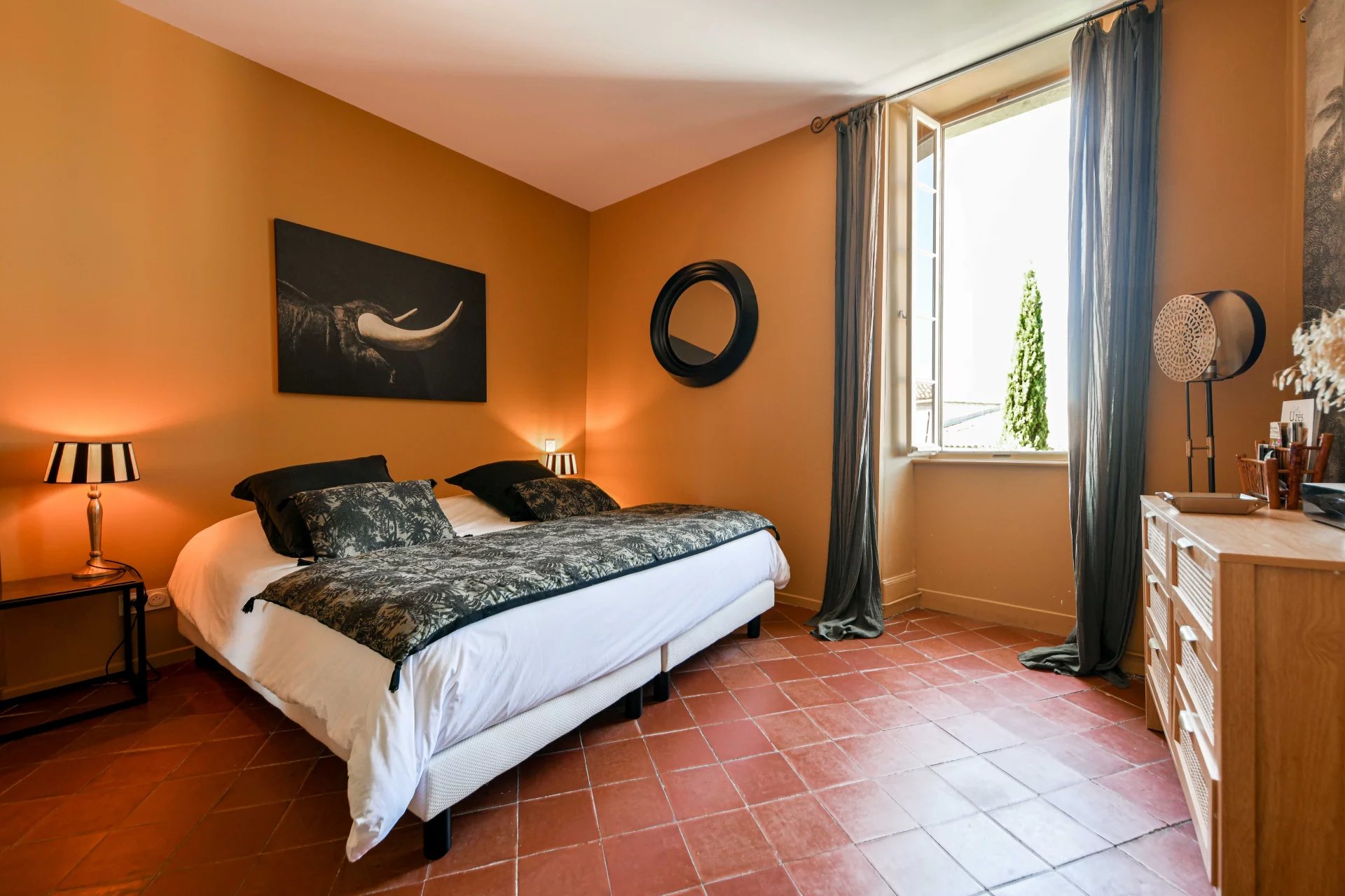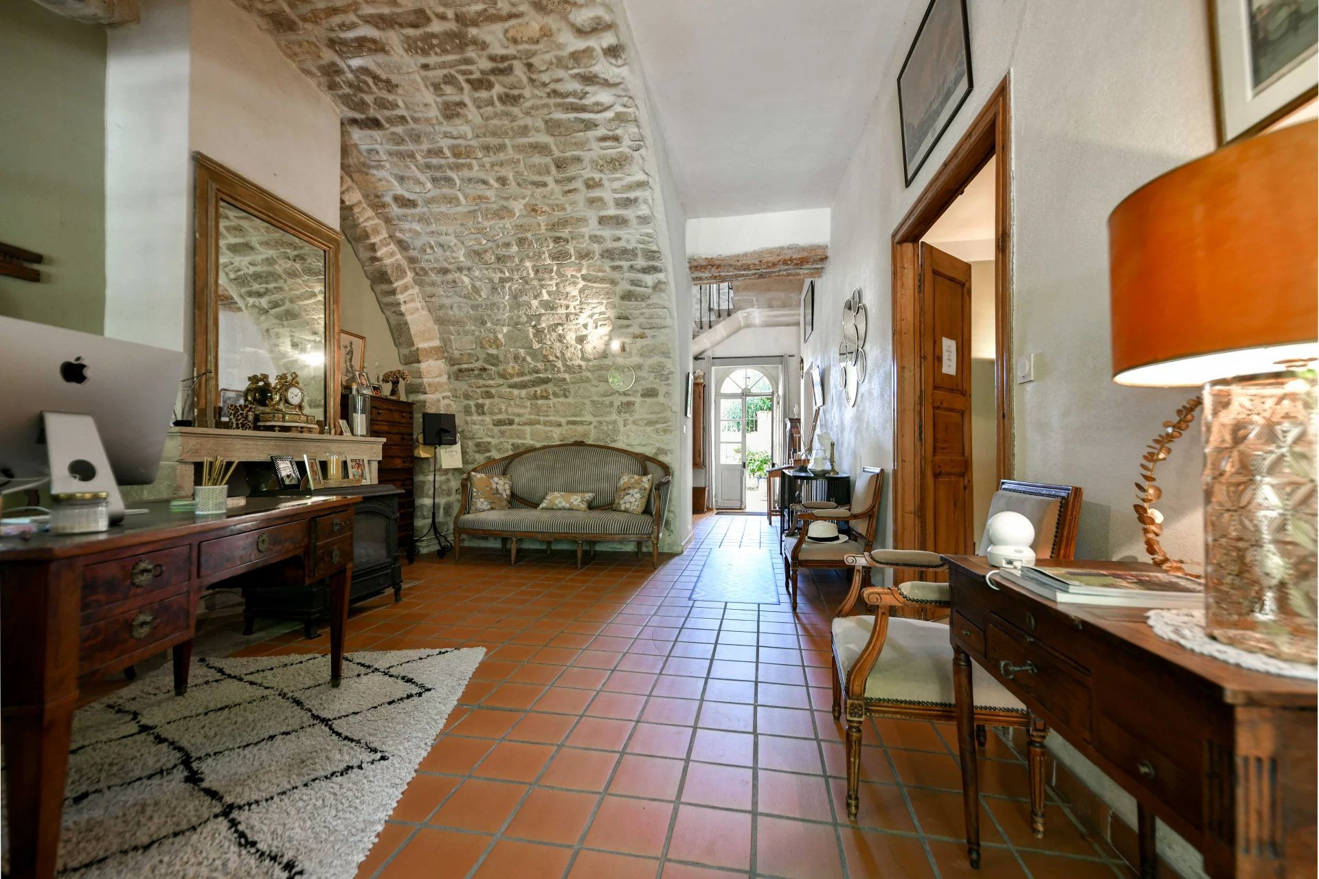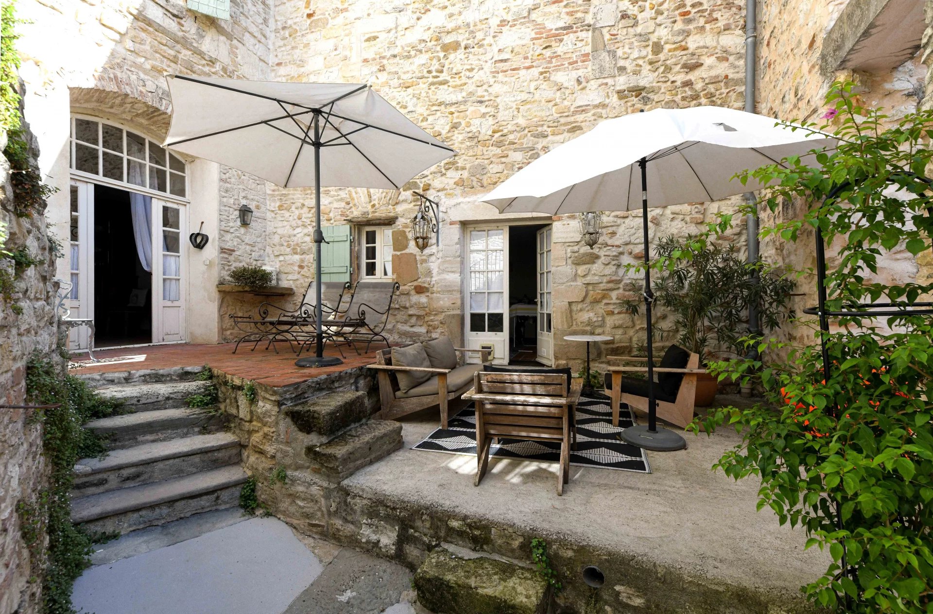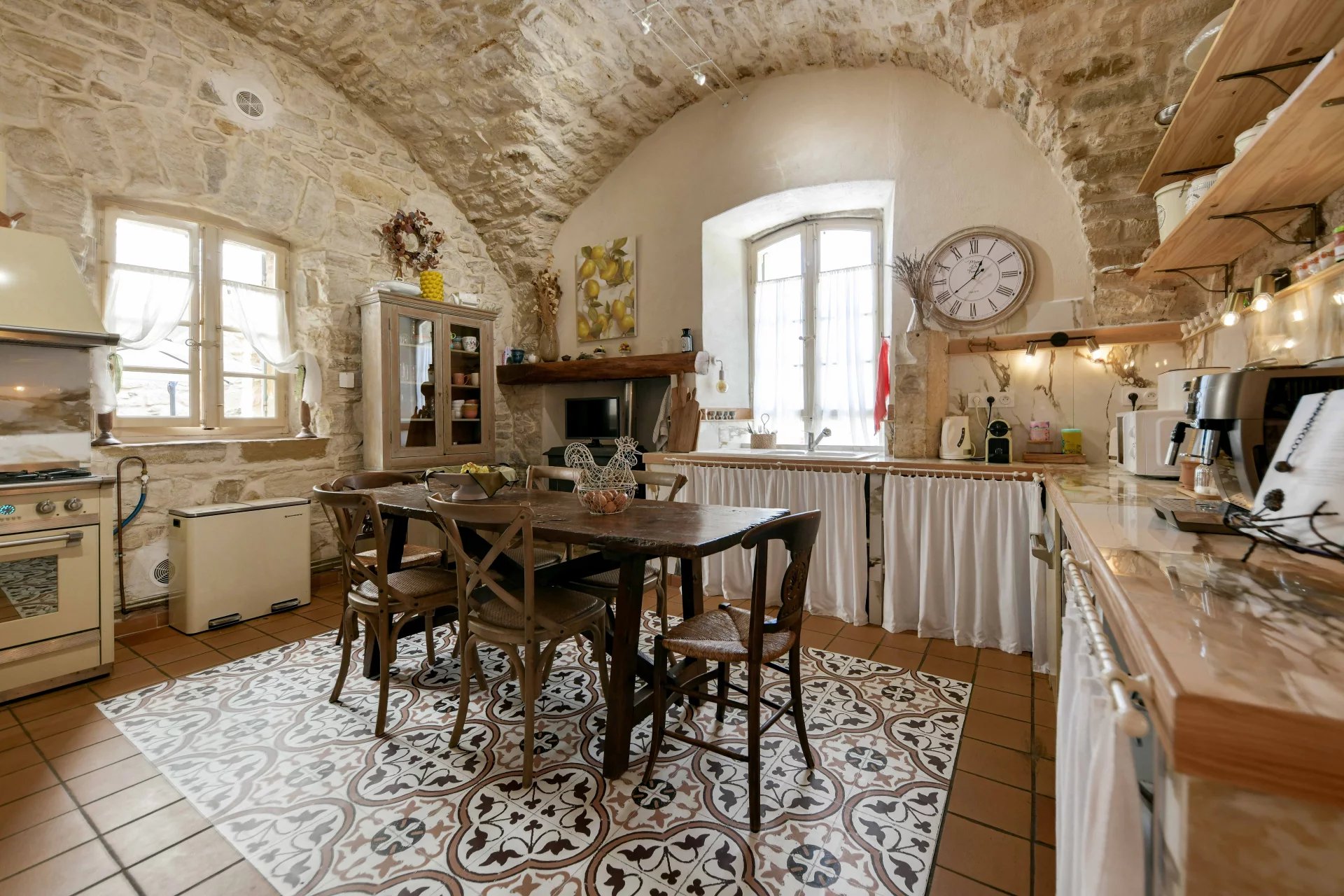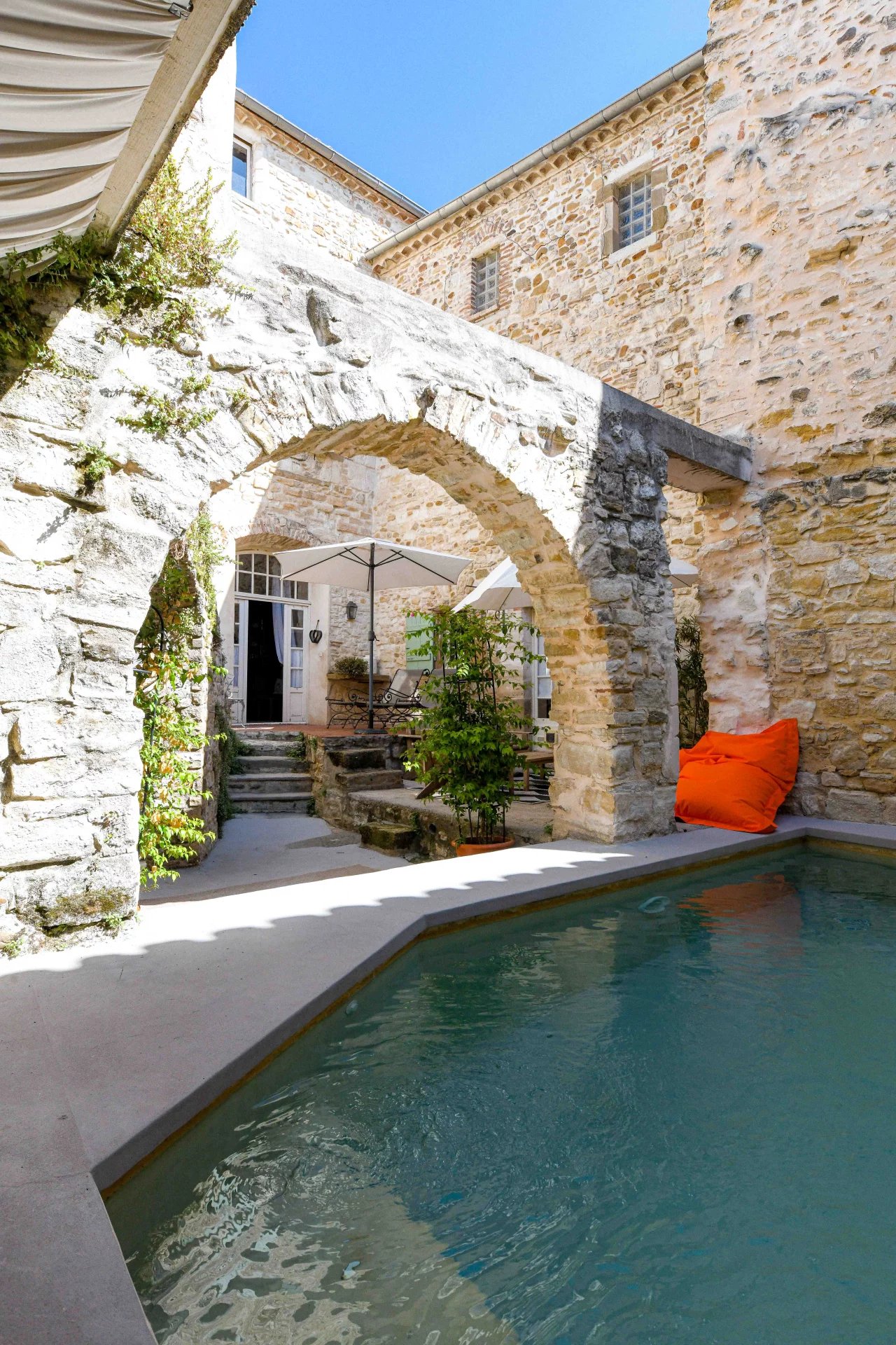Superbes éléments architecturaux, Restauration de grande qualité Salon/séjour ouvert sur cour et piscine, grande cuisine avec large cellier 4 chambres, 4 salles de bains, grenier aménageable Situation dans un authentique village à 18 kms d’Uzès et 20 min de Nîmes