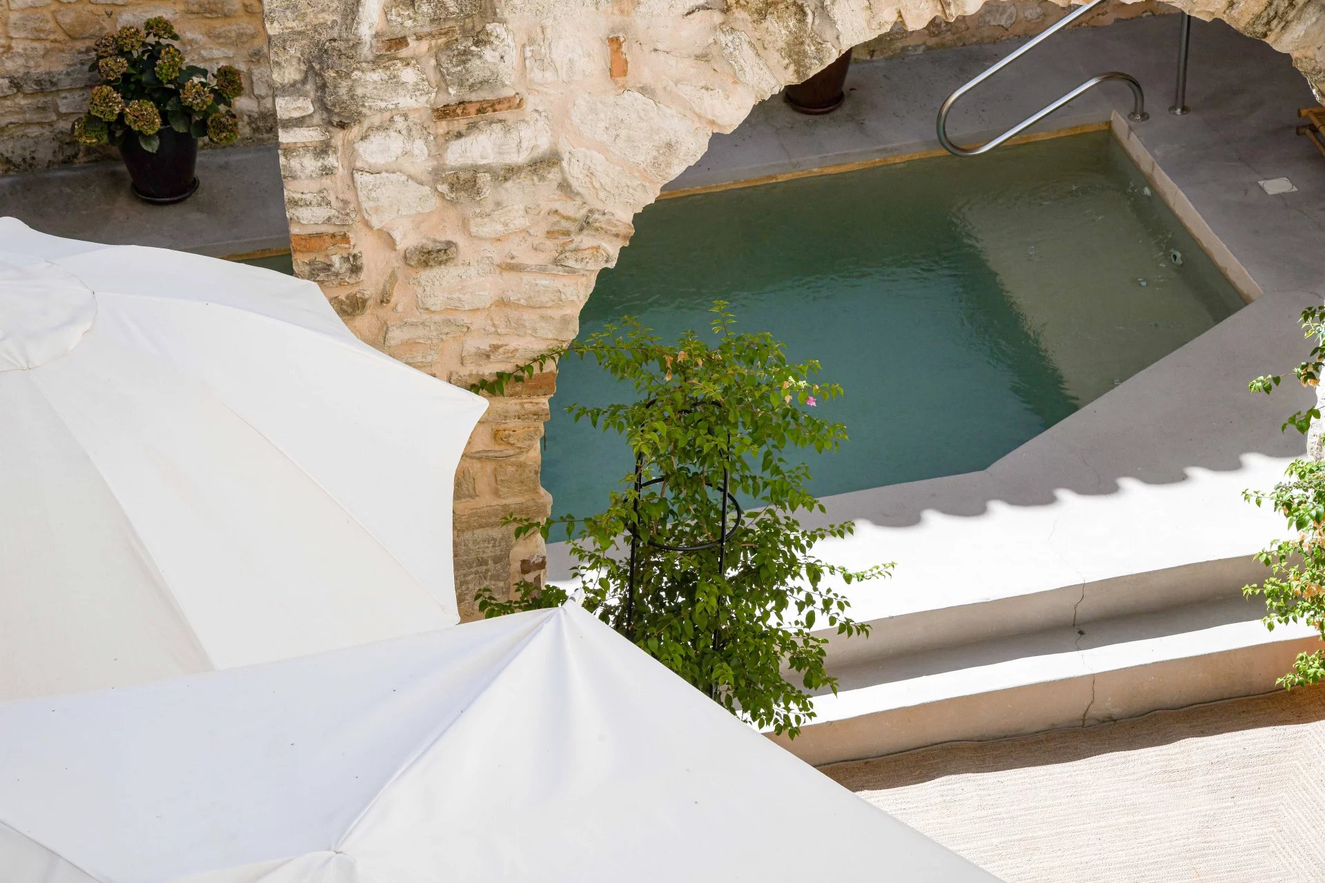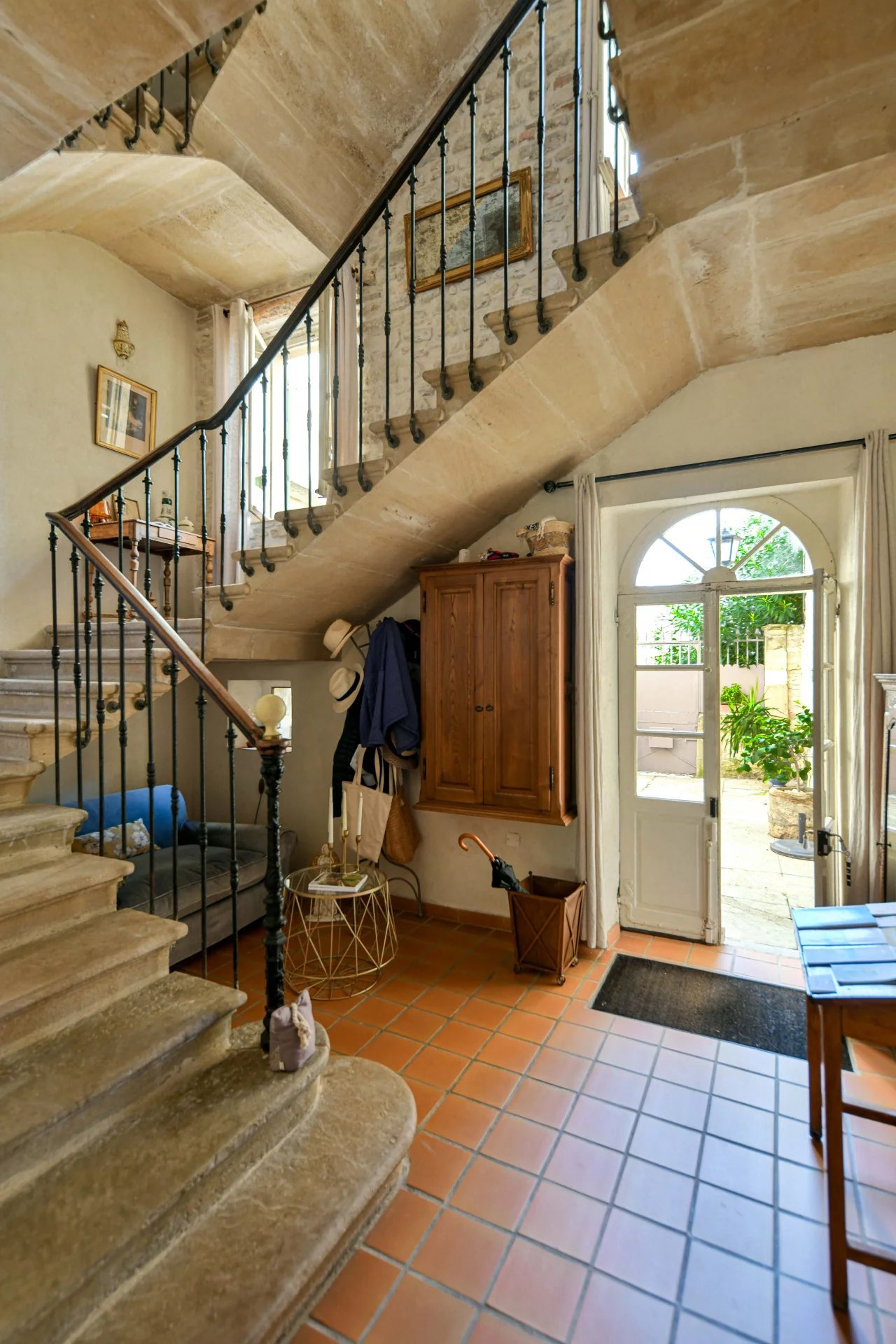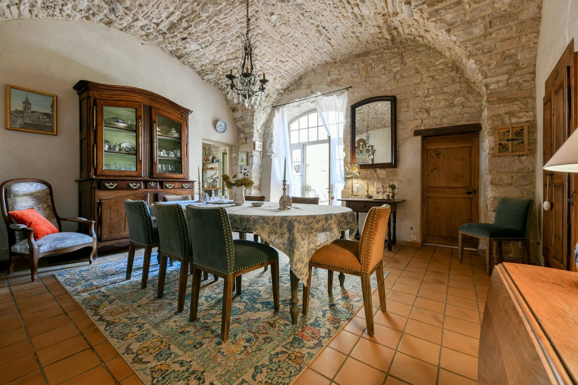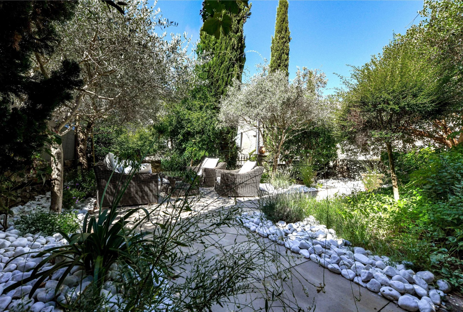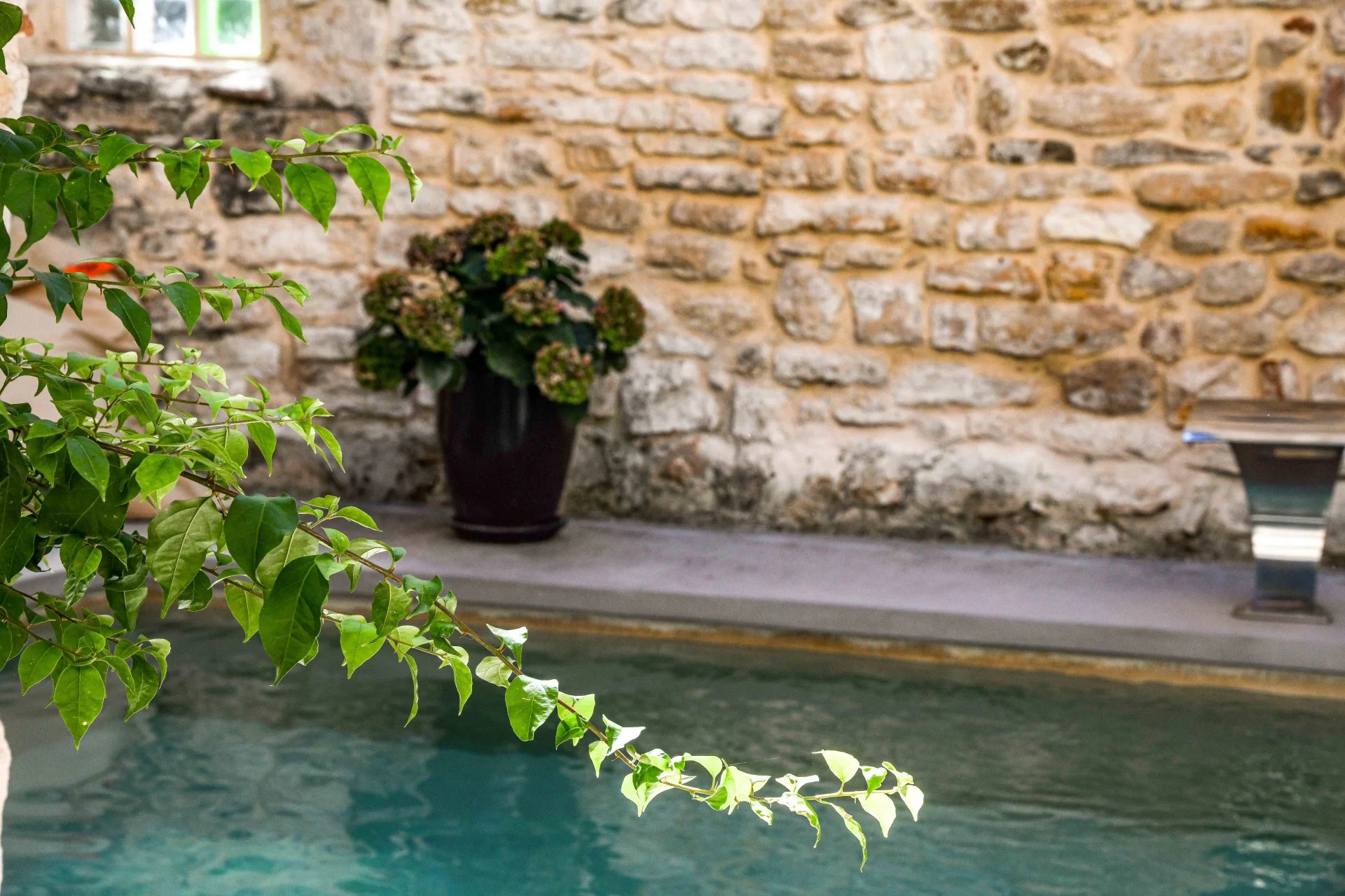 Superbes éléments architecturaux, Restauration de grande qualité Salon/séjour ouvert sur cour et piscine, grande cuisine avec large cellier 4 chambres, 4 salles de bains, grenier aménageable Situation dans un authentique village à 18 kms d’Uzès et 20 min de Nîmes