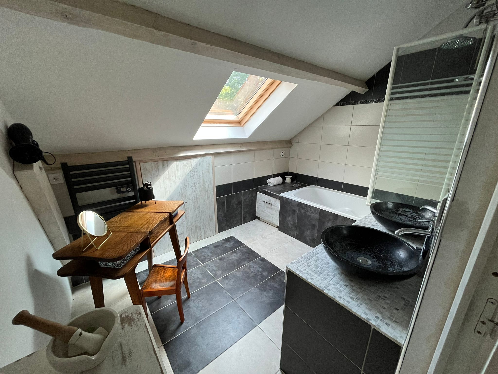 Au rdc , une ancienne cuisine mais fonctionnelle, une pièce de vie lumineuse et spacieuse donnant sur deux terrasses .