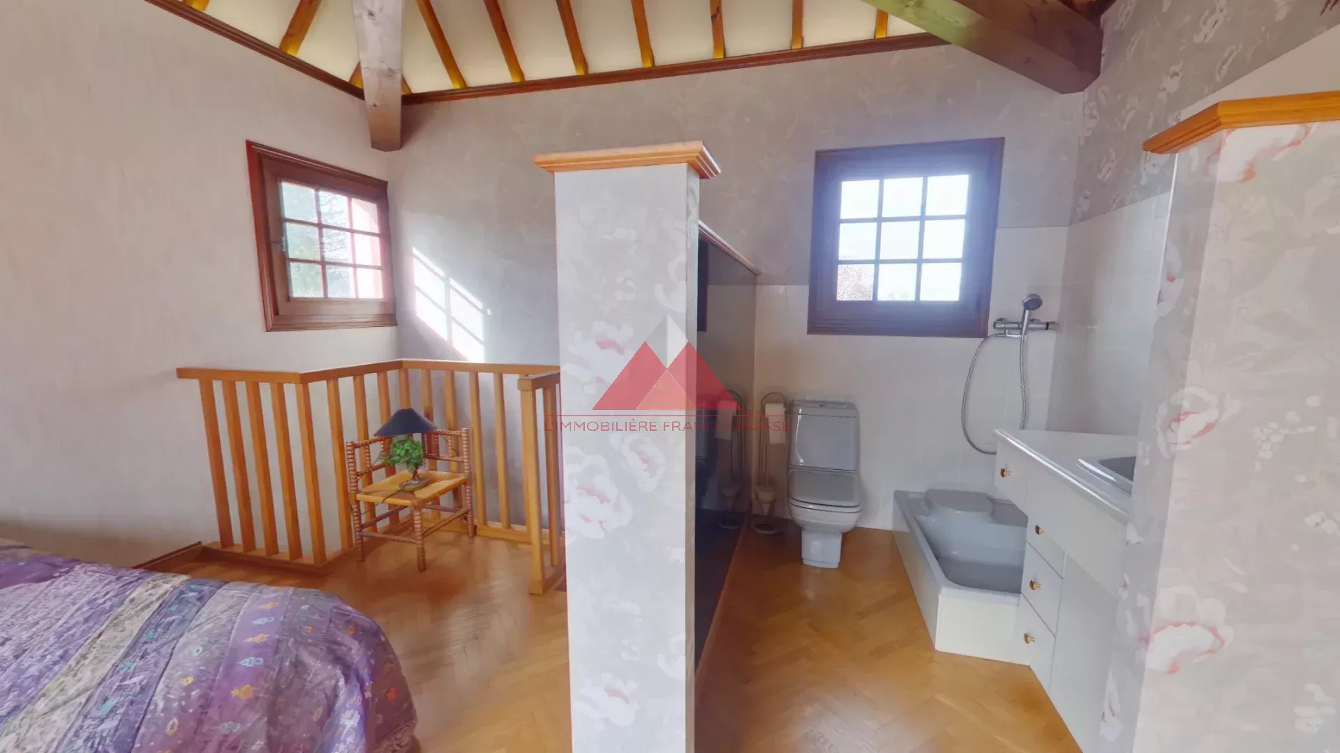 Au premier étage, une mezzanine, 4 chambres dont deux chambres parentales (une avec douche, WC et terrasse privative et une avec baignoire balnéo et WC) et un grenier.
