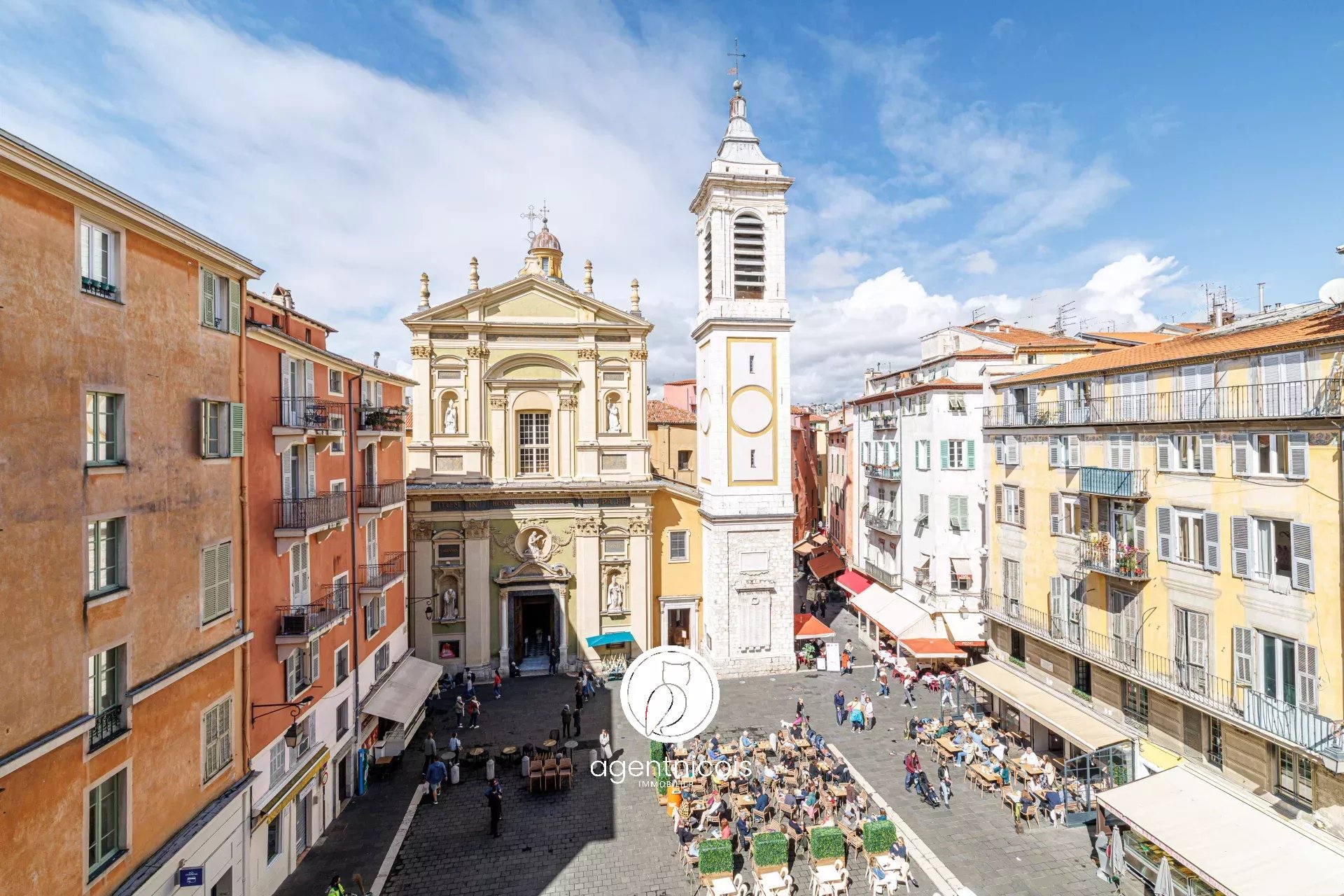 Un séjour/cuisine bénéficiant d’une vue sur la place Rossetti et la Cathédrale Sainte-Réparate de Nice.