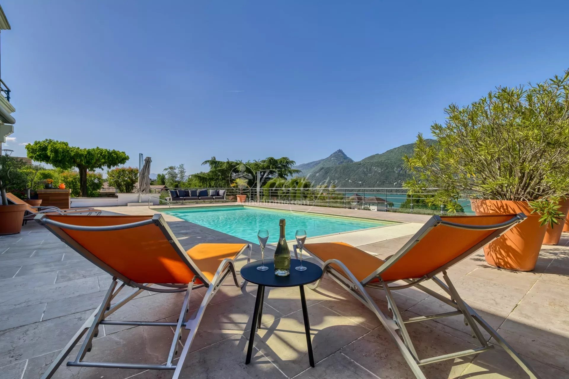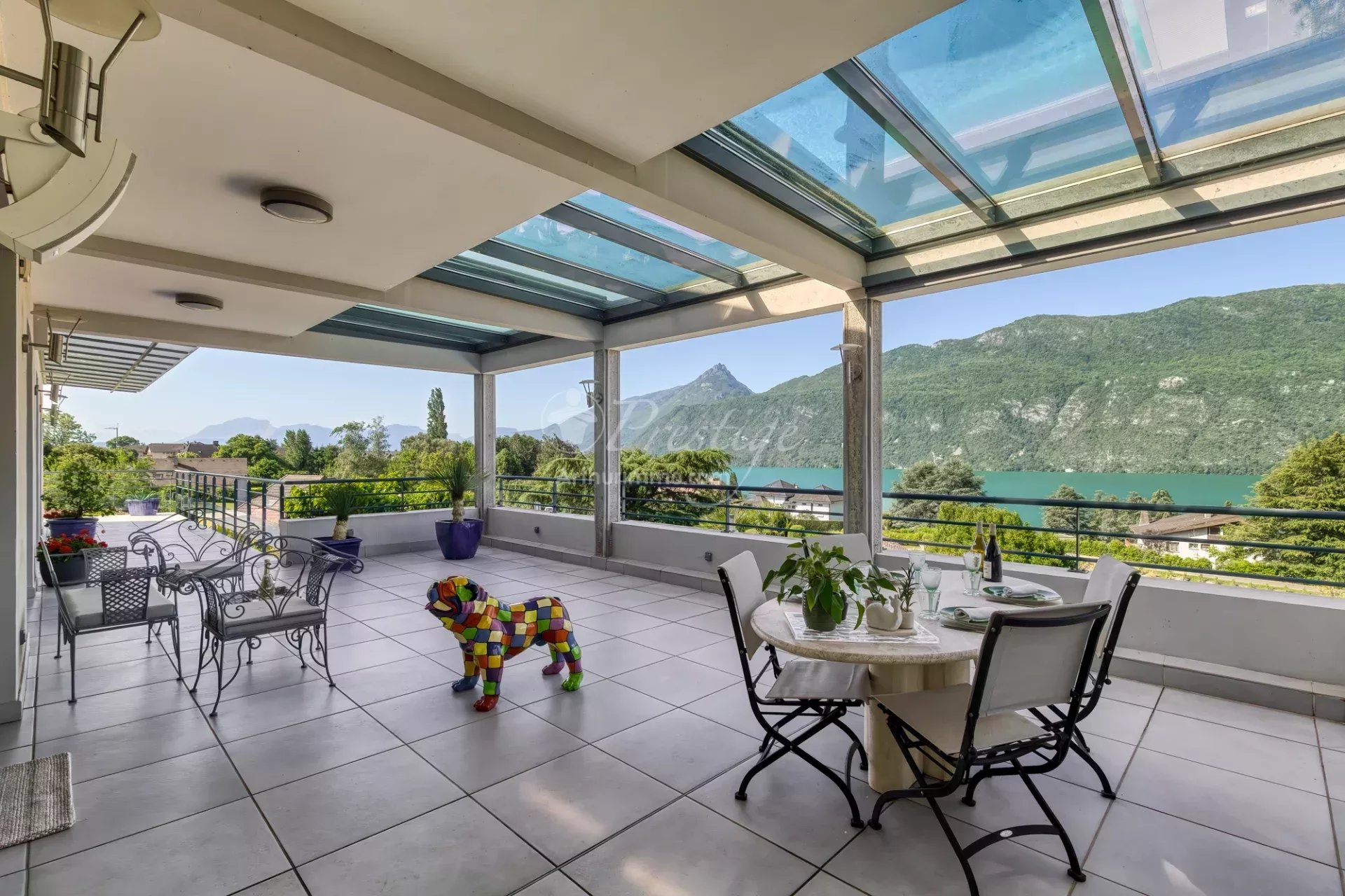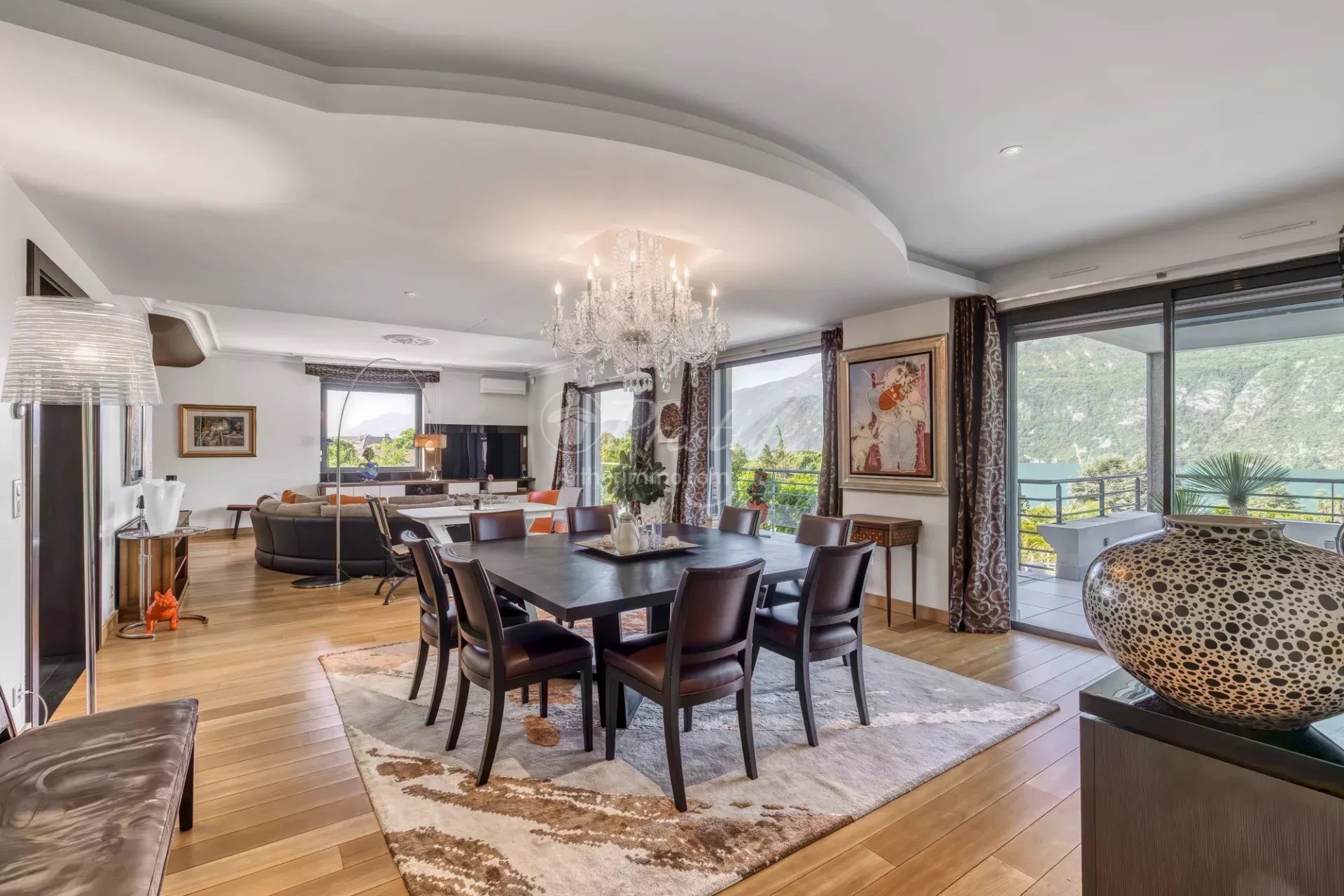 C'est dans une ambiance raffinée que vous vous dirigerez sans attendre vers la somptueuse pièce de vie (90m²). La vue sur le lac est imprenable, panoramique du Bourget-du-lac à l'Abbaye de Hautecombe , que l'on soit installé au salon, assis près de la bibliothèque ou déjeunant à table. La cuisine, élégamment aménagée et équipée, offre un espace de vie à part entière, qui se prolonge vers la une immense terrasse dès les premiers rayons de soleil.