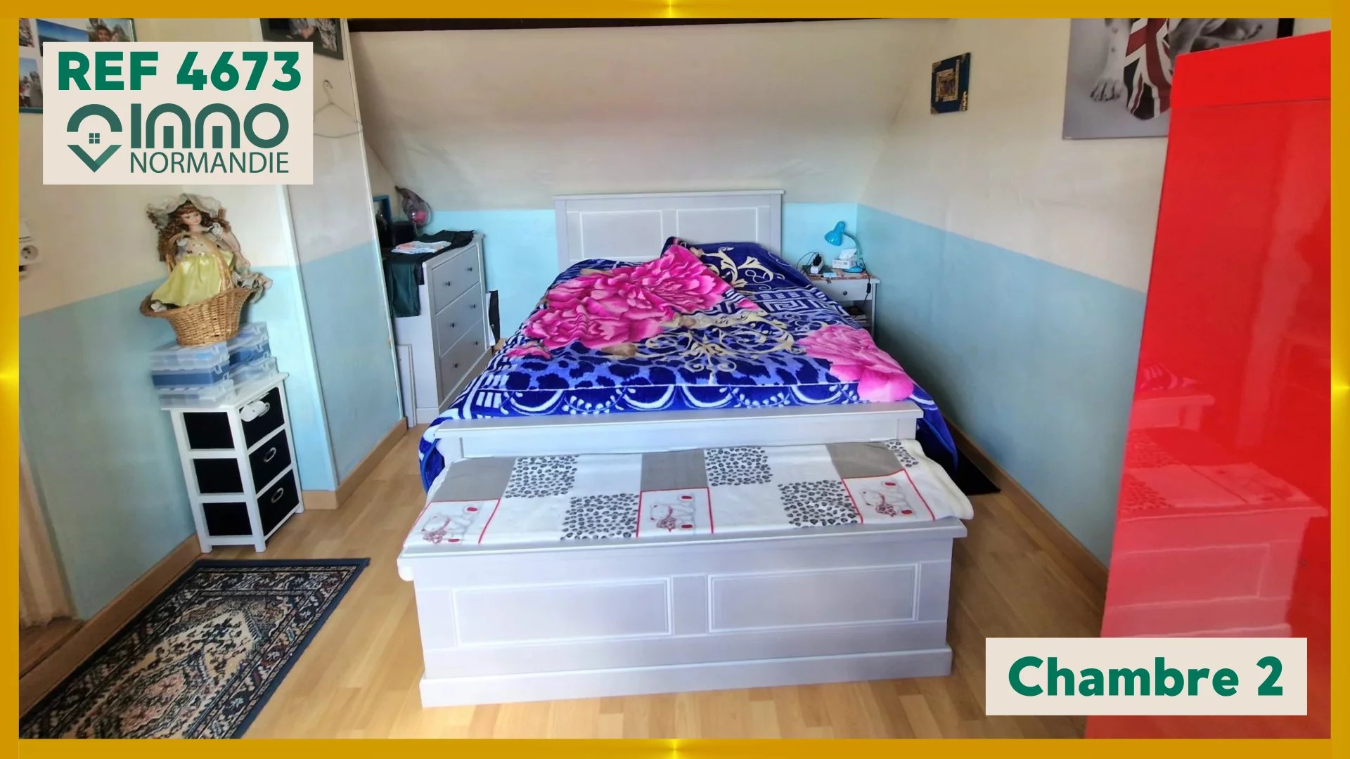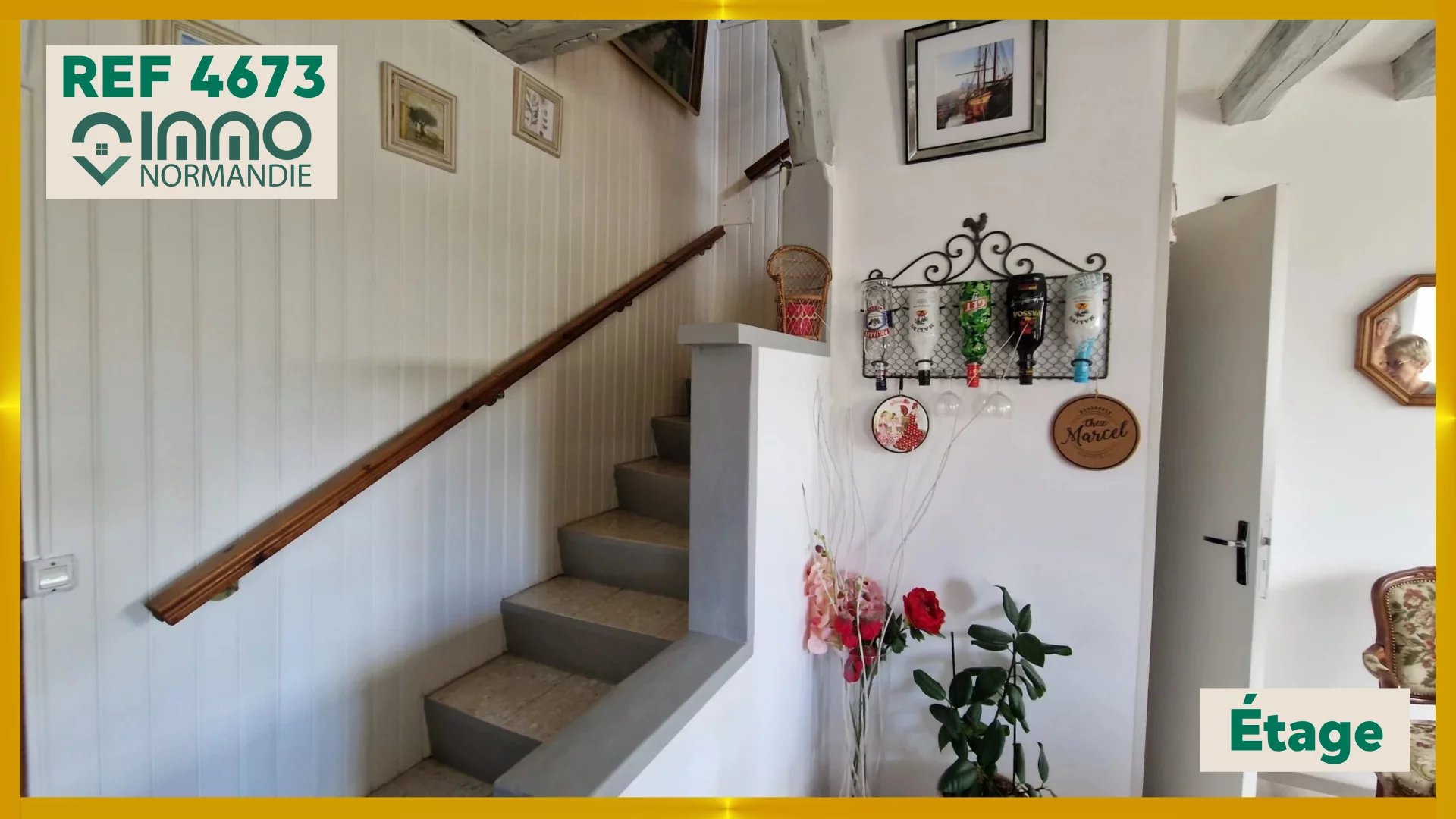 À l’étage : un bureau desservant deux chambres, salle de bains et WC.
