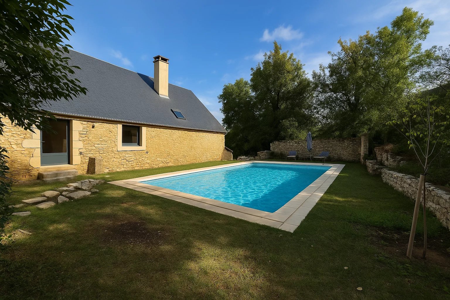 A l’orée des bois, dans le calme absolu d’une impasse du hameau médiéval de l’Abbaye-Nouvelle, Cette propriété domine les vestiges tout aussi remarquables qu’impressionnants de l’Abbaye cistercienne du XIII. Située sur un terrain clos et sans vis à vis, cette ancienne grange en pierre d’environ 180m2 habitables, a bénéficié en 2023 d’une rénovation complète de qualité, alliant parfaitement moderne et charme du traditionnel. La maison se compose de deux niveaux habitables et offre en complément des combles aménageables (environ 50 m² supplémentaires potentiels). Rez-de-chaussée : - Séjour lumineux et convivial, avec belle hauteur sous plafond et poêle à bois installé dans l'ancienne cheminée. - Cuisine entièrement équipée, prolongée par une arrière-cuisine et une cave. - Suite parentale avec salle de bains et WC indépendant. Rez-de-jardin : - Cinq chambres. - Salle de bains avec WC. - WC indépendants. # L’étage se prête parfaitement à l’aménagement d’un gîte indépendant : accès séparé, espace extérieur privatif, et possibilité de transformer la grande chambre d’environ 23 m² en séjour avec cuisine, les réseaux d’eau et évacuation étant déjà en place à proximité. Prestations et rénovation : - Toiture en ardoise entièrement refaite avec isolation. - Menuiseries aluminium double vitrage. - Électricité et chauffage rénovés. - Cuisine équipée. - Fibre optique Etc... Extérieurs : Piscine enterrée de 11x6 Jardin clos et arboré, facile d’entretien. Seconde parcelle attenante, idéale pour potager, stationnement ou espace de loisirs, sans empiéter sur l’espace de vie principal. Sentiers de randonnée accessibles directement depuis la propriété. Le cadre de vie est exceptionnel : aux beaux jours, vous profiterez de dîners dans le jardin face aux vestiges illuminés de l’abbaye, une véritable carte postale. Conclusion : Ce bien réunit des atouts rares : une bâtisse de caractère rénovée avec soin, un espace de vie de plain-pied, cinq chambres permettant d’accueillir famille et amis, et la possibilité d’aménager un gîte indépendant. Son emplacement privilégié, au cœur de ce que l’on appelle communément le triangle d’or (Sarlat, Rocamadour, Gouffre de Padirac, Saint-Cirq-Lapopie, châteaux de la vallée de la Dordogne et du Lot), en fait une propriété aussi séduisante pour une résidence principale que secondaire. Visite Virtuelle sur demande !!!