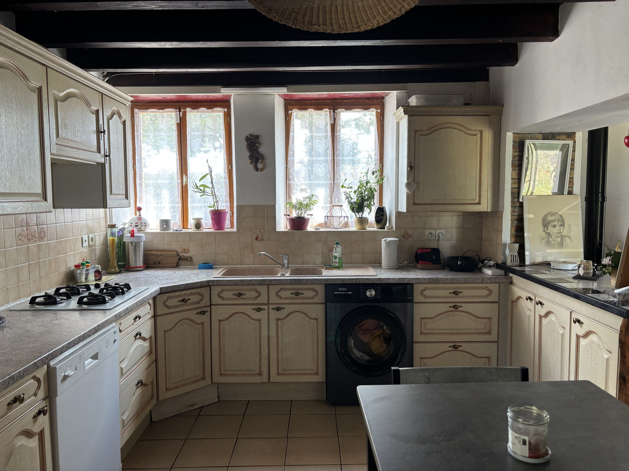 La cuisine semi-ouverte est reliée à la salle à manger et équipée d'une cuisinière à gaz, d'un four, de branchements pour lave-vaisselle et lave-linge. Elle présente également un plafond avec poutres apparentes et un détail authentique d'un ancien four à pain. Quelques marches plus bas, vous trouverez l'arrière-cuisine. Depuis la cuisine, des portes-fenêtres donnent accès à une terrasse couverte sur le côté de la maison.