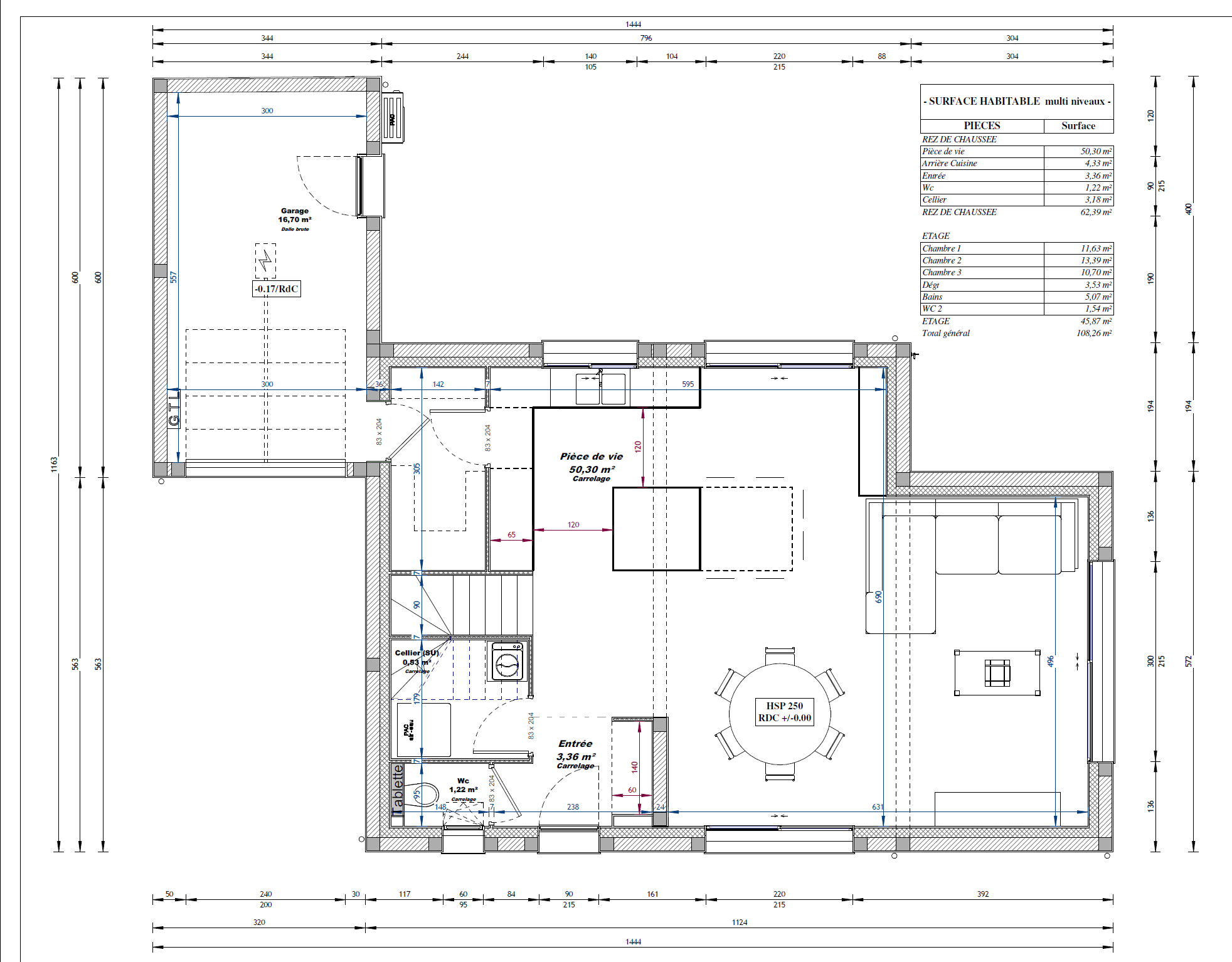 Prestations de qualité: Carrelage 60 x 60 pièce de vie, sanitaires équipés, débords PVC, zinguerie aluminium, chauffage au sol toute surface par pompe à chaleur, tuiles terre cuite, escalier béton carrelé, menuiseries PVC anthracite double vitrage, volets roulants électriques.