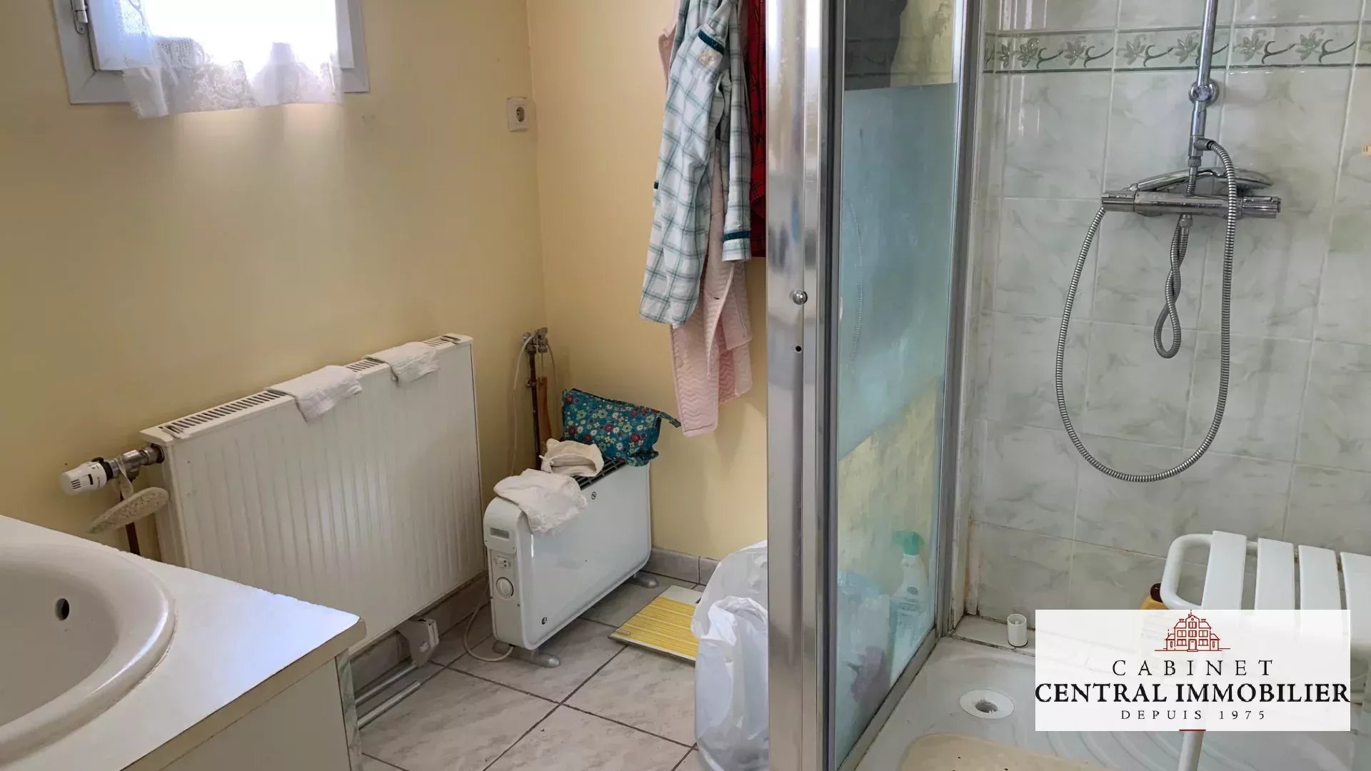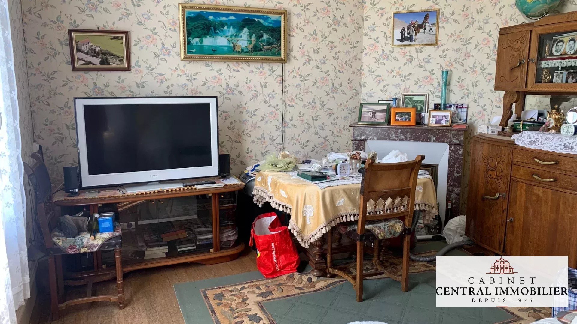 Maison comprenant : entrée sol carreaux de ciment, cuisine aménagée de 13.04m² sol carreaux de ciment, salon de 13.27m² parqueté avec une cheminée décorative, chambre de 12.58m² parquetée, salle d'eau de 4.40m² carrelée, WC. À l'étage : palier, 2 chambres de 13.13m² et 13.08m² parquetées dont une avec avec placards. Cave avec chaufferie, atelier et un accès au jardin. Double vitrage/PVC. Chauffage central gaz de ville. 2 remises en dur dont une avec espace buanderie. Garage avec porte motorisée. Portail motorisé. Tout à l'égout. Terrain clos de 600m² avec arbres fruitiers.