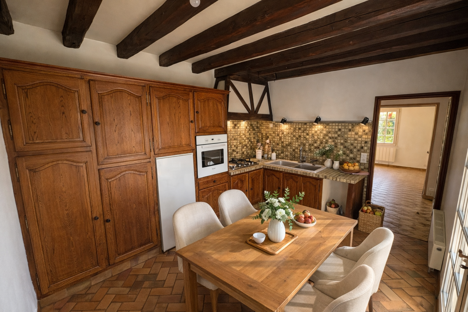 Au Rez-de-chaussée : Hall d'entrée, Cuisine aménagée, Salon avec cheminée en pierre, Salle à manger, 3 chambres, Salle de bains, WC indépendant.