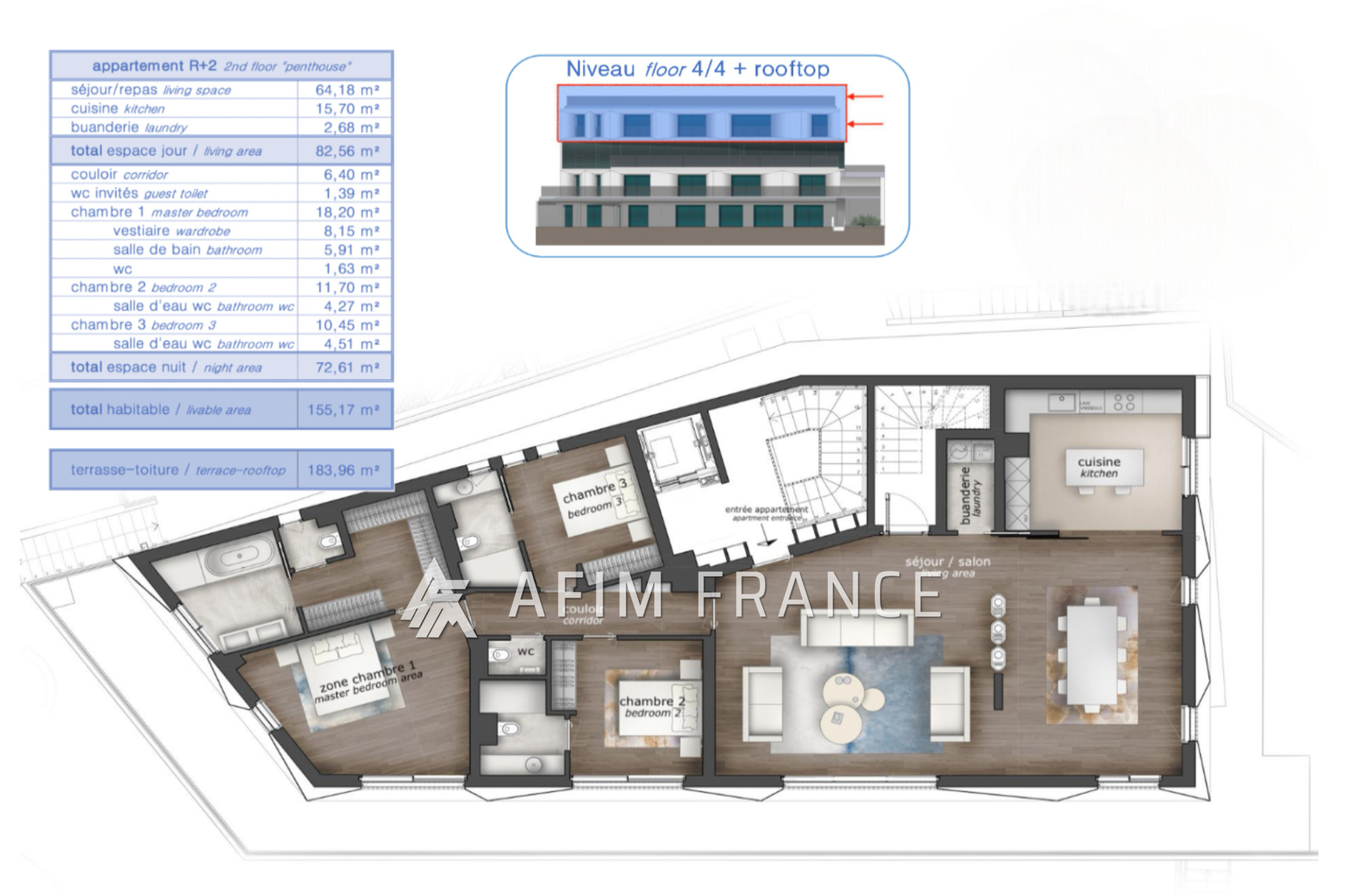 Un grand et lumineux séjour, ouvert sur la salle à manger ainsi que sur une cuisine haut de gamme, entièrement équipée. L'appartement est doté de 3 chambres spacieuses avec chacune sa salle d'eau pour assurer votre confort. Grand toit-terrasse privatif avec jacuzzi, vue mer panoramique à couper le souffle. Une buanderie, 1 parking et une cave. Possibilité de parkings supplémentaires. Frais de notaire réduits.