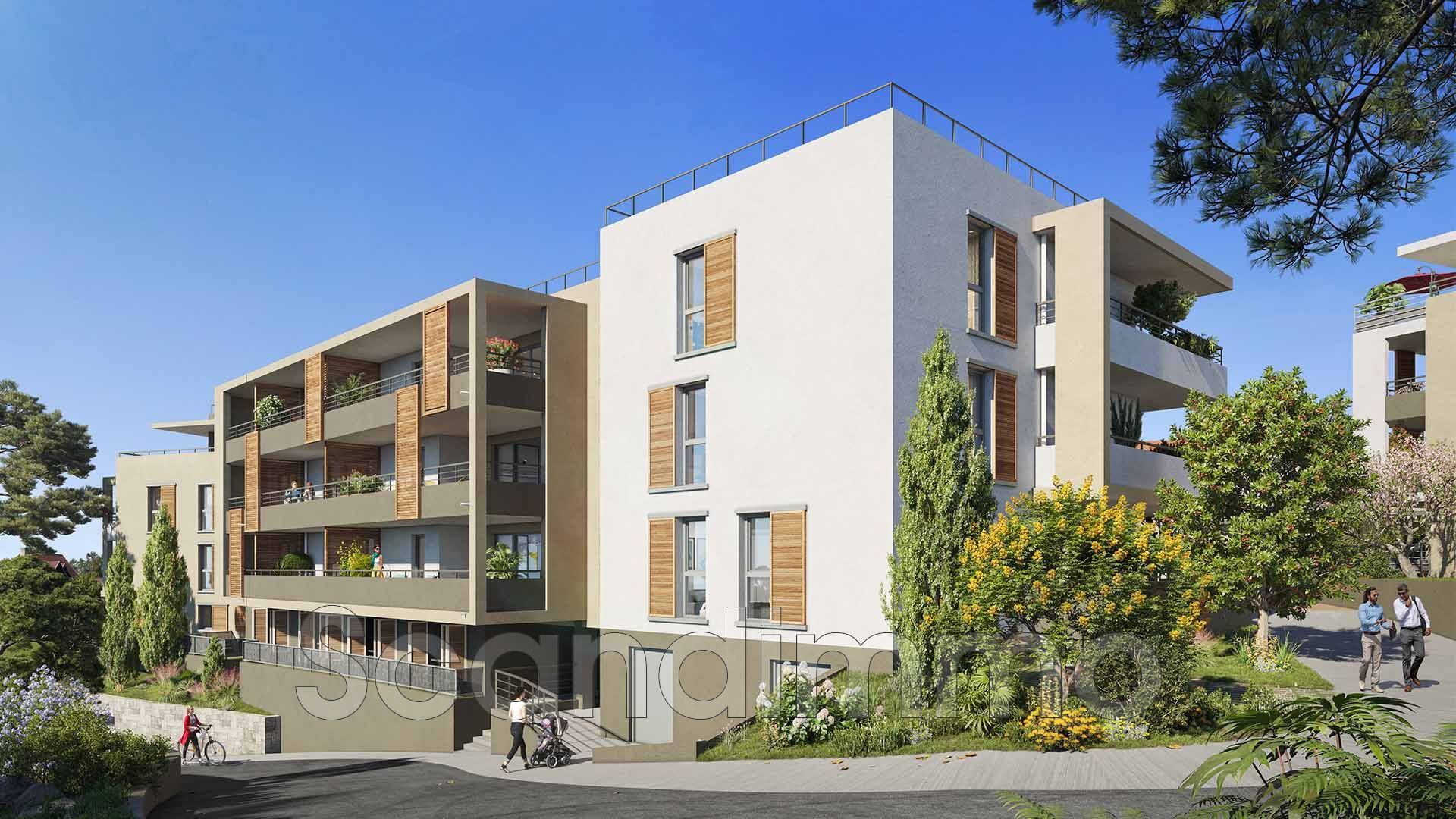 La résidence, élégante et contemporaine, offre de généreux espaces extérieurs : terrasses spacieuses, piscine privée et un cadre verdoyant avec un espace boisé classé.