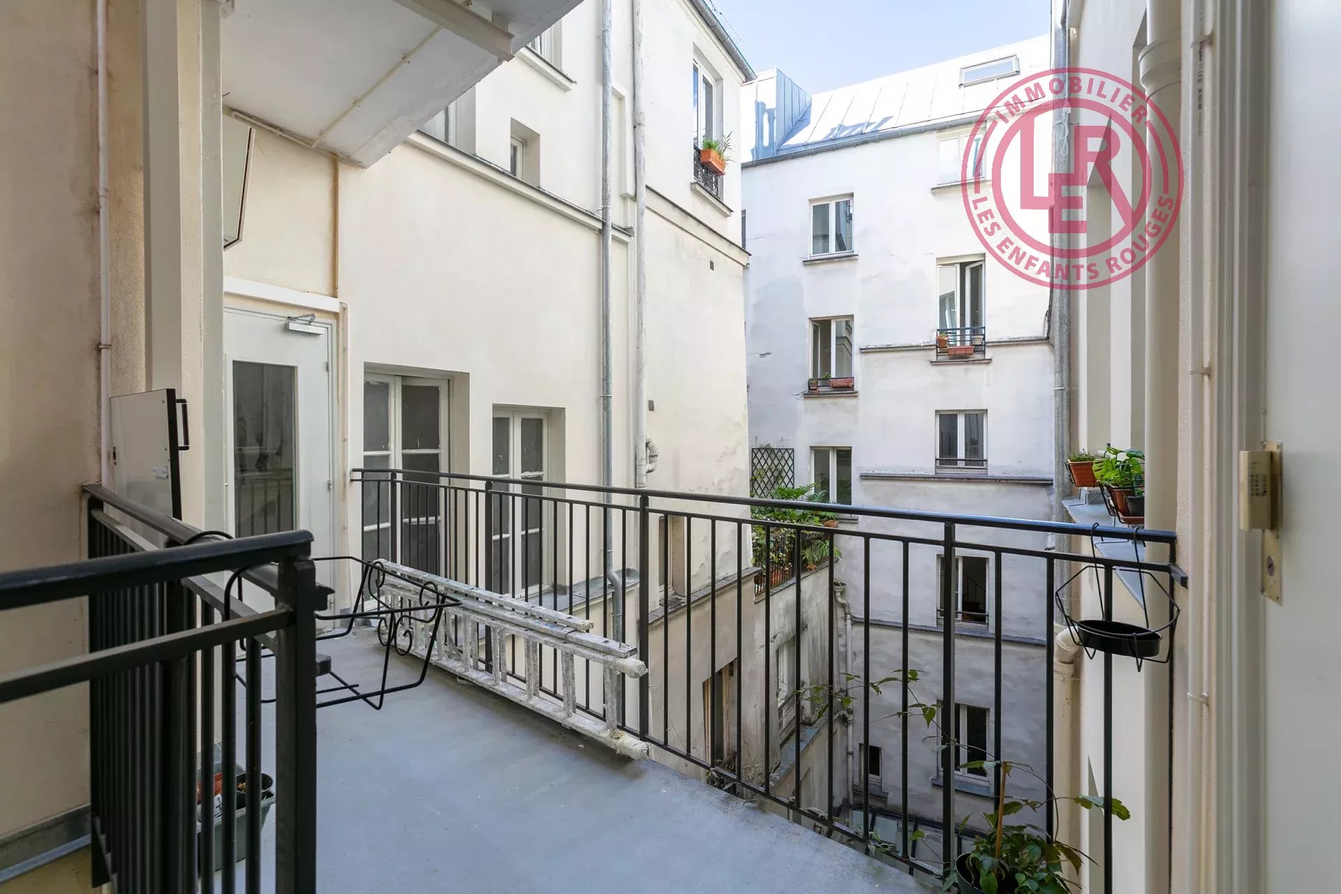 La pièce de vie, baignée de lumière grâce à deux grandes fenêtres (2,50 m de haut, double vitrage), donne sur une jolie cour intérieure dégagée, sans vis-à-vis. Elle se compose d’un salon, d’une salle à manger et d’une cuisine ouverte parfaitement aménagée.