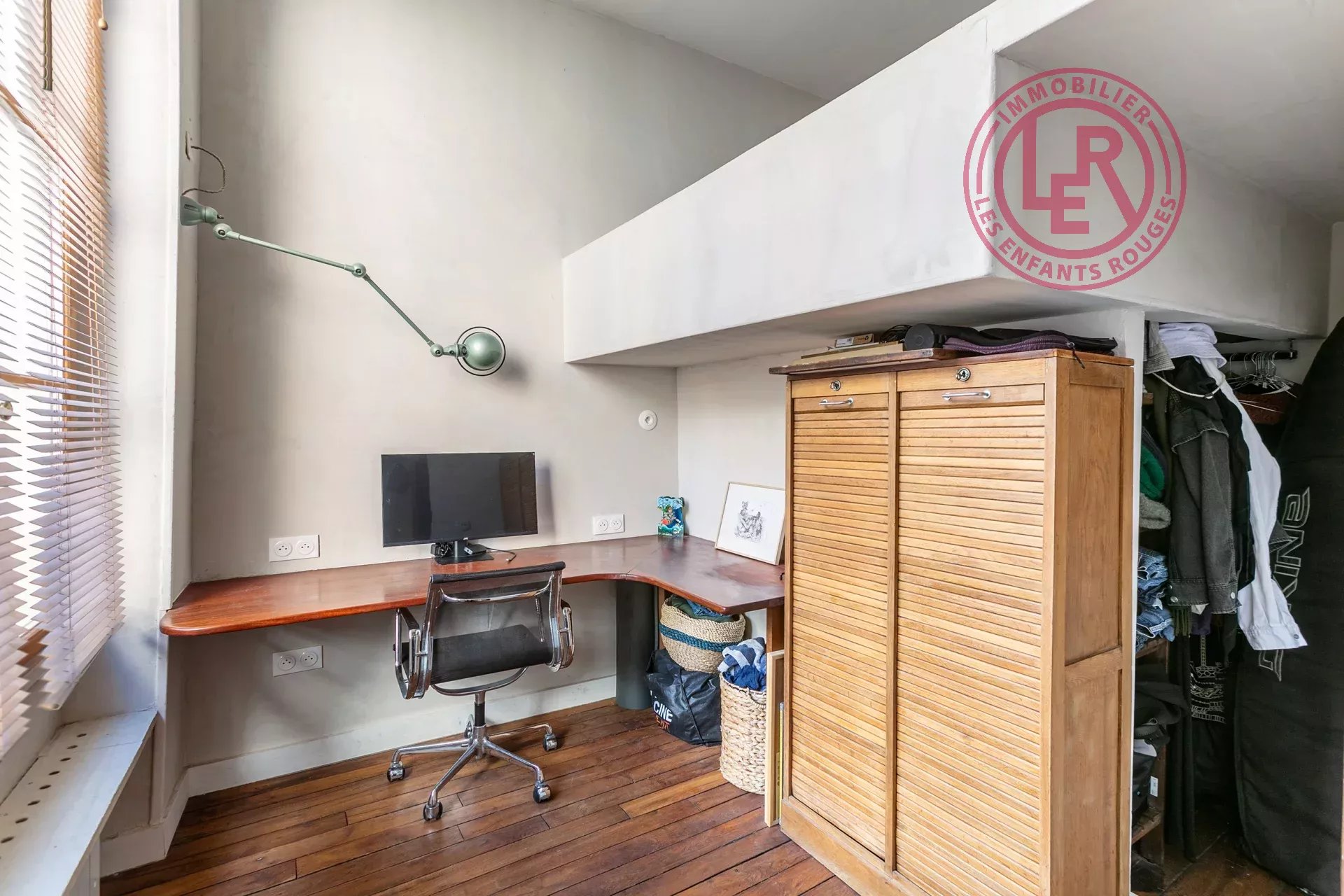 L’espace nuit, astucieusement pensé, comprend un bureau, un dressing et une chambre en mezzanine (à 1,78 m du sol et 1,70 m du plafond – non comptabilisée dans la surface Carrez).